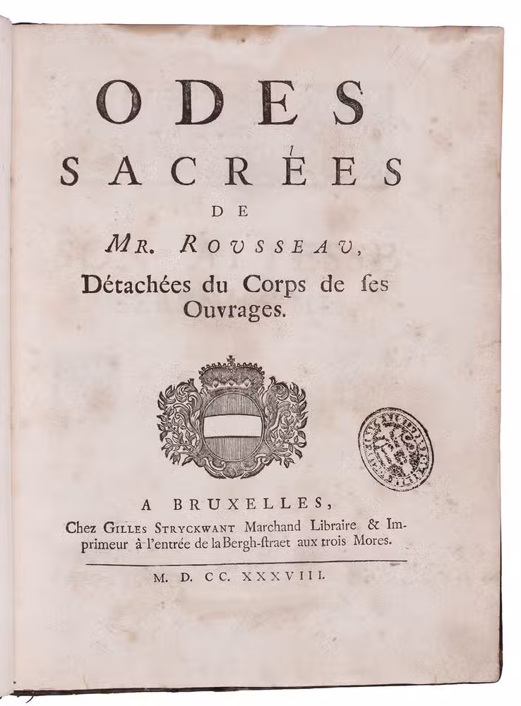 First edition of a collection of sacred songs in verse selected from his own works by Jean Baptiste Rousseau (1671-1741), most of them based on psalms and a few on other biblical texts. Born in Paris, Rousseau published his Cantates françoises around 1705 and established a good reputation for his lyrics. His lampoons and some obscene verses supposedly written by him occasionally got him into trouble, but he had a promising career ahead of him when he published his Oeuvres in 1712. In that year, however, a dispute over offensive verses supposedly written by him forced him into exile in Brussels. He lived there and elsewhere abroad for the rest of his life, sometimes publishing selections of his work, such as the present one, and returning to Paris only for a clandestine visit around the time he published the present collection. Although his poetry appears to have sold fairly well and his lyrics continued in demand with musicians, he remained in financial straits, his exile perhaps making it difficult to gain the patronage essential to success in that day. Rousseau gained greater fame posthumously, especially as the creator of the "French cantate" and is still considered the best French lyricist of the period.
