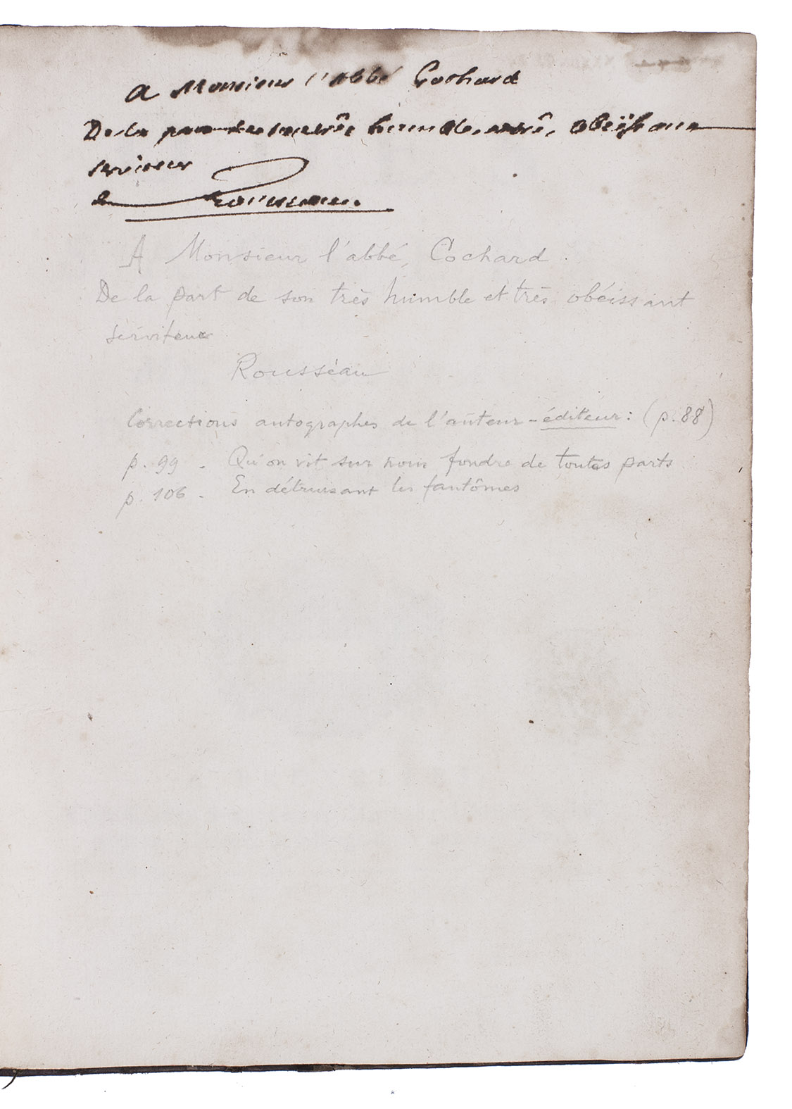 With the author's signed autograph presentation inscription to l'Abbé Cochard on an endleaf and a couple corrections in the text, also in his hand. With one quire slightly browned and further occasional minor foxing or a small marginal stain, but otherwise in very good condition and with generous margins. The chemicals used to mottle the leather have eaten away its surface in places and the spine has been repaired at the head, foot and hinges, but the binding is now structurally sound. H.A. Grubbs, Jean-Baptiste Rousseau: his life and works, p. 226; not in Cioranescu; Tchemerzine.