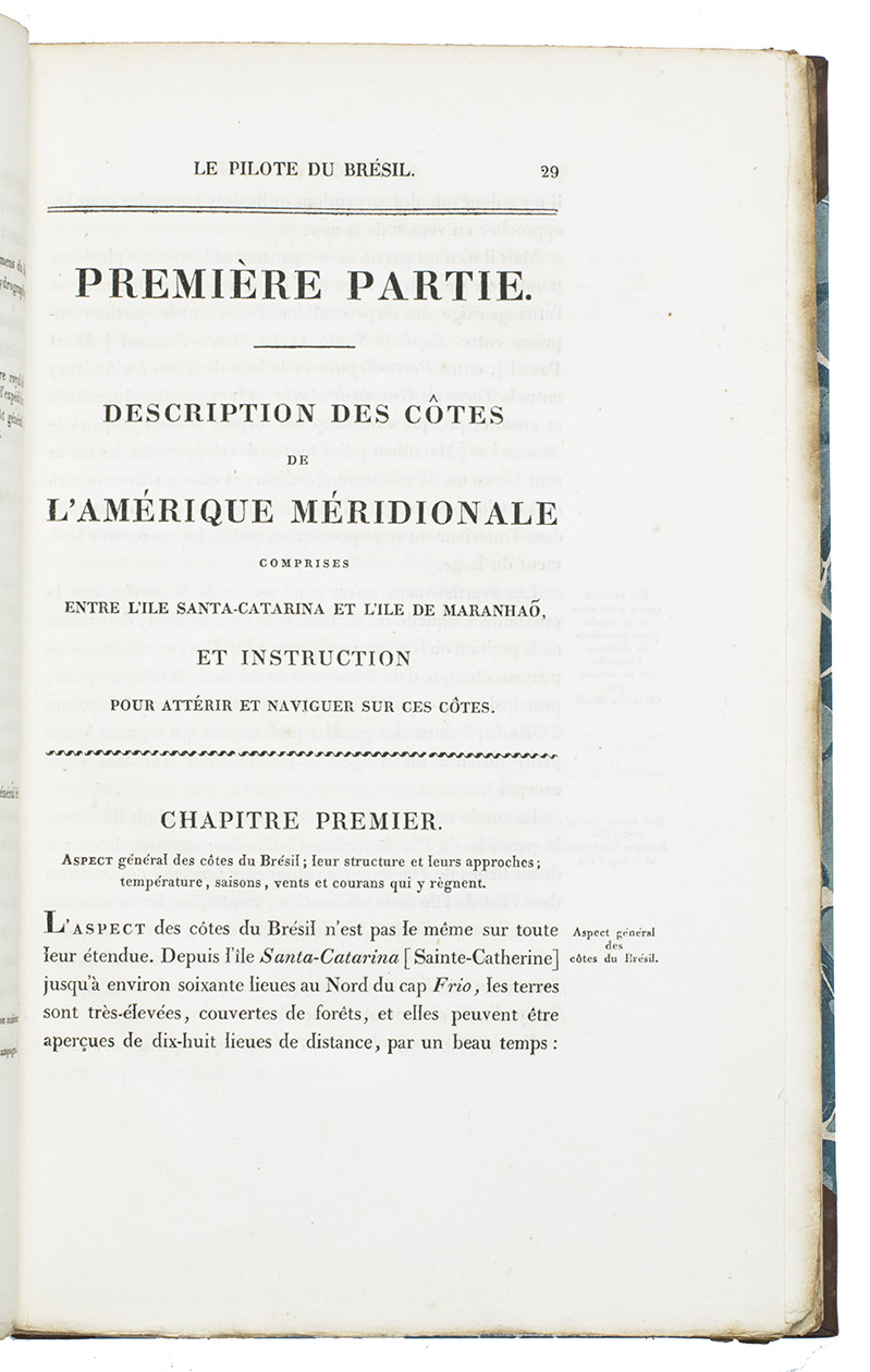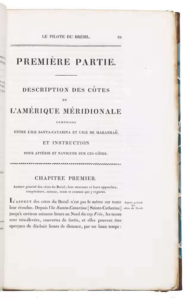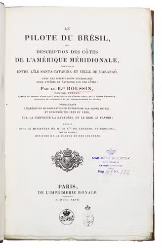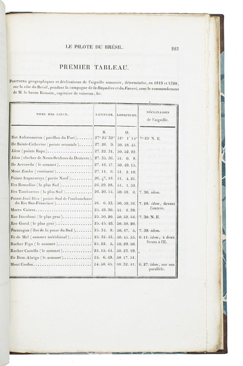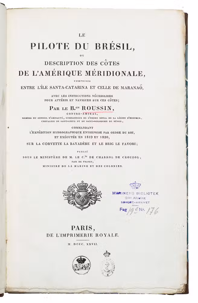 First octavo edition (a second appeared at Paris in 1845). Shortly before the present first octavo edition a folio edition appeared with a second volume with plates, which is extremely rare. An edition in Portuguese was published in Rio de Janeiro 1834. Albin Roussin (1781-1854), a renowned French naval commander and navigator, undertook several marine surveys along the coasts of Africa and South America. He commanded the French hydrographic expedition to Brazil in 1819, and King Louis XVIII conferred the title of Baron on him for this work in 1820. When he published the present pilot guide for Brazil he had reached the rank of admiral. In 1821 the Imprimerie Royale had published his first work, also on the navigation of the Brazilian coast: Navigation aux côtes du Brésil. The present pilot guide built on that account. Roussin had not been active at sea for several years leading up to the present publication. Shortly after the publication he received an order to lead a French squadron to the Brazilian coast in 1828. No doubt the knowledge of the Brazilian waters that he displayed in his books led to his selection. He completed his mission successfully and King Charles X awarded him an honorary post when he returned to France.