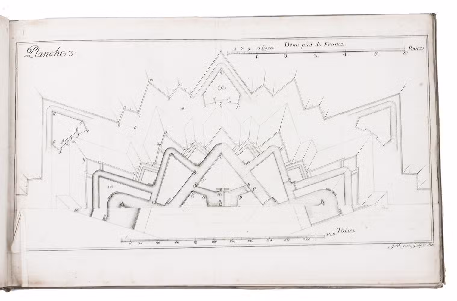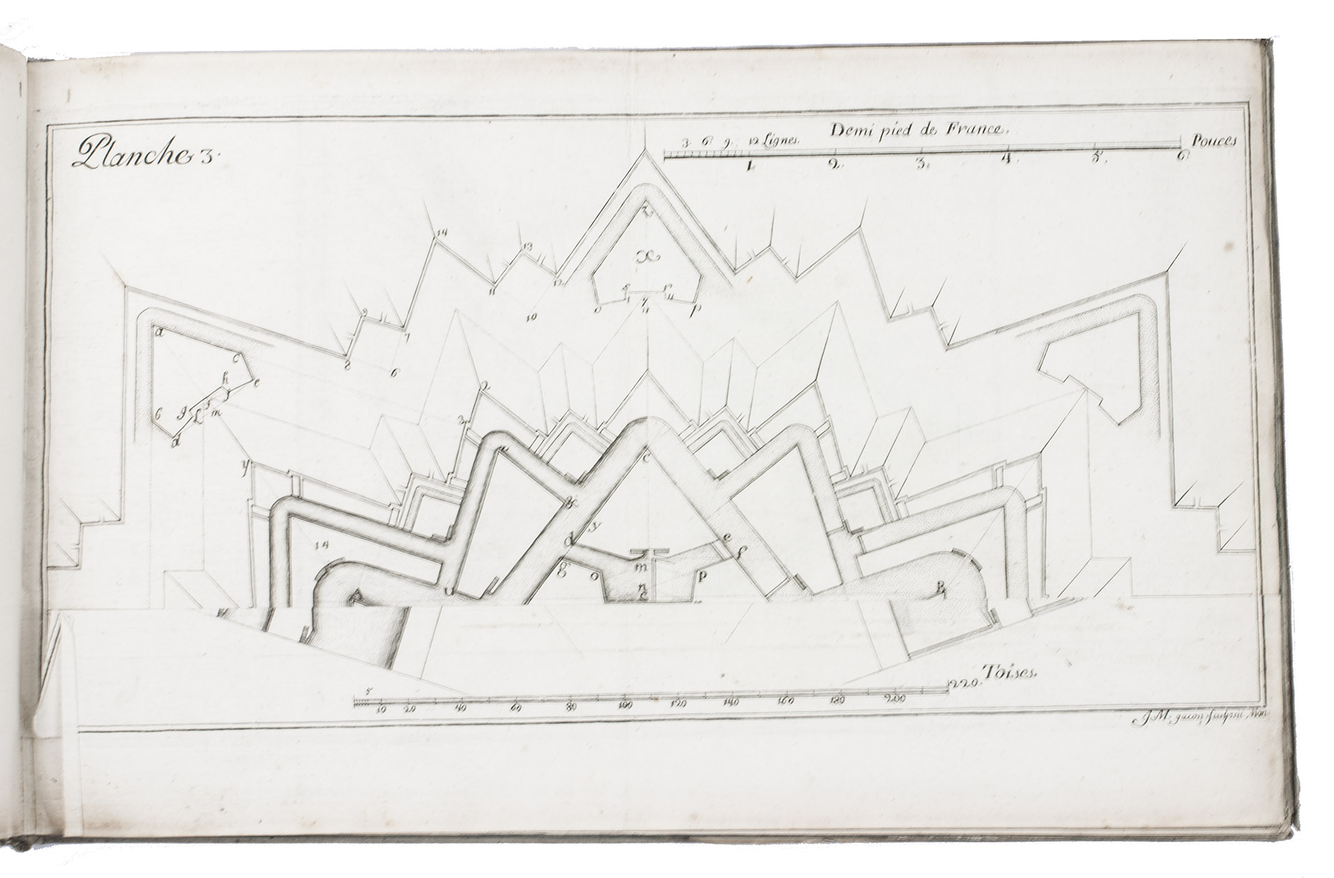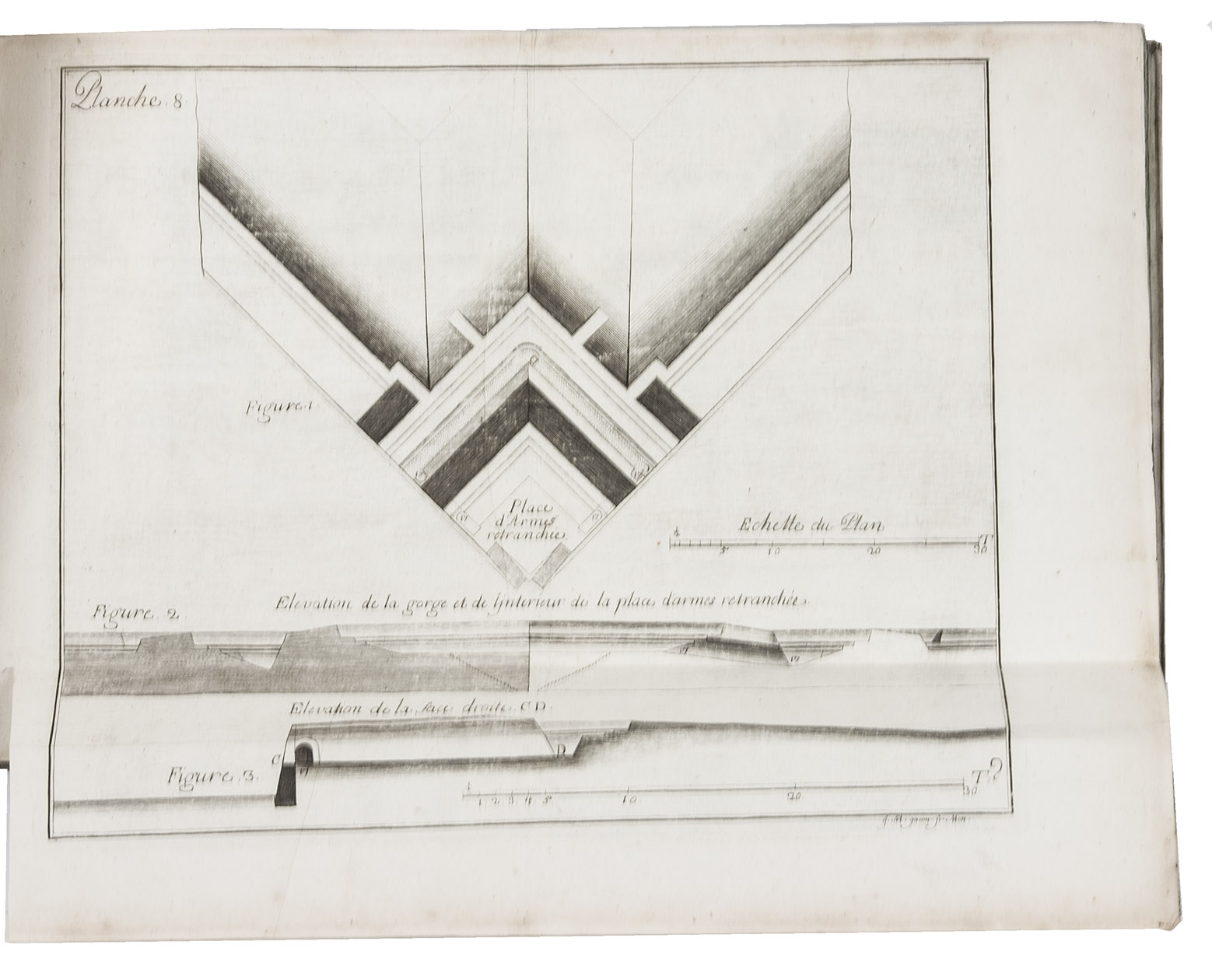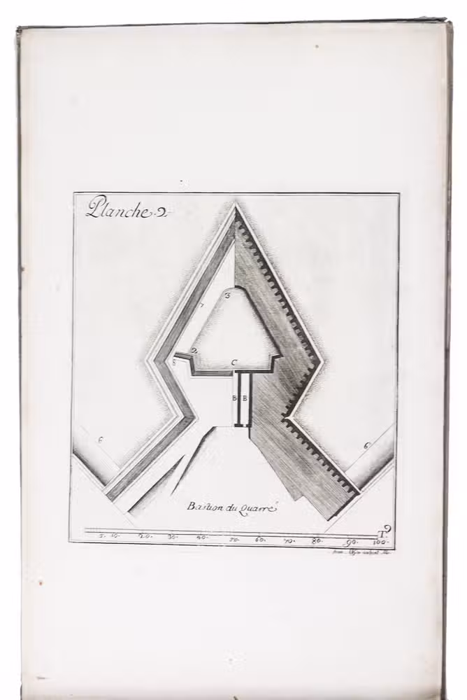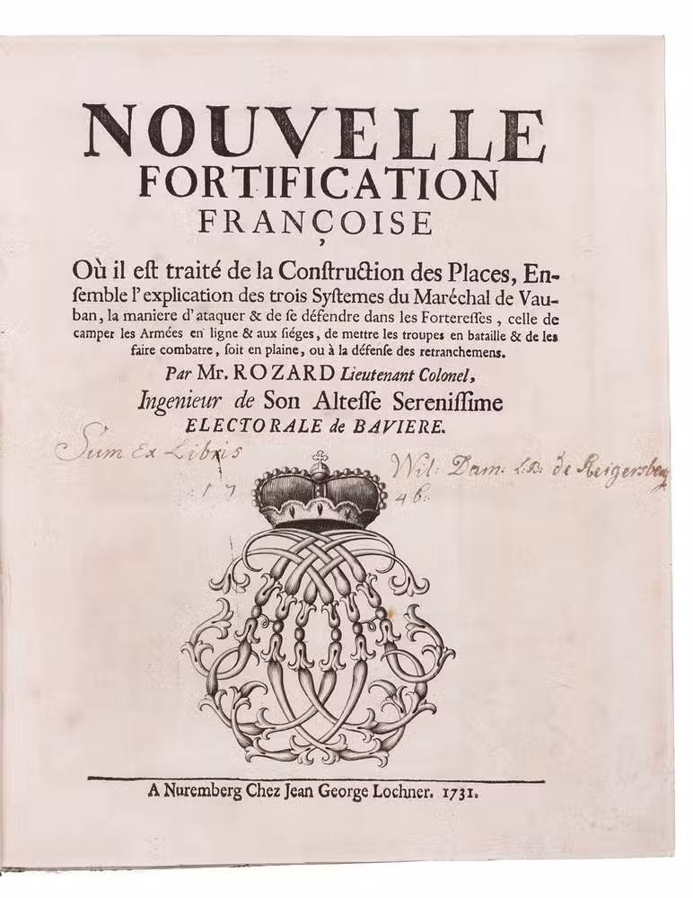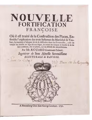 First and only edition of a work on modern French fortification by Lieutenant-Colonel Rozard. He states in his preface that, even though there are many books on fortification, most still present outdated methods, and he tries to present a modern method of fortification, both theoretical and practical. He does, however, include some 17th-century methods as described by Simon Stevin and Blaise Francois Pagan. Other chapters deal with more modern engineers like Vauban and Manesson Mallet. The second part describes how to construct different types of fortresses (square, pentagon, hexagon, irregular, etc.) and the interior of a fortress. The atlas volume contains many ground plans and profiles.