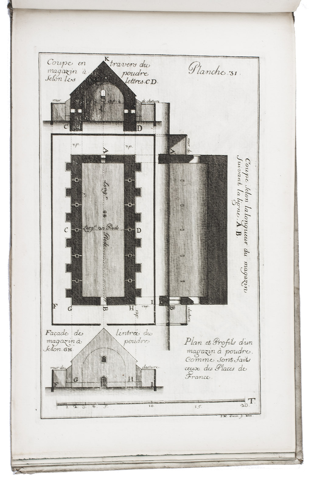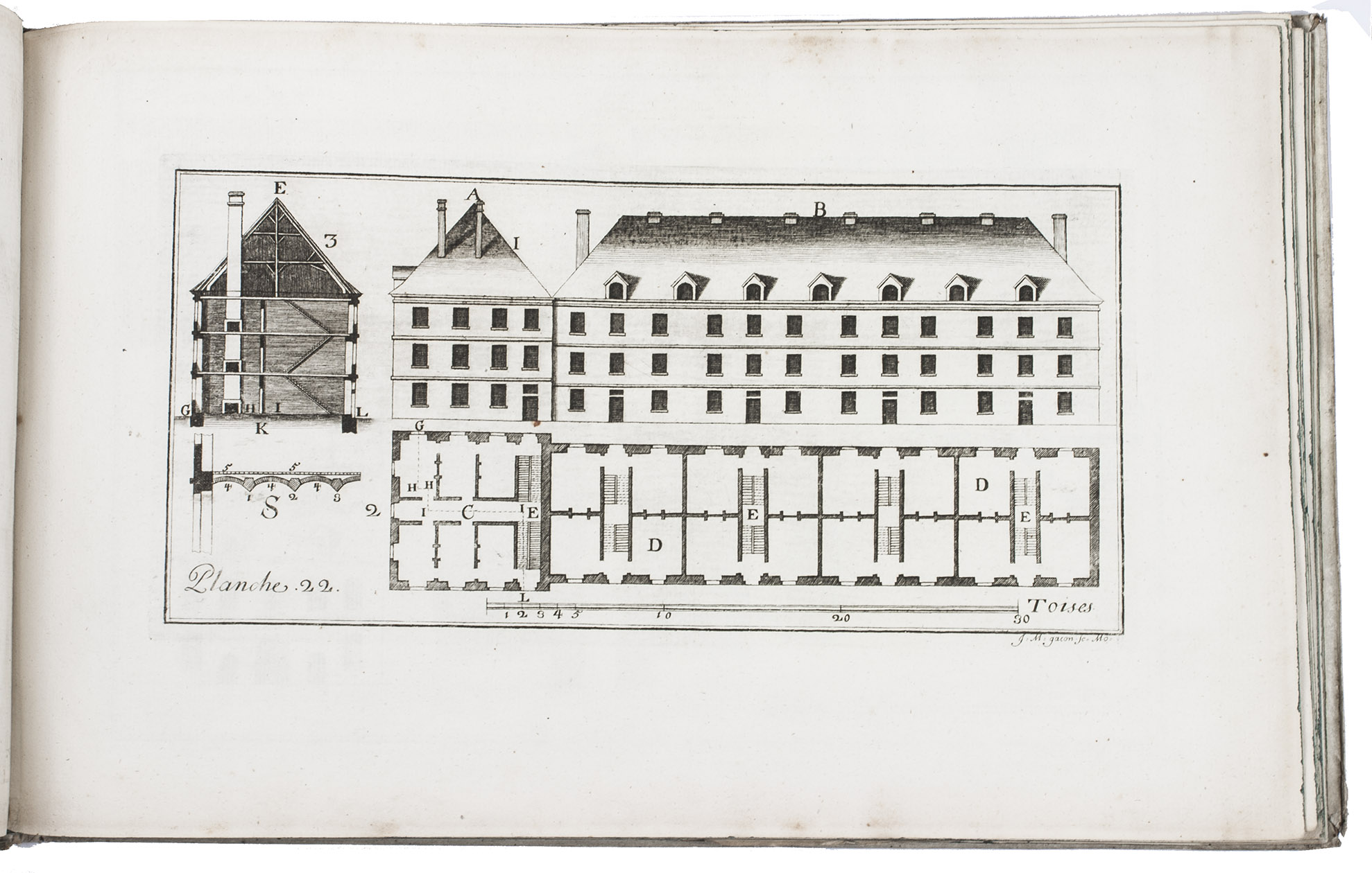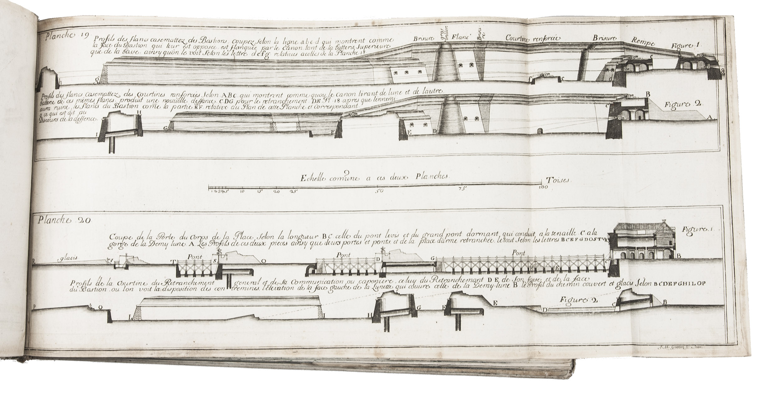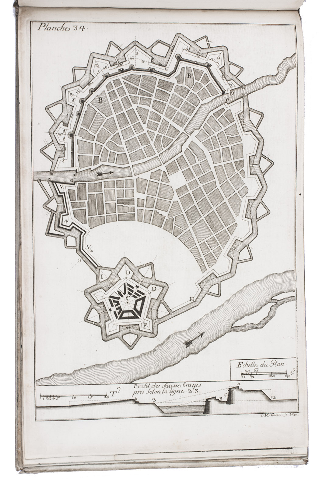 First and only edition of a work on modern French fortification by Lieutenant-Colonel Rozard. He states in his preface that, even though there are many books on fortification, most still present outdated methods, and he tries to present a modern method of fortification, both theoretical and practical. He does, however, include some 17th-century methods as described by Simon Stevin and Blaise Francois Pagan. Other chapters deal with more modern engineers like Vauban and Manesson Mallet. The second part describes how to construct different types of fortresses (square, pentagon, hexagon, irregular, etc.) and the interior of a fortress. The atlas volume contains many ground plans and profiles.