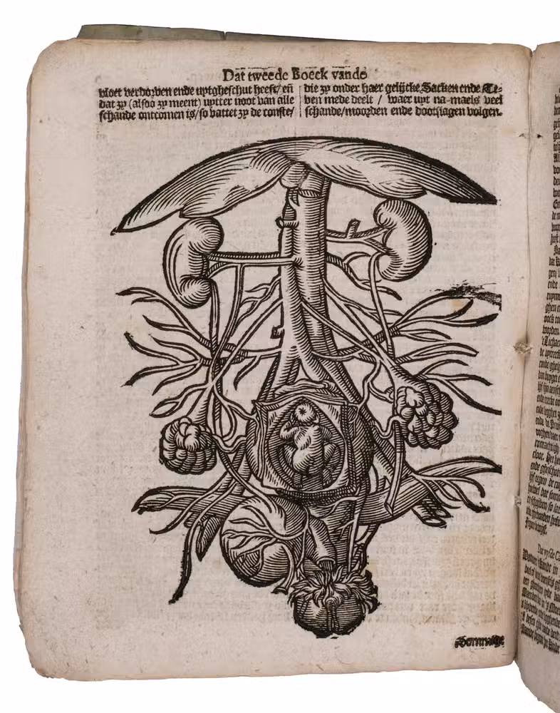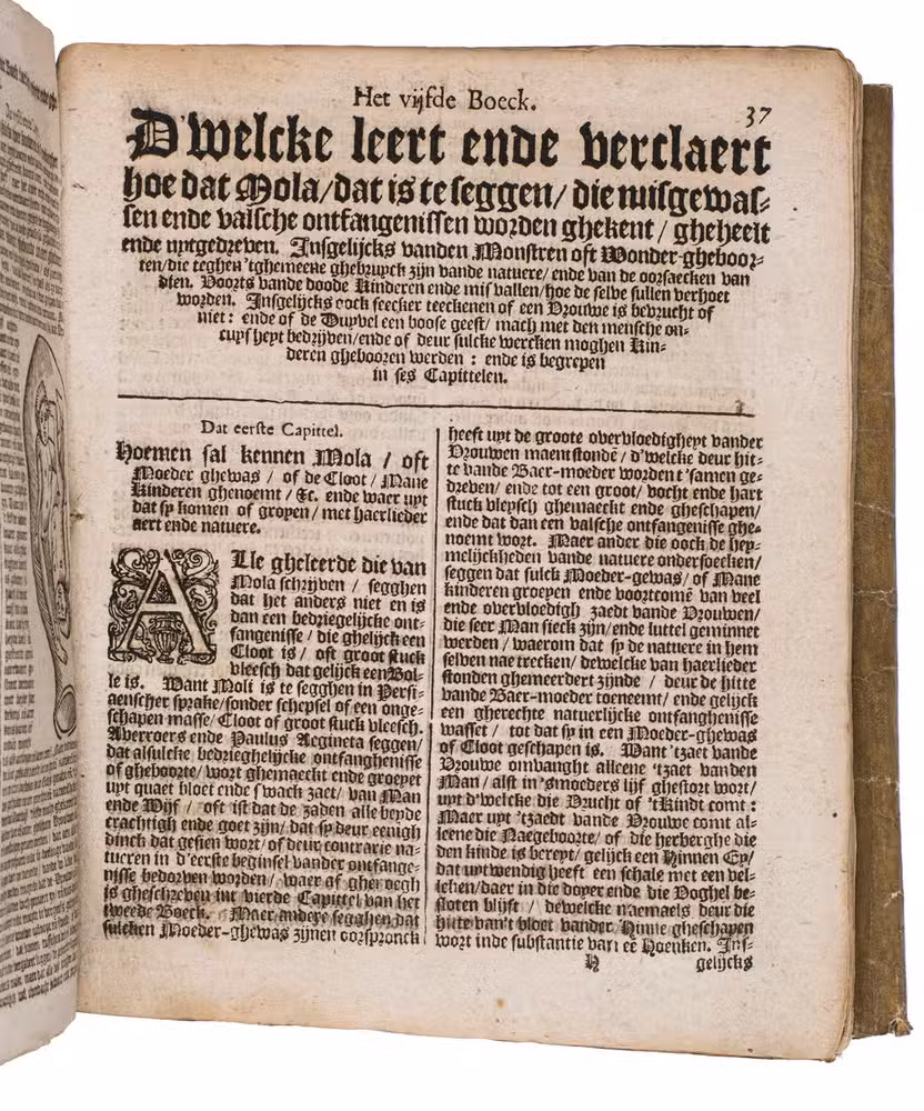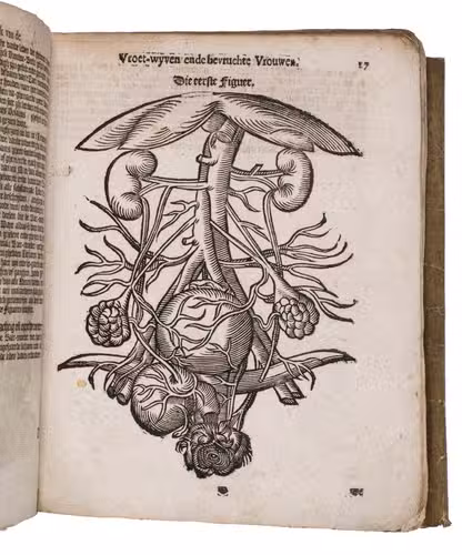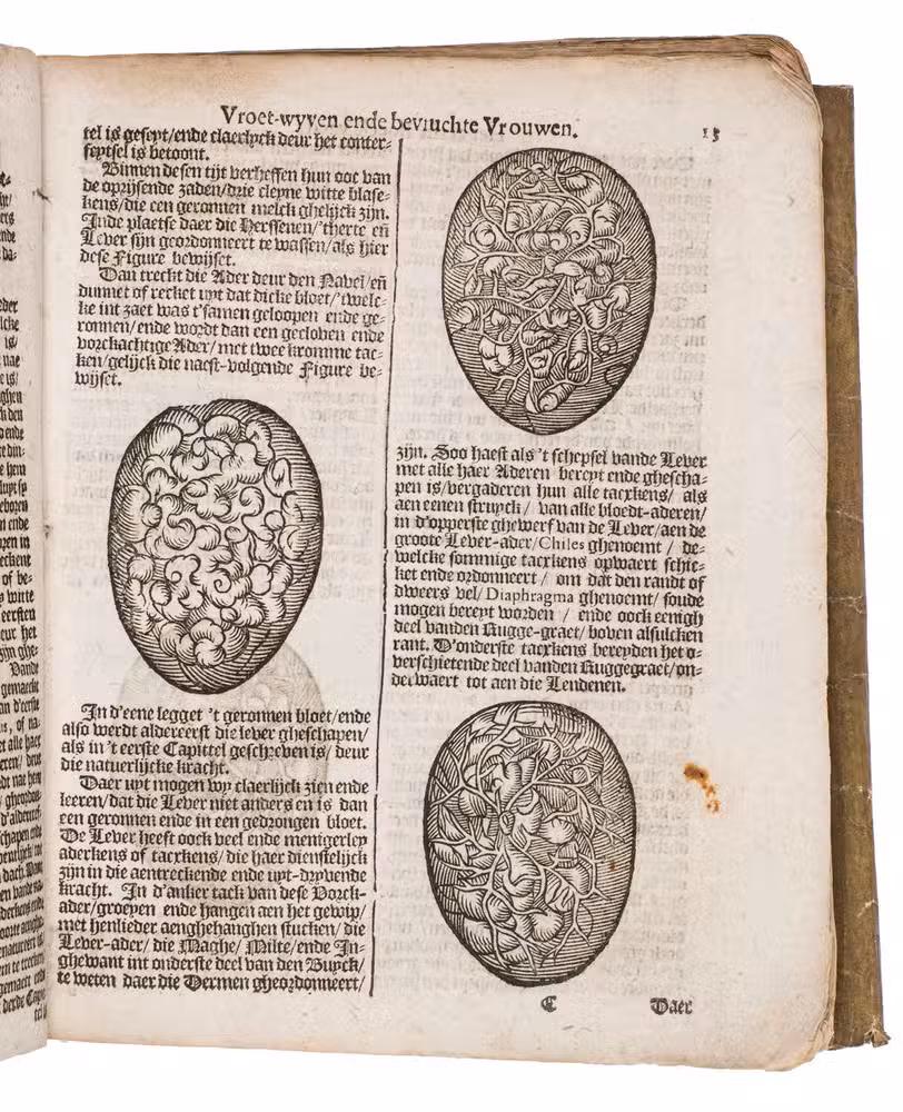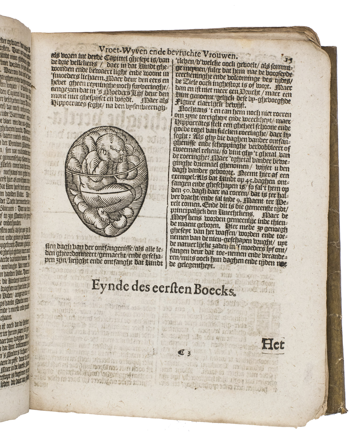It was originally published in 1554 as Ein schön lustig Trostbüchli von den empfengknussen und geburten der Menschen, translated into Latin in the same year as De conceptu et generatione hominis... insuper. The first of the many Dutch editions appeared in 1591, all early editions are very rare. The present edition contains the preface by Sigmund Feyerabend, who published the Latin edition of 1580.