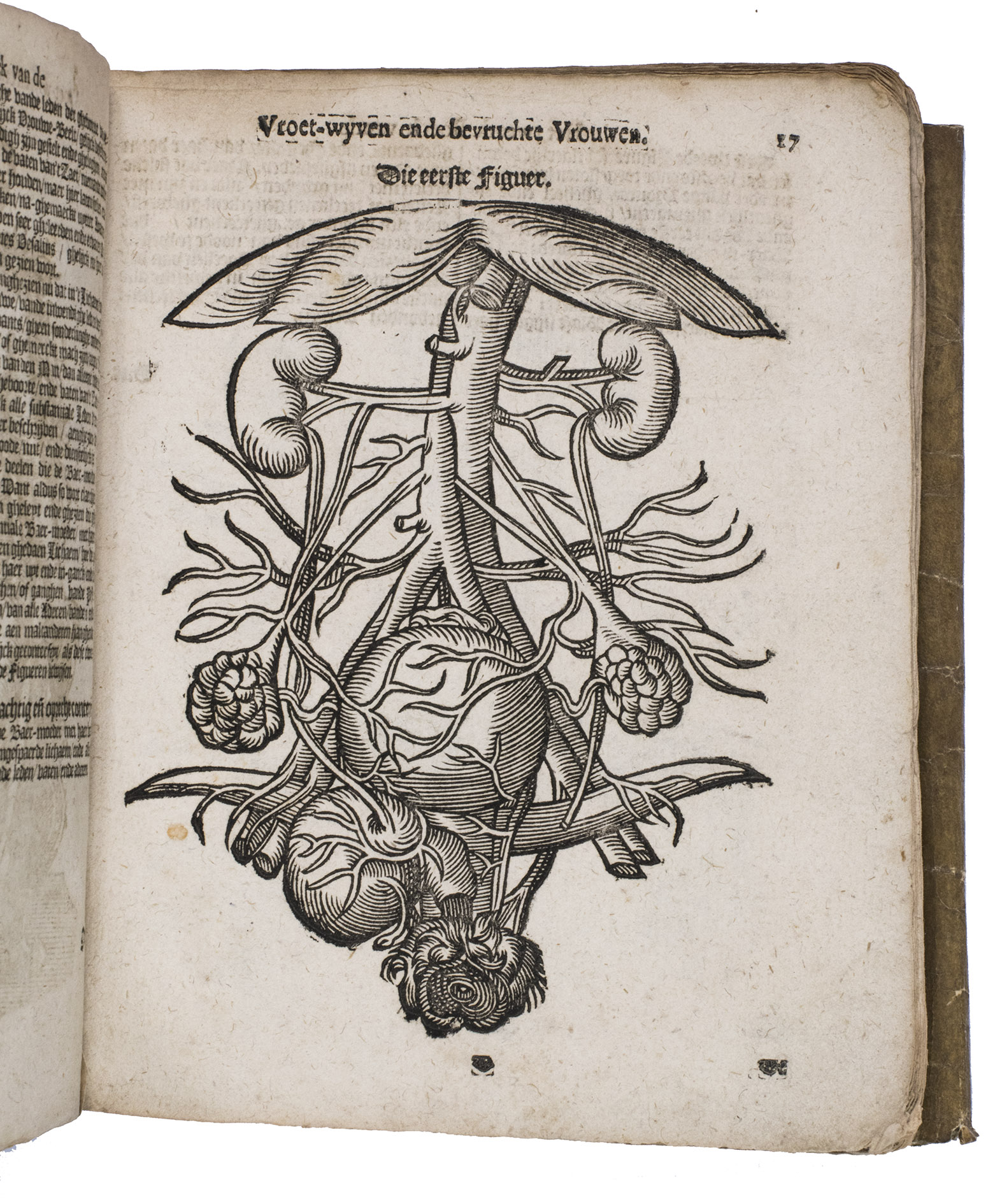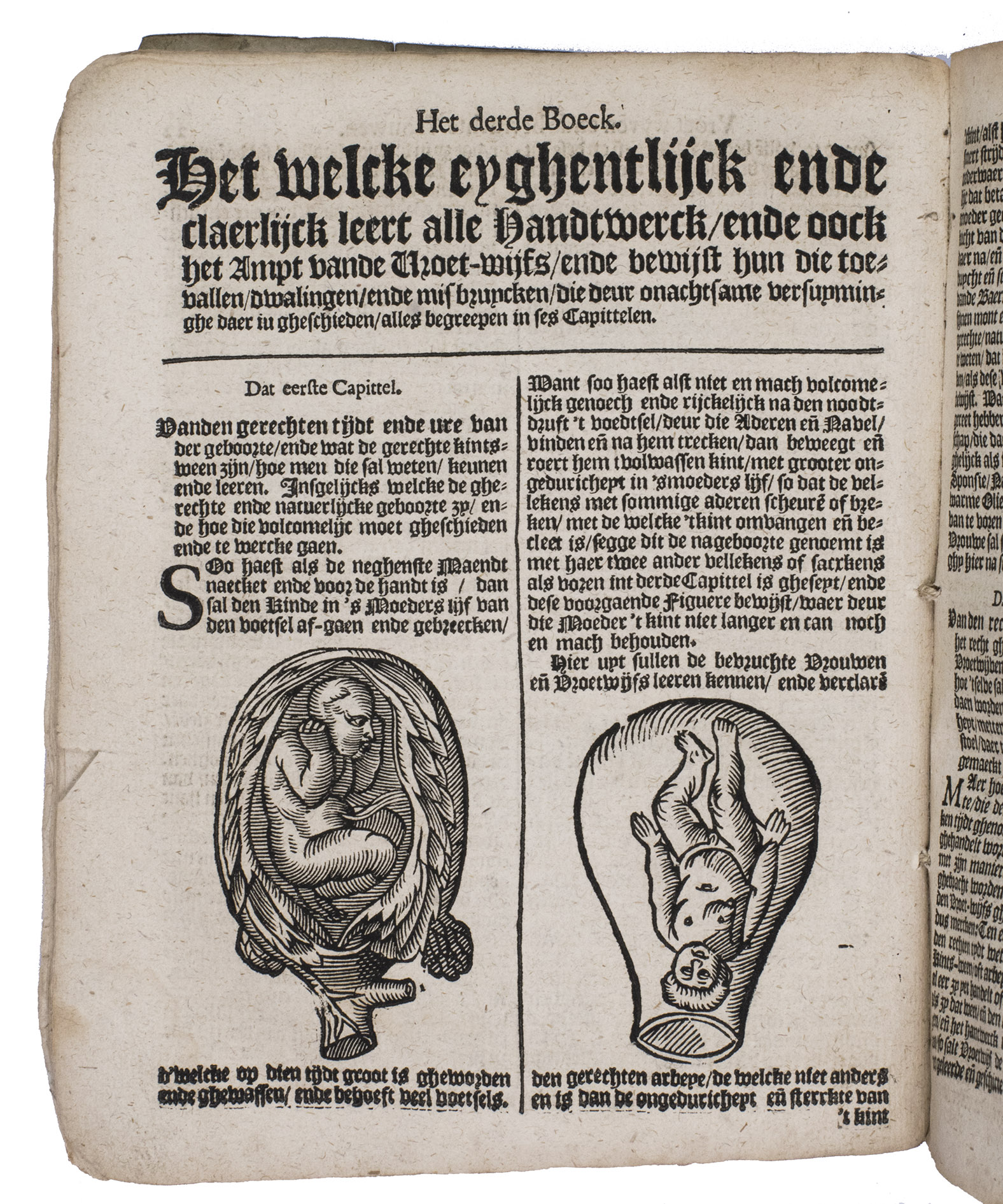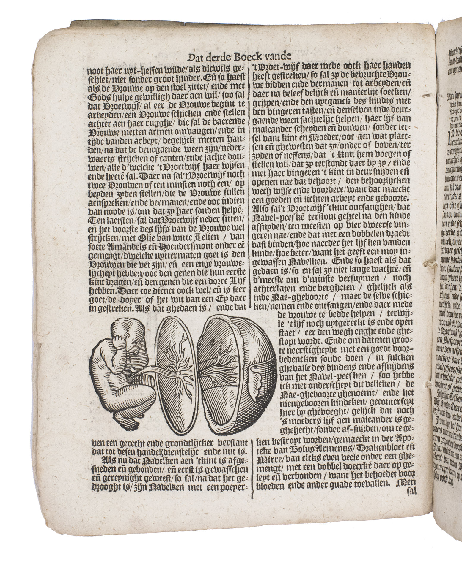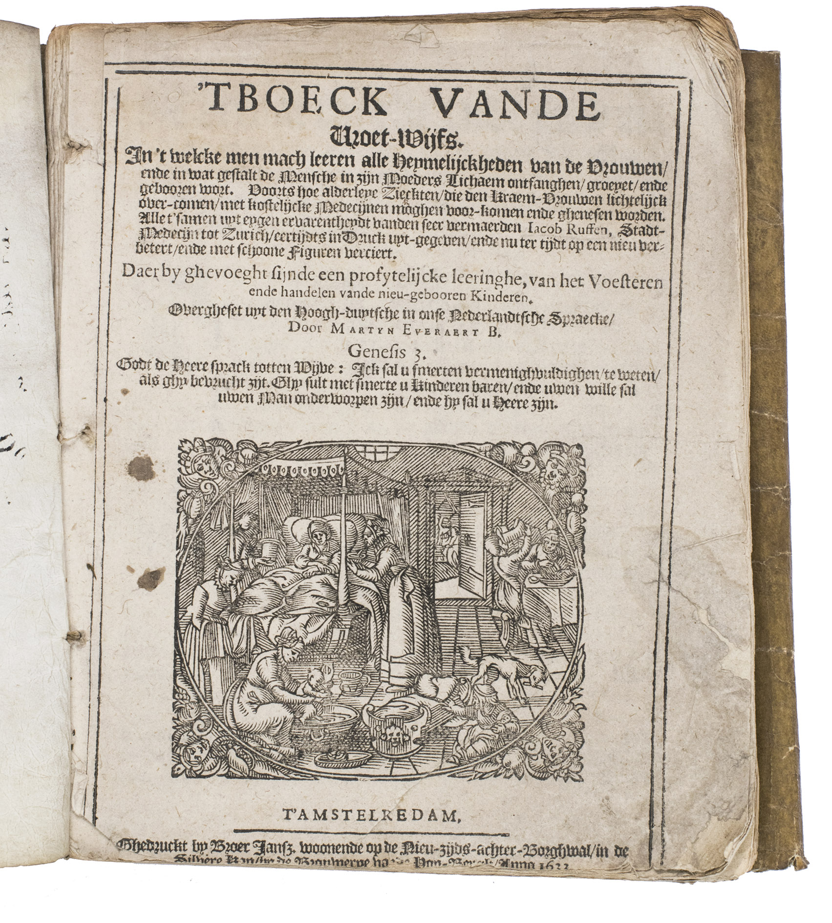 Rare sixth(?) edition of the Dutch translation of Jacob Rüff's classic and well-illustrated book on the conception, generation and birth of the child, the duties of the midwife, the attendant diseases of child-bearing, etc. Translated into Dutch by Marten Everart. Rüff's work is an improved version of Rosslin's Der Swangern frawen and contained the first true anatomical pictures in an obstetrics book.