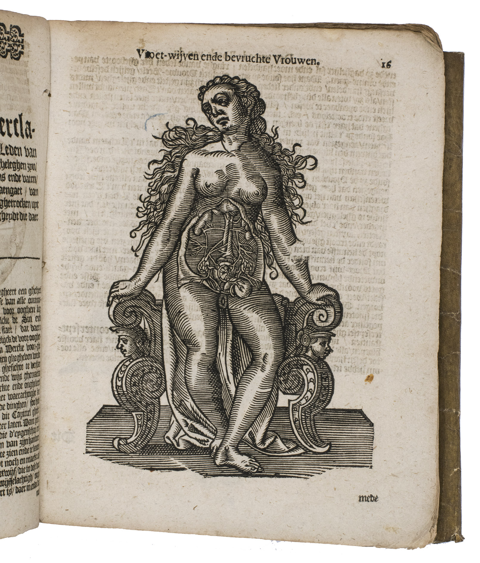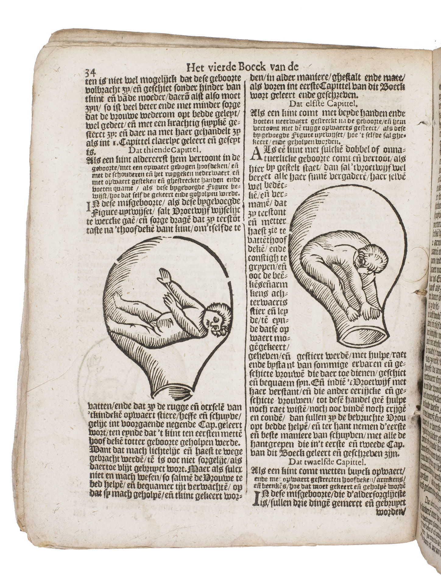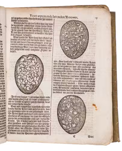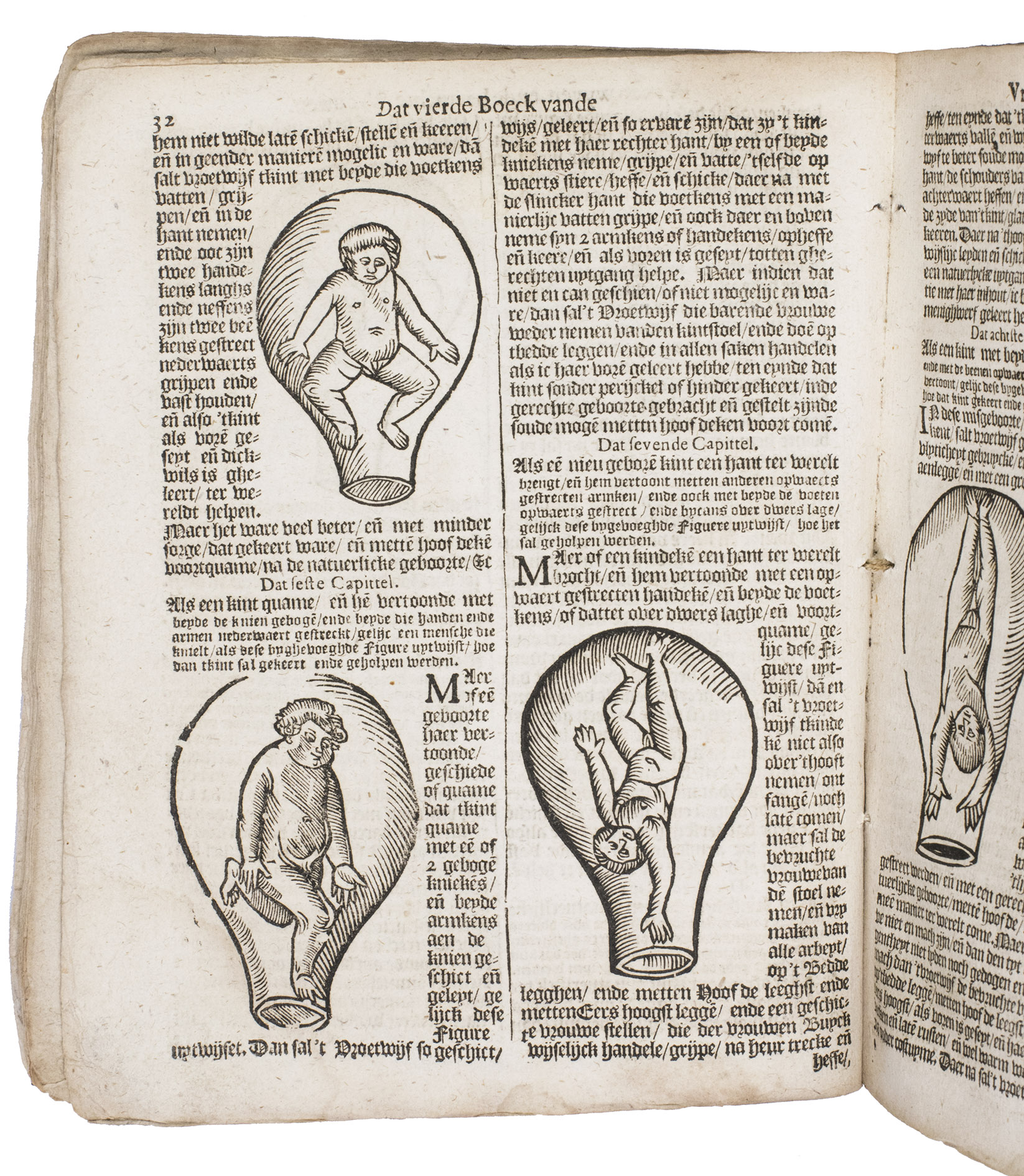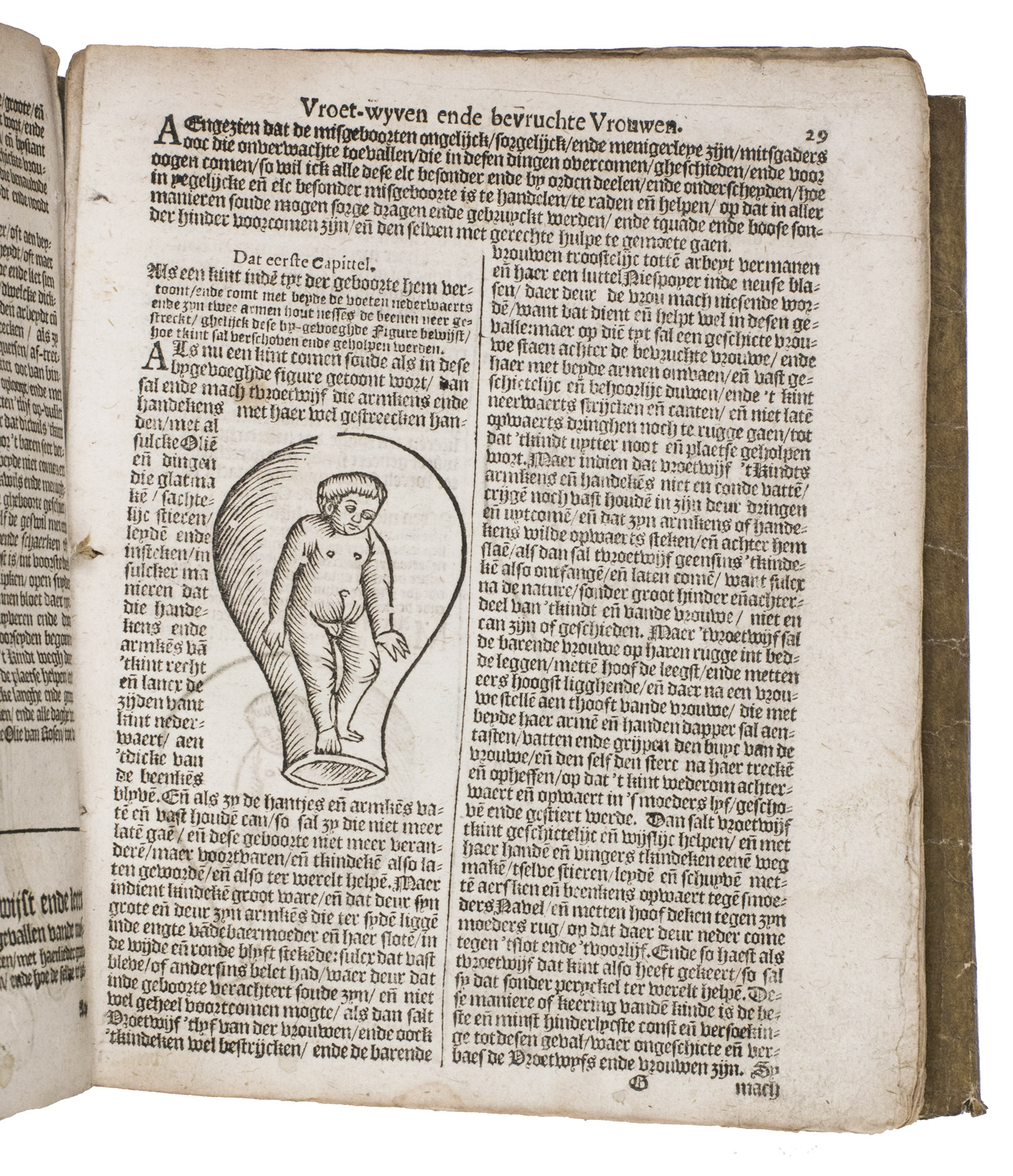 Rare sixth(?) edition of the Dutch translation of Jacob Rüff's classic and well-illustrated book on the conception, generation and birth of the child, the duties of the midwife, the attendant diseases of child-bearing, etc. Translated into Dutch by Marten Everart. Rüff's work is an improved version of Rosslin's Der Swangern frawen and contained the first true anatomical pictures in an obstetrics book.