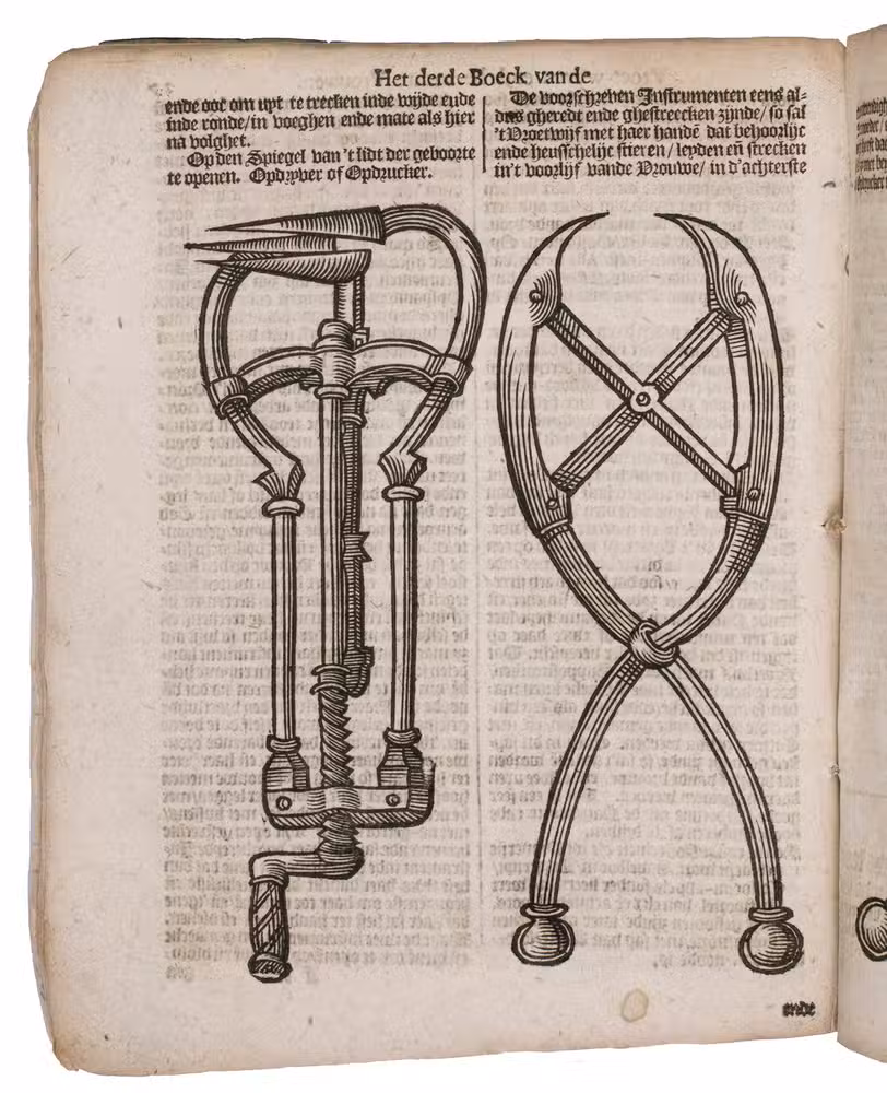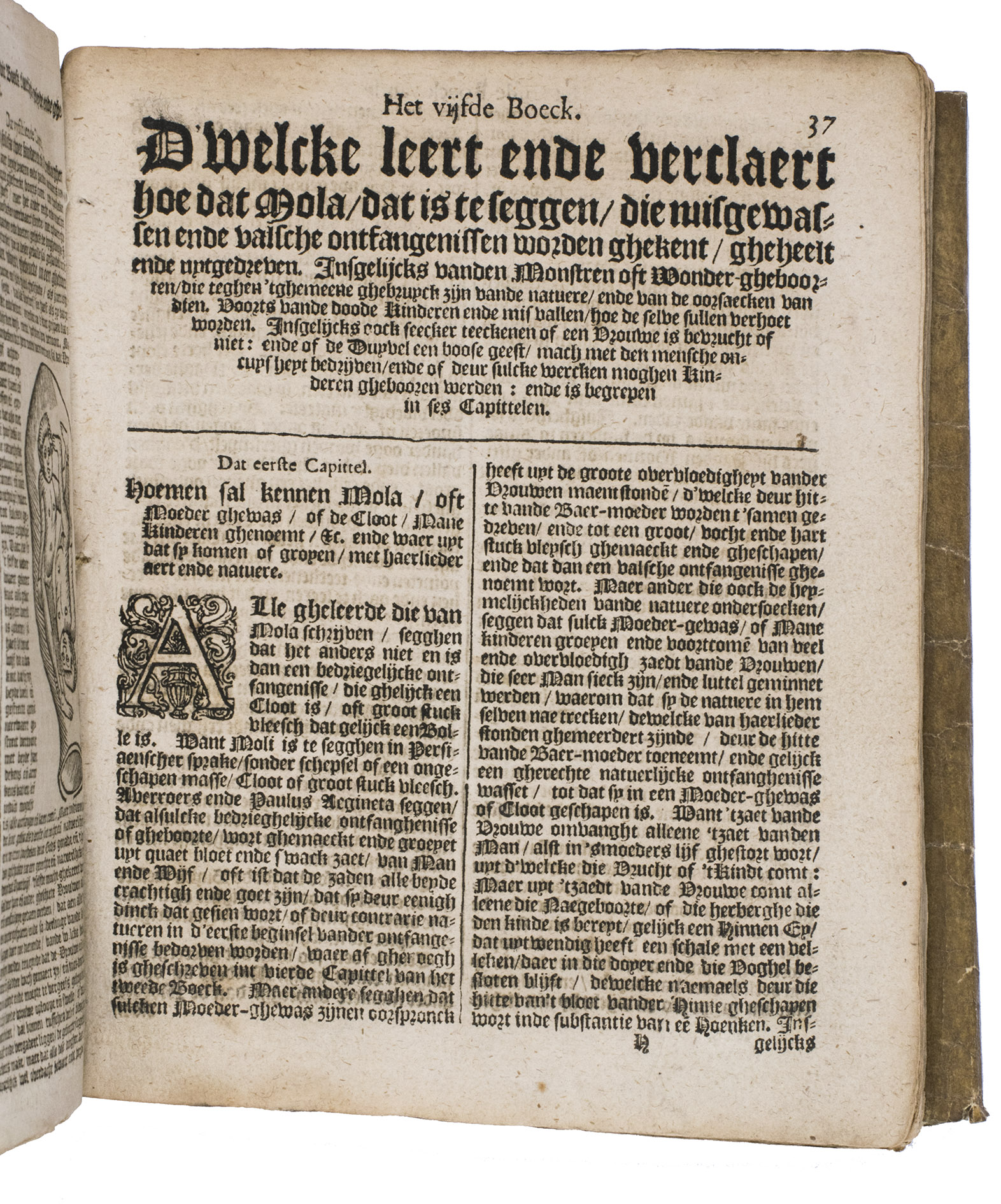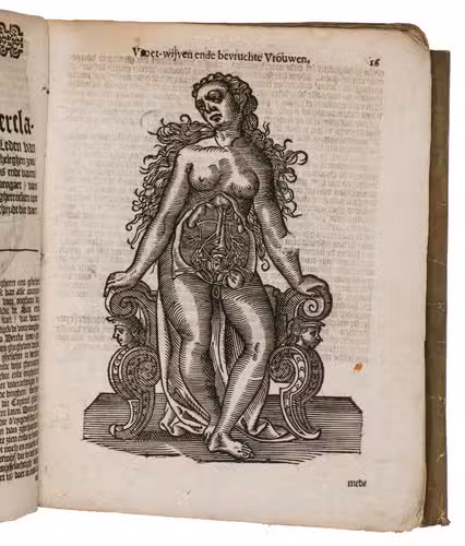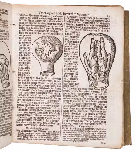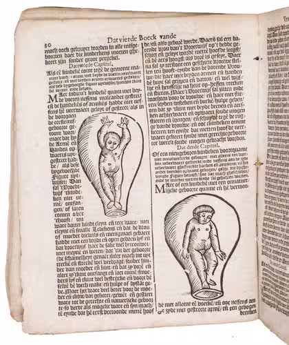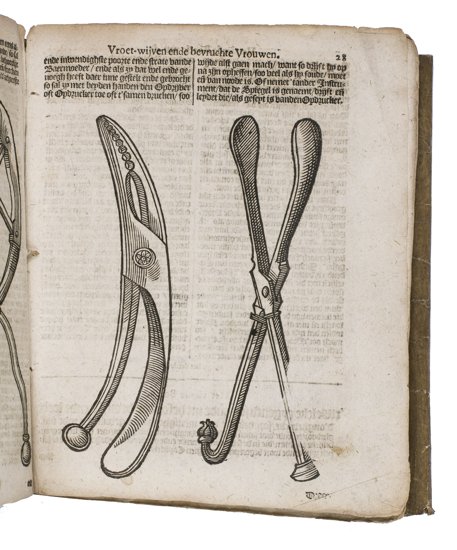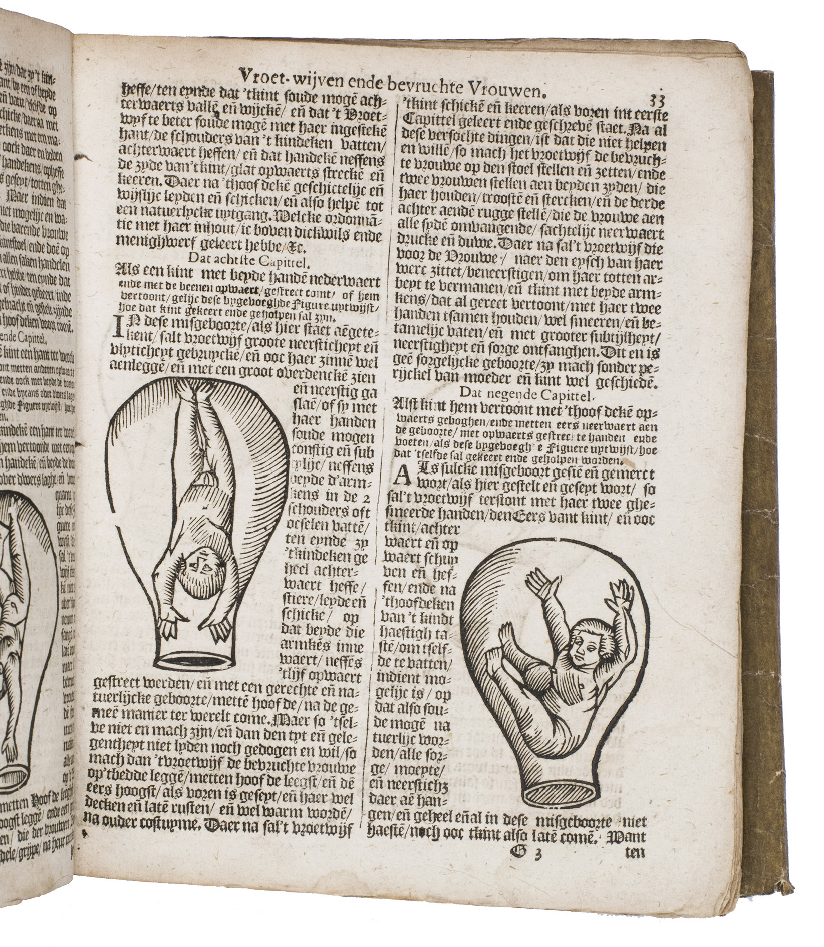 Rare sixth(?) edition of the Dutch translation of Jacob Rüff's classic and well-illustrated book on the conception, generation and birth of the child, the duties of the midwife, the attendant diseases of child-bearing, etc. Translated into Dutch by Marten Everart. Rüff's work is an improved version of Rosslin's Der Swangern frawen and contained the first true anatomical pictures in an obstetrics book.