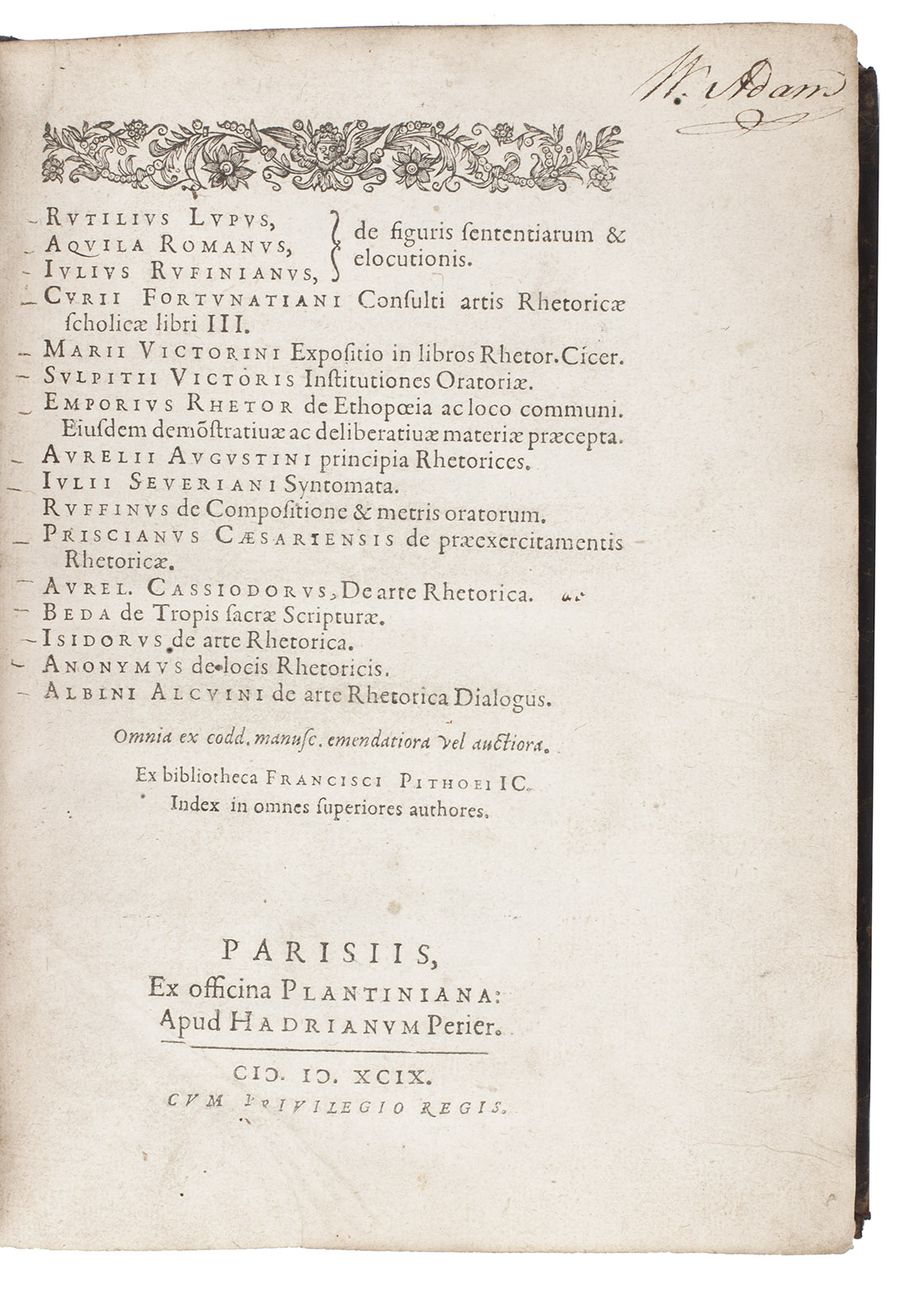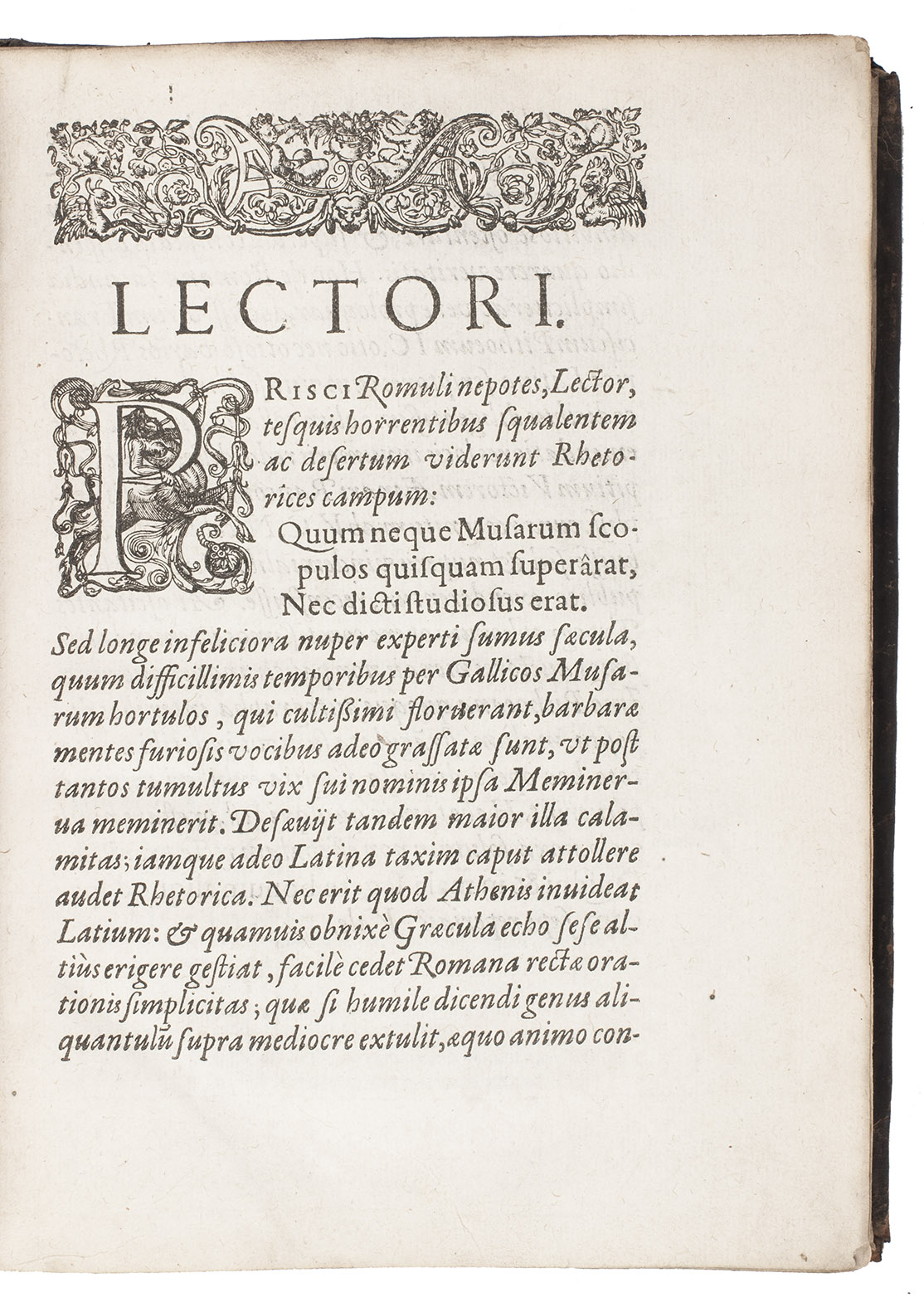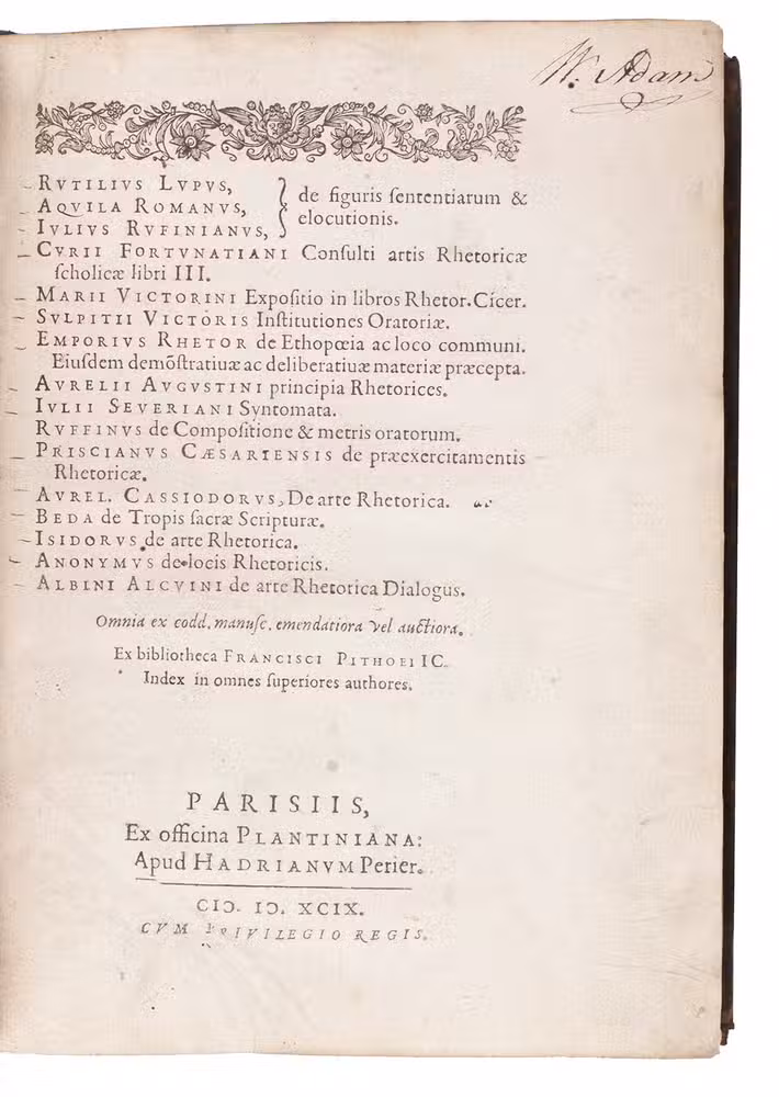 First edition of a collection of 15 classical and mediaeval school texts on the art of rhetoric, in a rare 16th-century French prize binding from Aire-sur- la-Lys, in the French department Pas-de Calais, on the border of French Flanders and Artois. Although most of these works had been published before in some form, the present collection was based on an unpublished manuscript. It therefore provided an independent source for these works as well as bringing them together in one convenient volume for students. The manuscripts edited here came from the library of the celebrated French lawyer, humanist and scholar François Pithou (1543-1621), a pupil of Cujas and later attorney-general at Troyes. He is believed to have edited the texts himself for the present publication.