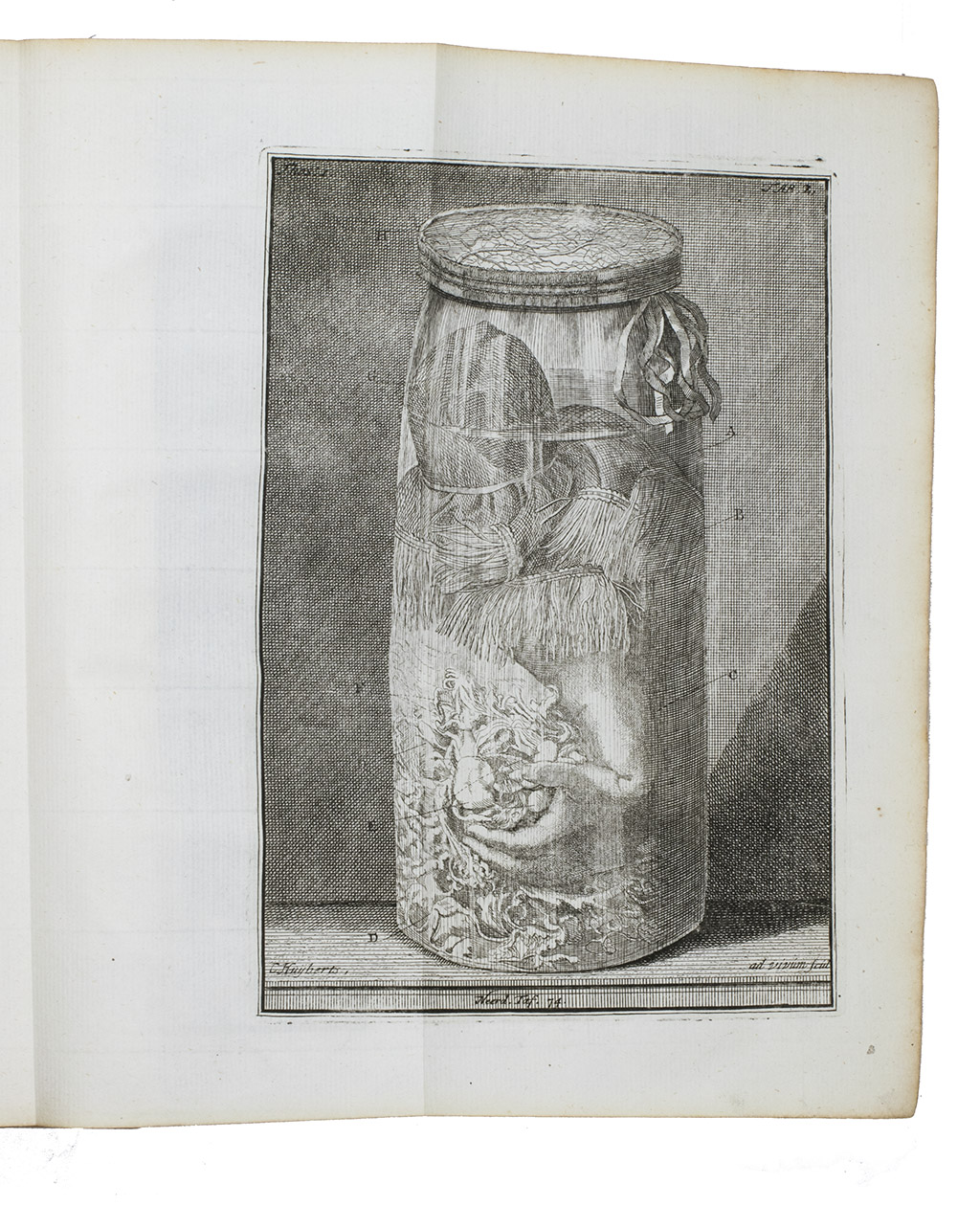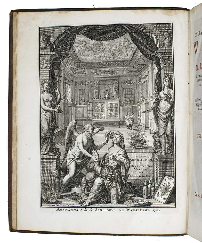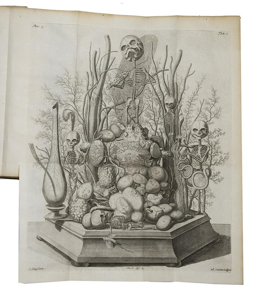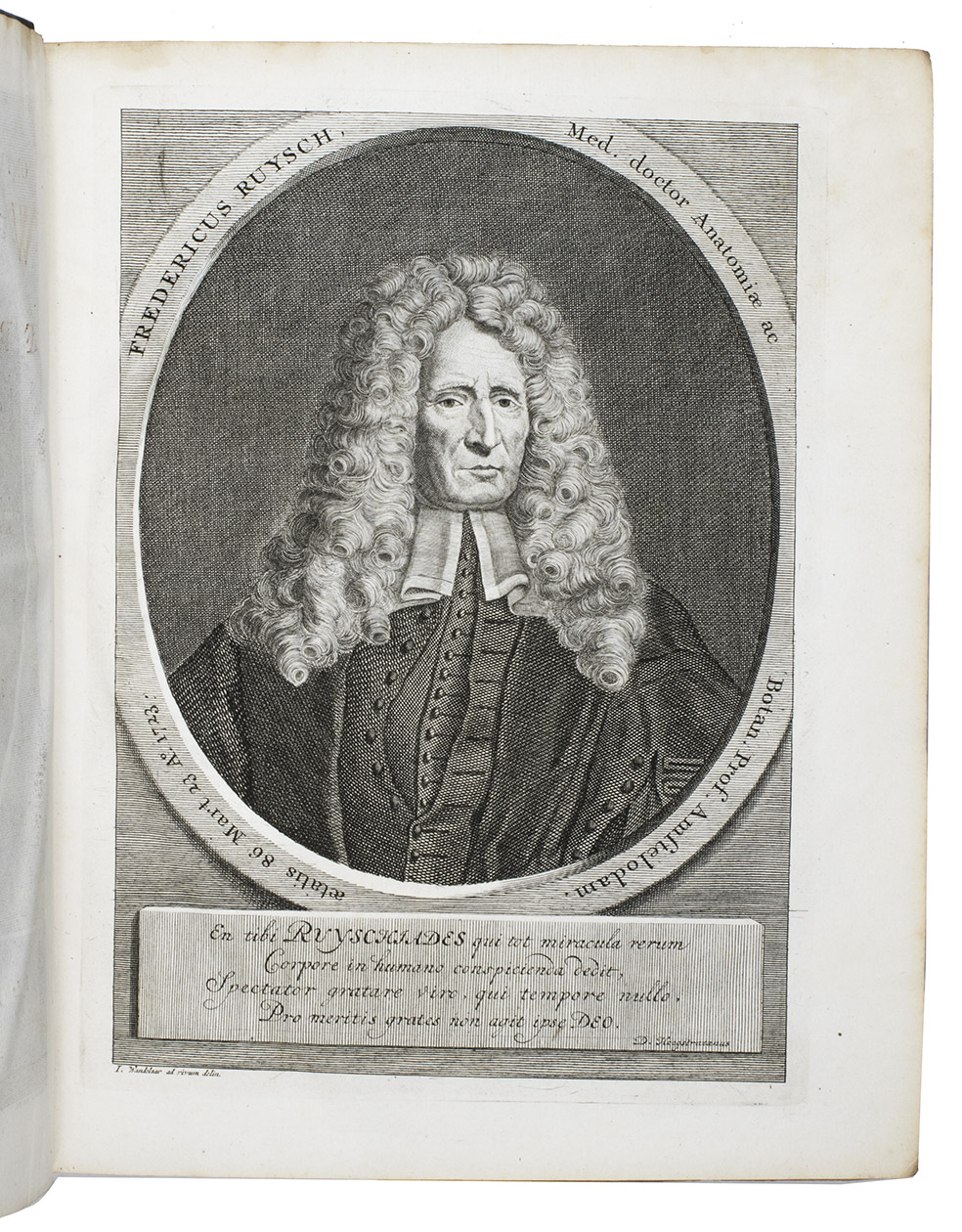 Frederik Ruysch (1638-1731), a surgeon and anatomist, professor at Leiden and Amsterdam. He was the first to demonstrate the occurrence of blood vessels in almost all tissues of the human body, made many important anatomical investigations including those of the valves in the lympathics, the bronchial arteries, and the vascular plexuses of the heart, and he was the first also to point out the nourishment of the foetus through the umbilical cord. His works are richly illustrated with excellent engravings, no doubt enhanced by his injection techniques. And especially the engravings of anatomical specimen, which Ruysch  prepared with great skill, both of individual organs and entire corpses, deserve special attention for their fantastic, almost  surrealistic beauty, showing stuffed monsters, strange reptiles, dried plants, sea creatures, and smiling skeletons arranged in a quaint landscape of organs.