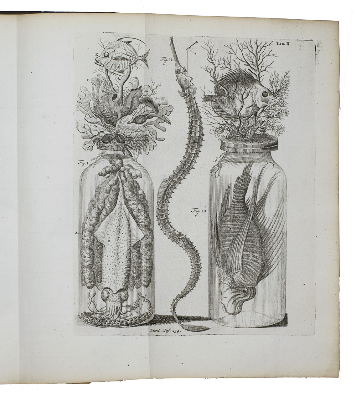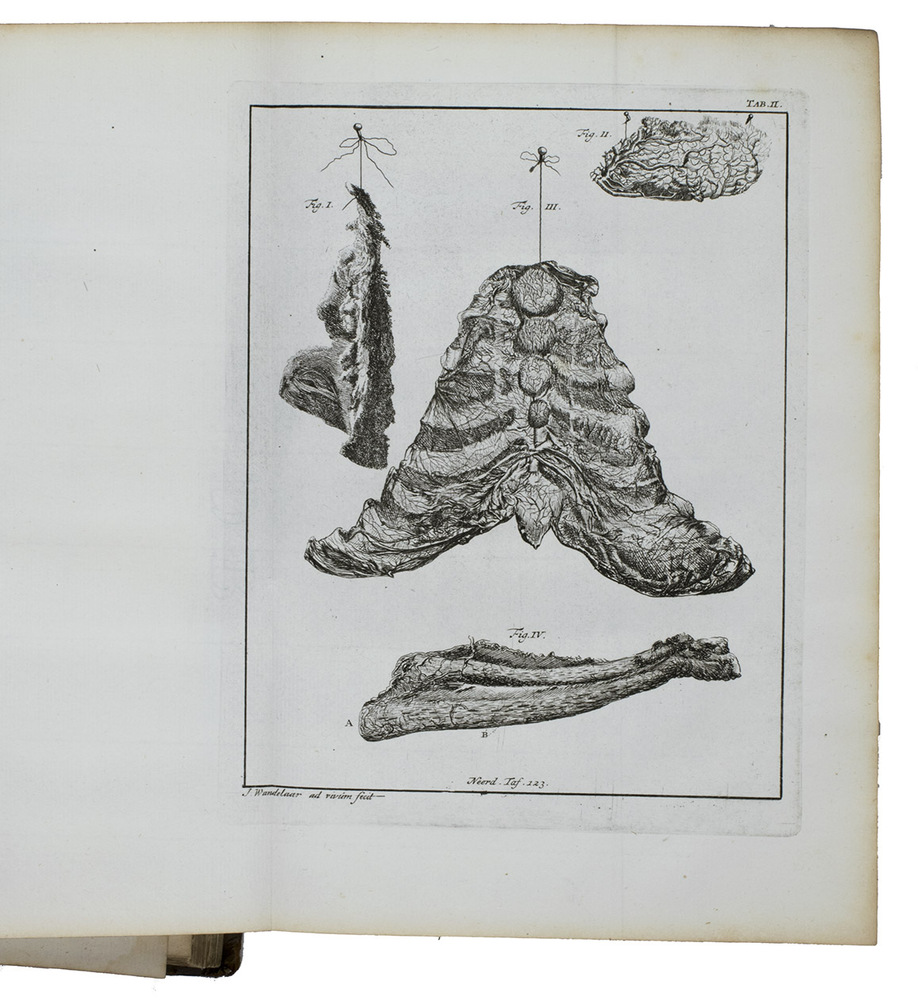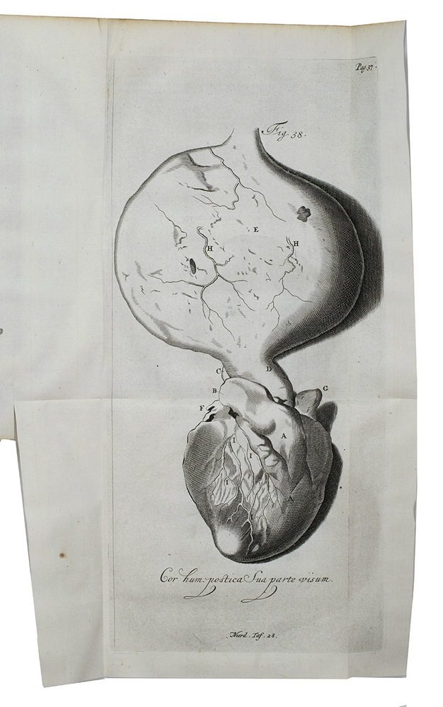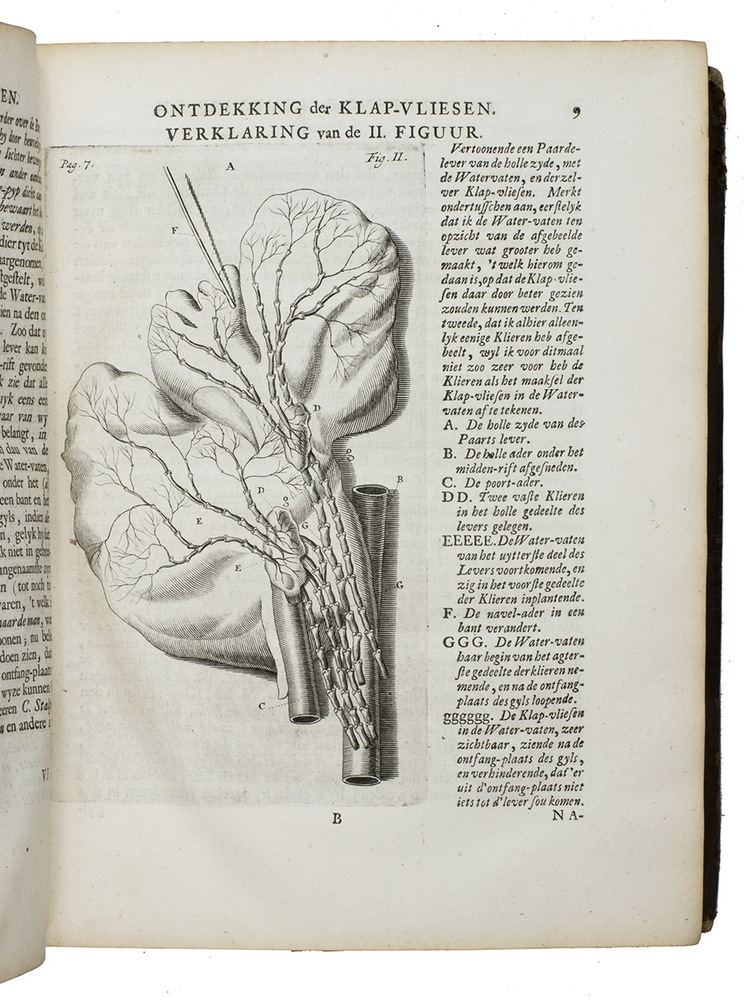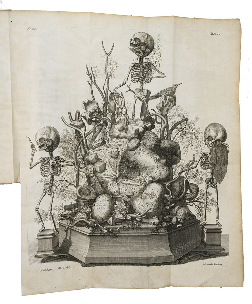 Frederik Ruysch (1638-1731), a surgeon and anatomist, professor at Leiden and Amsterdam. He was the first to demonstrate the occurrence of blood vessels in almost all tissues of the human body, made many important anatomical investigations including those of the valves in the lympathics, the bronchial arteries, and the vascular plexuses of the heart, and he was the first also to point out the nourishment of the foetus through the umbilical cord. His works are richly illustrated with excellent engravings, no doubt enhanced by his injection techniques. And especially the engravings of anatomical specimen, which Ruysch  prepared with great skill, both of individual organs and entire corpses, deserve special attention for their fantastic, almost  surrealistic beauty, showing stuffed monsters, strange reptiles, dried plants, sea creatures, and smiling skeletons arranged in a quaint landscape of organs.