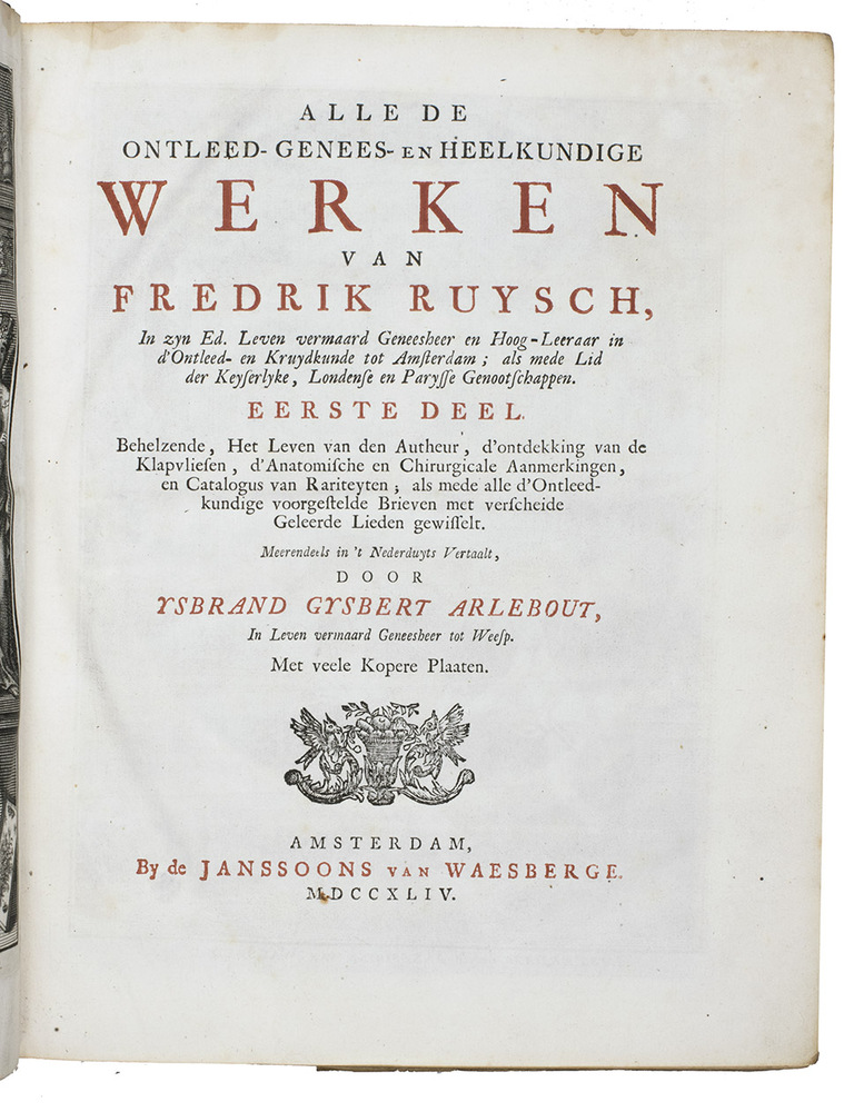 Very rare Dutch edition of the complete works of the great Dutch anatomist, Frederik Ruysch. These complete works originally were published in Latin as Opera Omnia Anatomico-Medico-chirurgica ut usque edita in 1737.