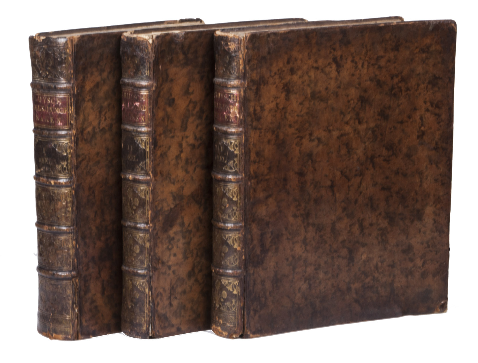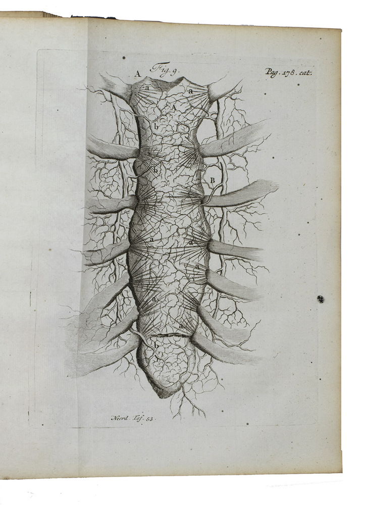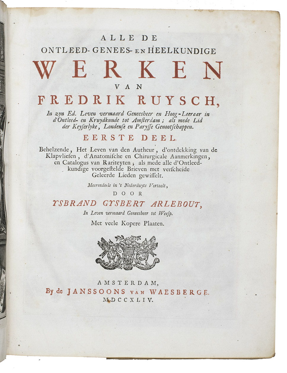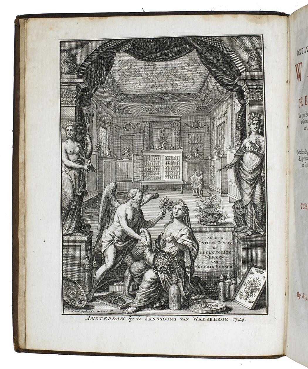 Amsterdam, Janssoons van Waesberge, 1744. 3 volumes. Large 4to. Engraved allegorical frontispiece, 3 titles in red & black, engraved portrait of Ruysch designed by I. Wandelaar and executed by D. Hoogstraten, 7 engraved illustrations in text, 2 woodcut illustrations in text and 133 engraved folding plates with anatomical designs and anatomical specimen. Contemporary marbled calf, spines ribbed and gilt with red-morocco title-labels. [4], 1280, [184] pp.