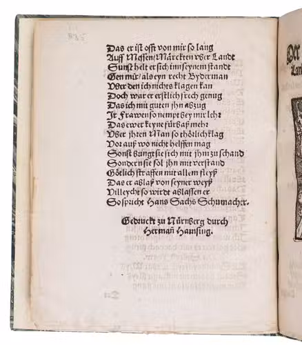 Ad 1 is the second edition of a satirical poem about seven women complaining about their wayward husbands. The piece was originally published as a broadside in 1531 and is the counterpart to another poem by Sachs about seven men complaining about their wives.