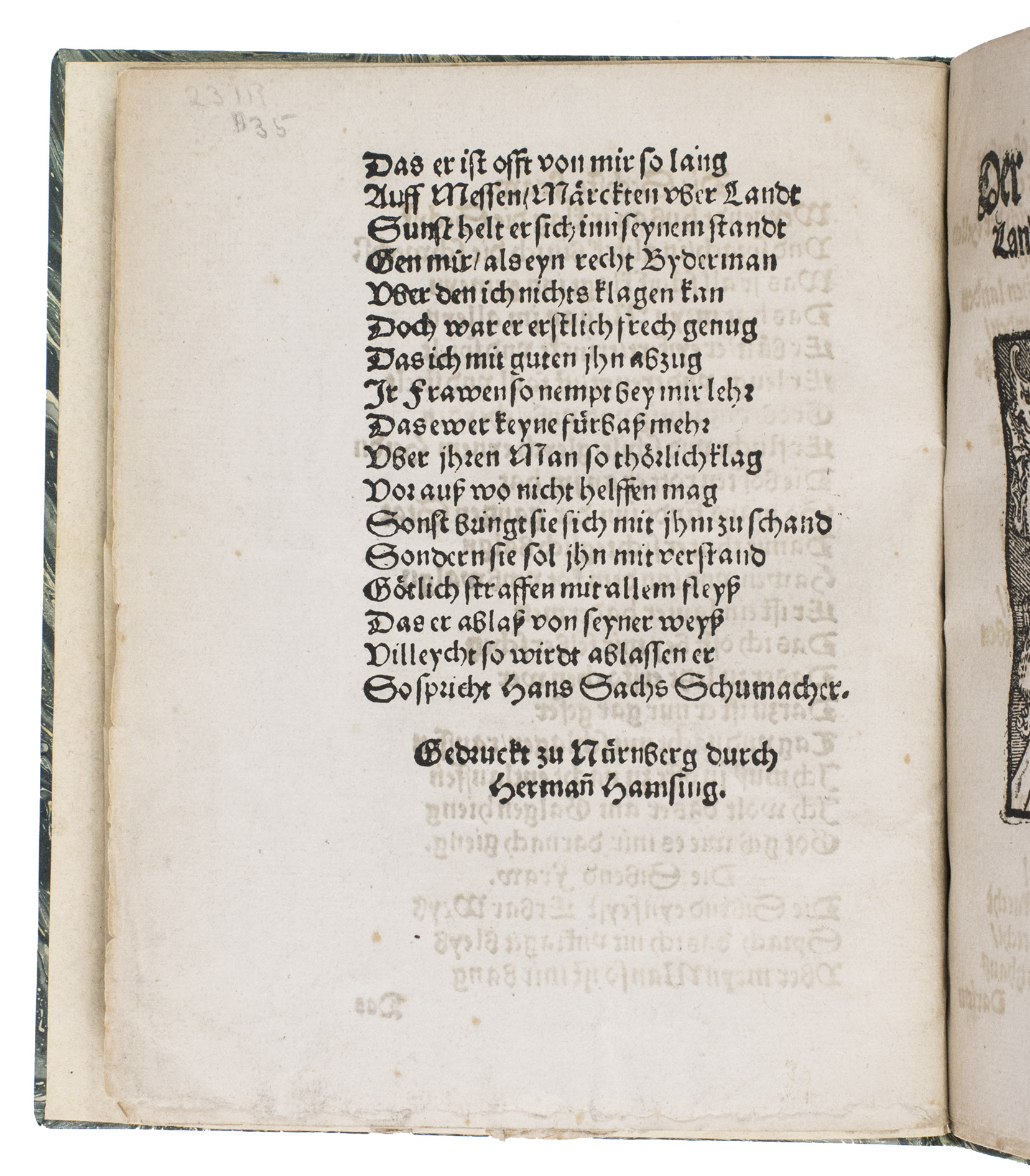 Ad 3 is an allegorical poem in verse, presented as a conversation between a peasant and a nightingale. It is based on Heinrich Steinhowel's translation of Aesop's The hawk and the nightingale (1476). Sachs' work was first published in 1555 and is here present in second edition. The woodcut on the title page was used as the lower border of a title page by Eberhard Schon; it shows three putti harvesting fruit amidst rose vines.