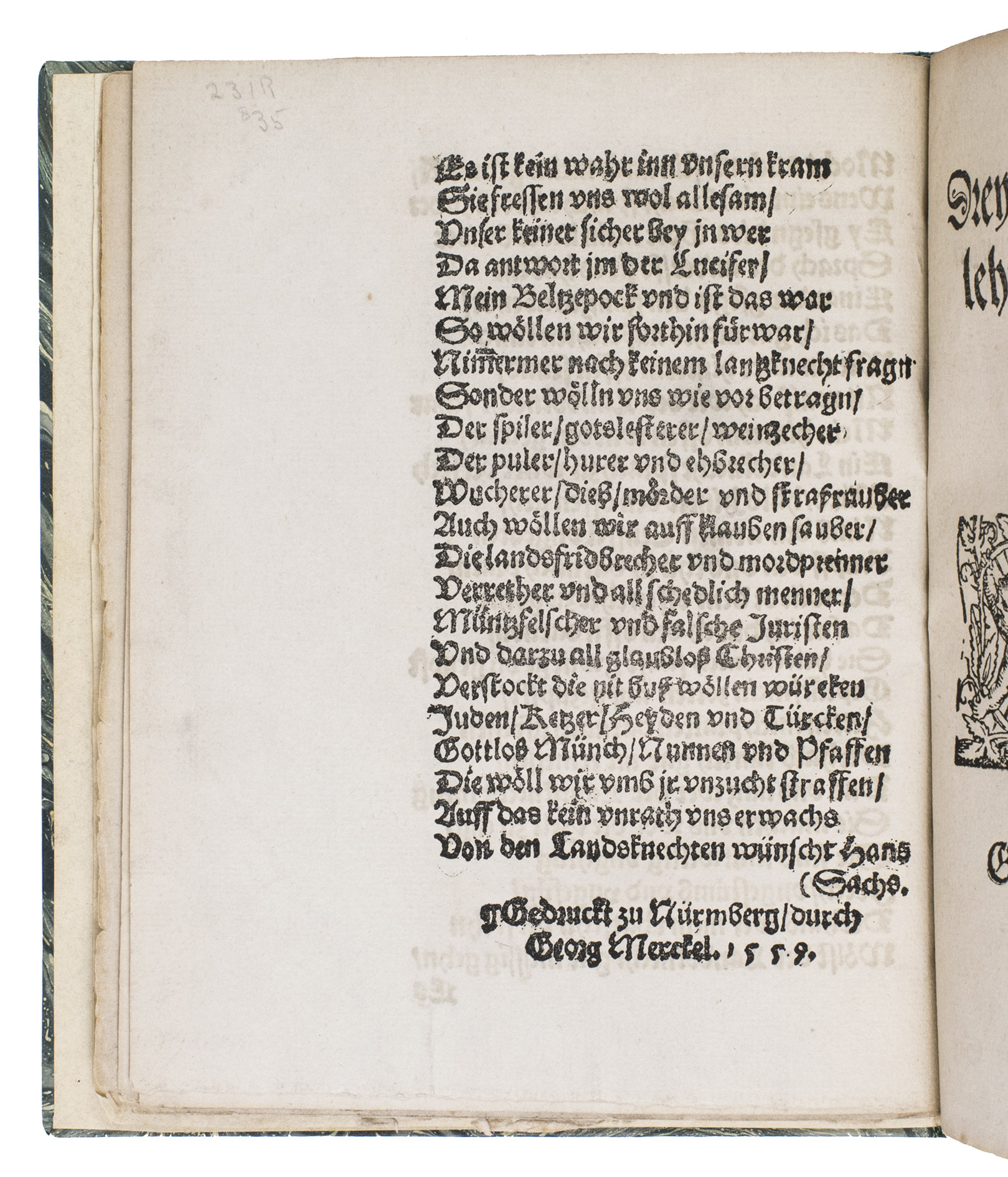 Nuremberg, Valentin Neuber, [ca. 1560]. 3 works in 1 volume. 4to. With a woodcut vignette on the title page of each work. Modern marbled boards. [4]; [4]; [4] ll.