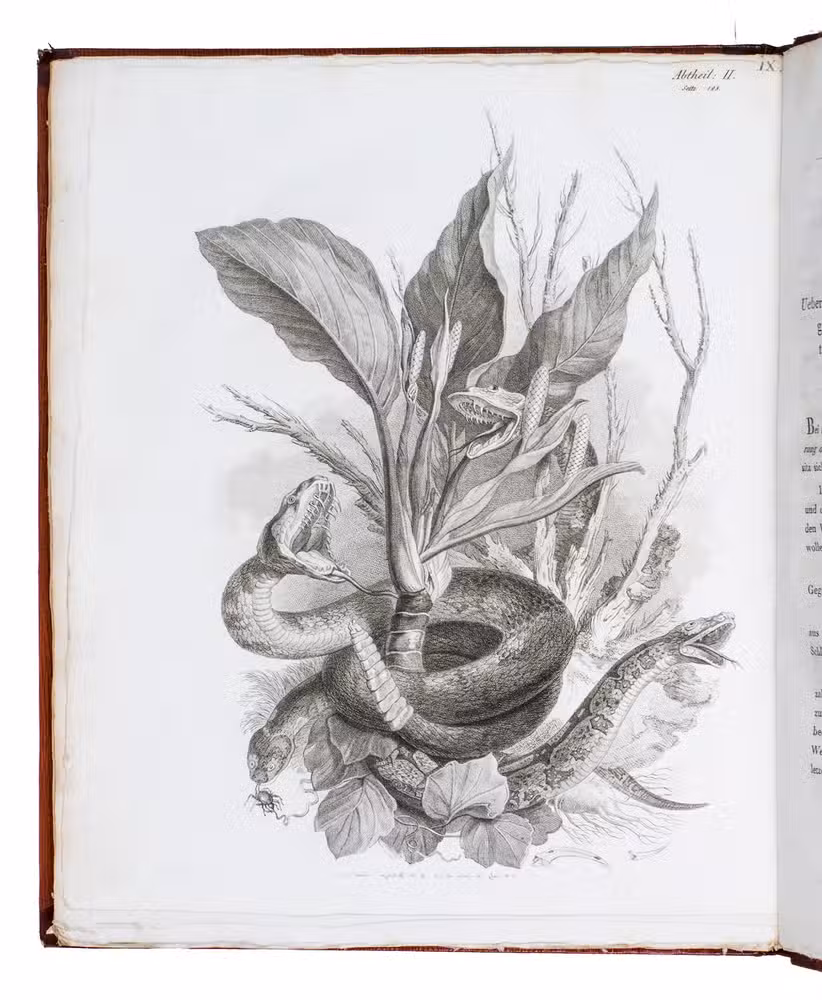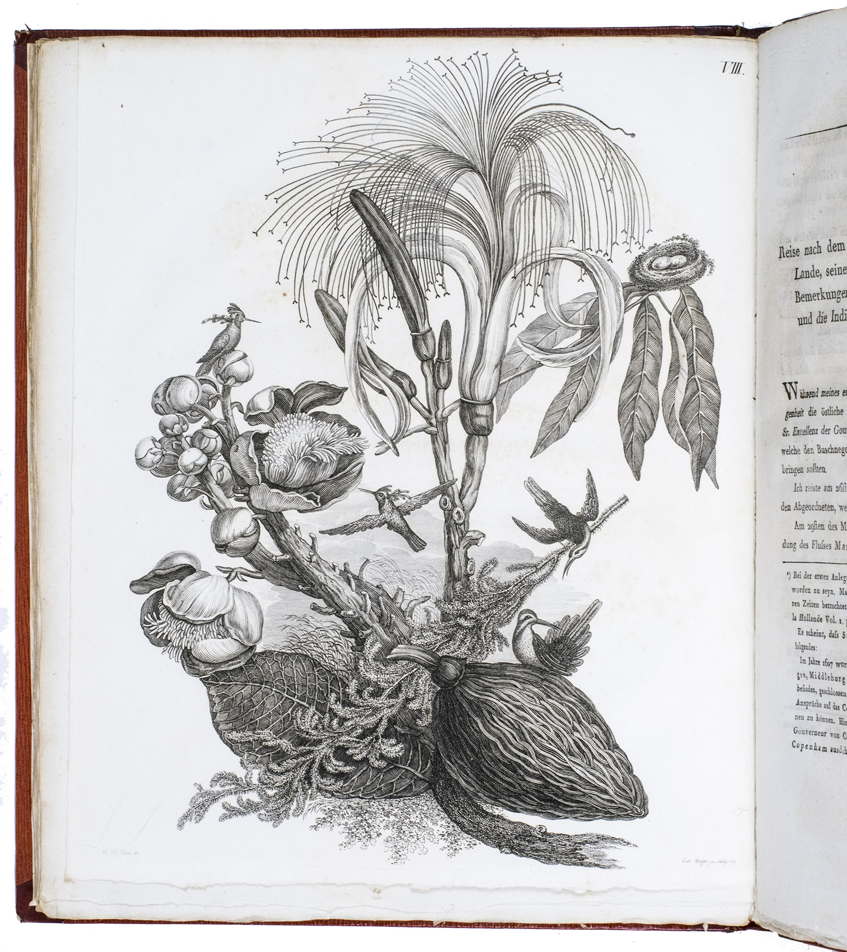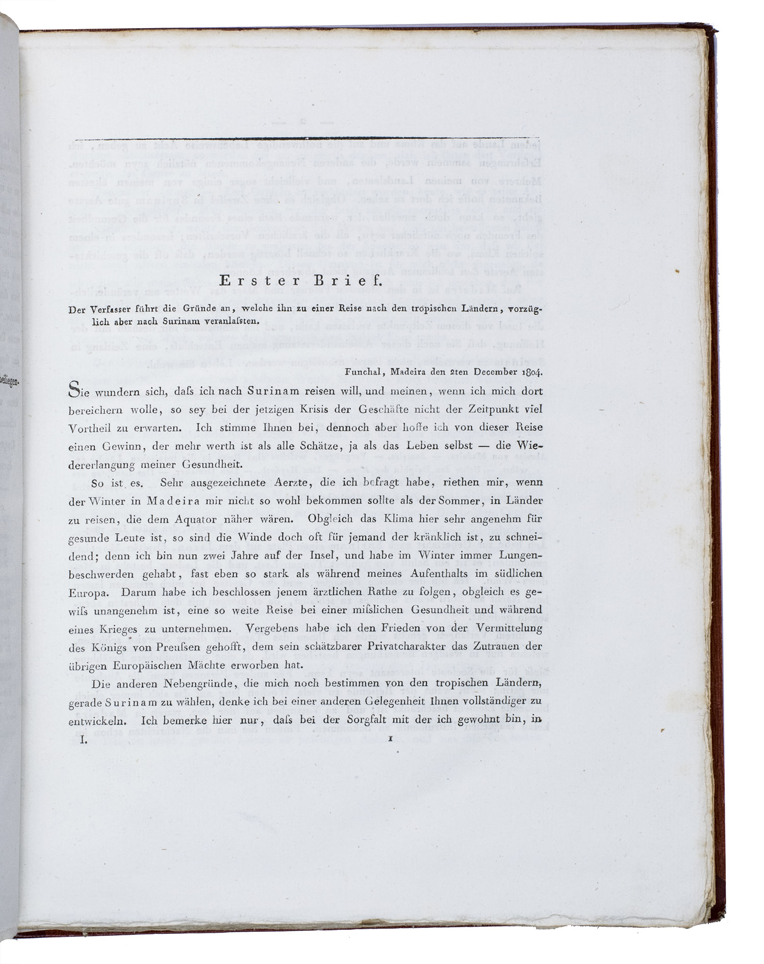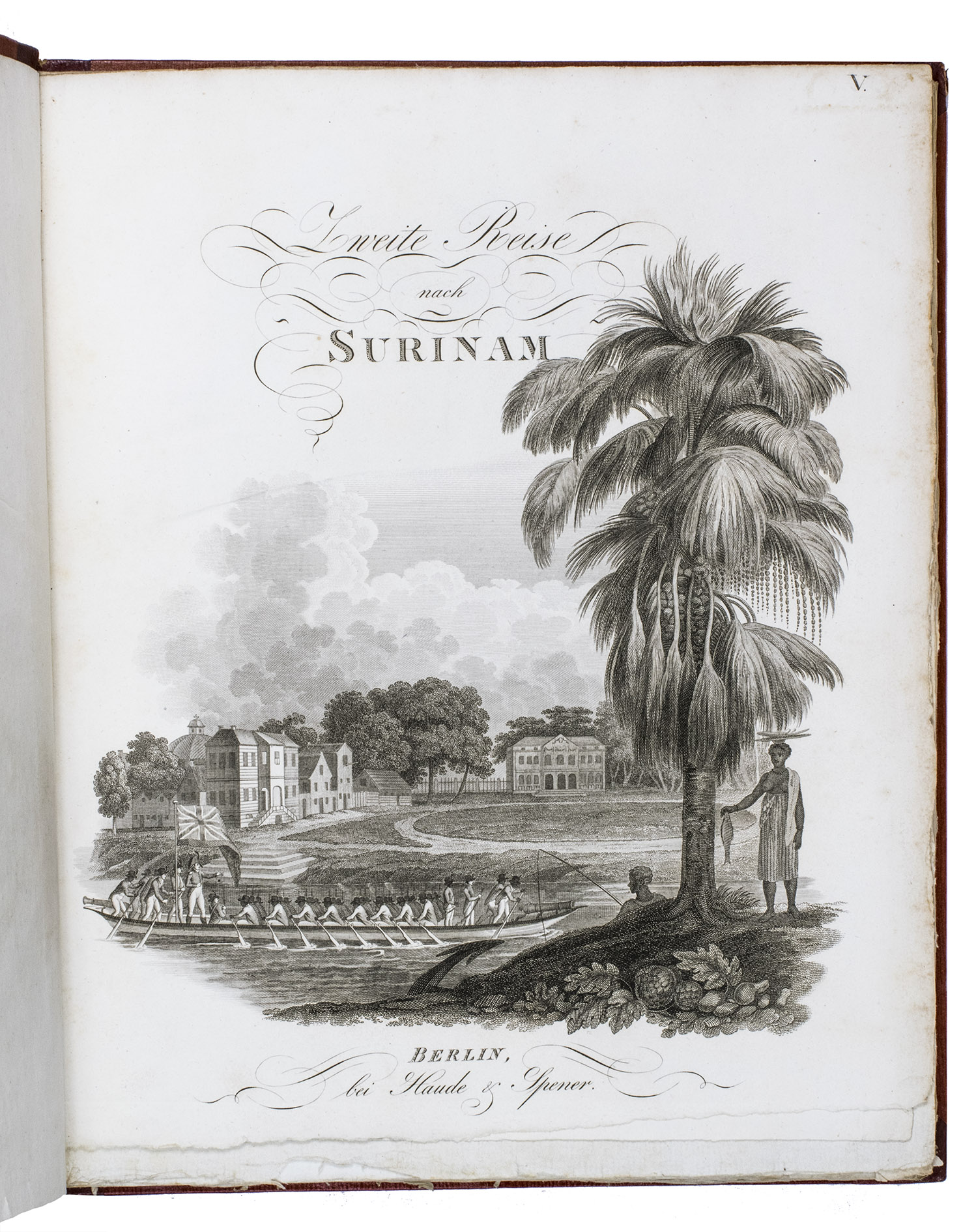 Second German edition, uncut and with wide margins, of this illustrative account of two journeys to Surinam and, on his way back to Europe, the east coast of America. The first German edition was published in Berlin in 1818. The first part, although originally written in German, was in fact first published in English with the title: A Narrative of a voyage to Surinam ... (London 1810, see Sabin 74750). A Dutch translation of this first part was published in Haarlem, in the same year as the present second German edition. The account was written in the form of 17 letters to an unknown addressee. It includes also an interesting account of the author's visit to Barbados and the cities on the east coast of America, and an appendix of 18 pages describing the plants, animals, birds, reptiles, etc. of Surinam.