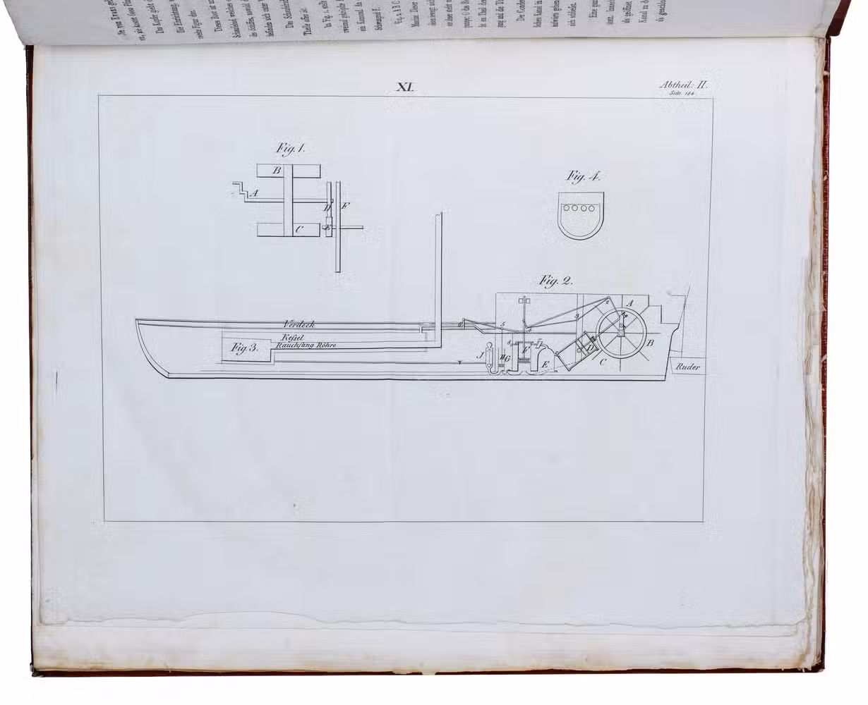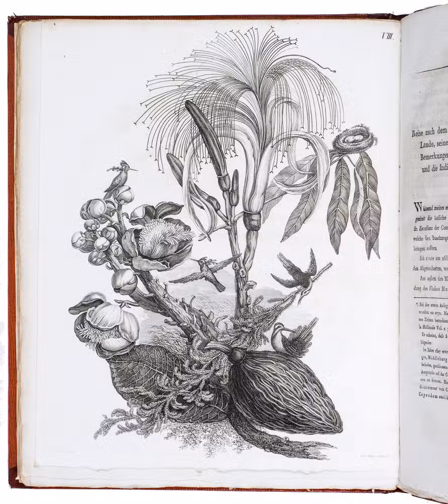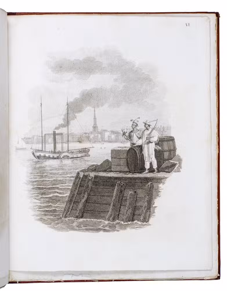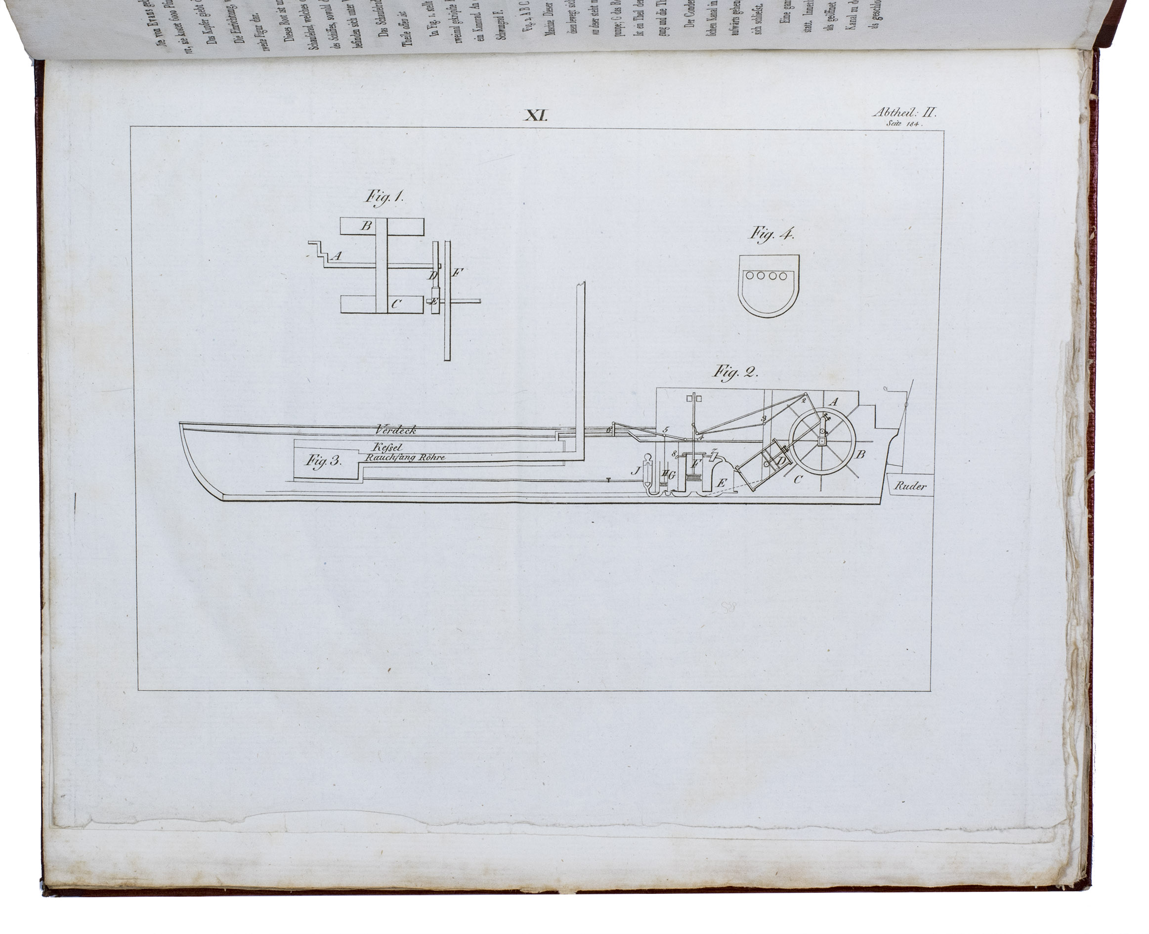 The frontispiece in volume 1 depicting the ship Jason with a dolphin hunting for a flying fish and plate IV in volume 1 of a black slave sowing cotton plants are taken from the first English edition. The other plates are engraved in Berlin and depict among other things the Governors house in Paramaribo (plate V, the illustration on the title page of volume 2), the steamer Phoenix of the second journey with a view of the city of Philadelphia in the background and two Indians in the foreground (plate VI), the map of the interior of Surinam (plate VII), the flora and fauna of Surinam (plates VIII-IX), and two plates of a steamer: plan and side view (plates X-XI).