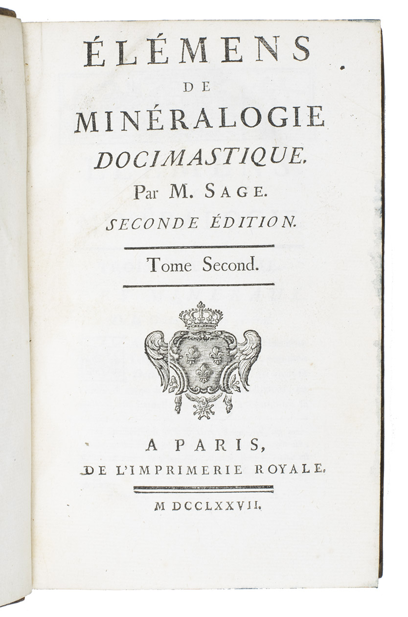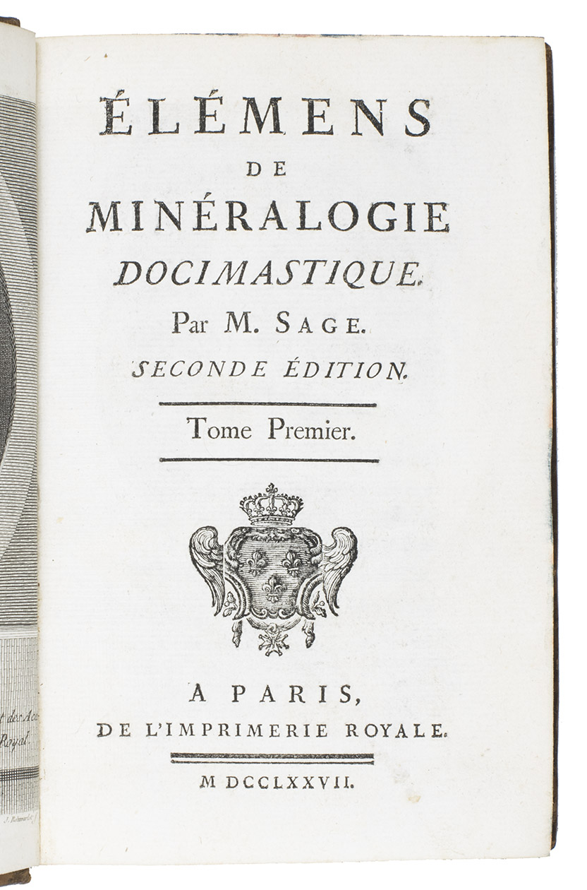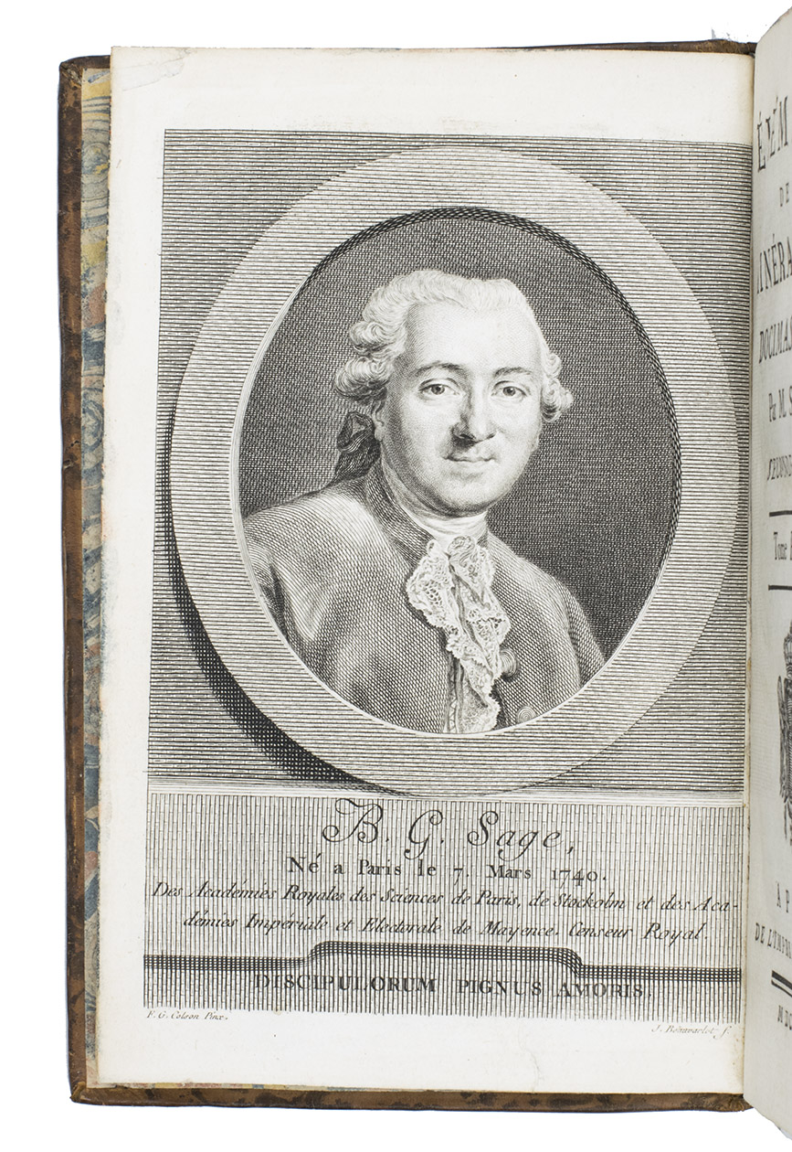 Élémens de minéralogie docimastique ... Seconde édition. Paris, Imprimerie Royale, 1777. With an engraved frontispiece portrait of B.G. Sage by J. Beauvarlet after F.G. Colson and 2 tables (1 folding).