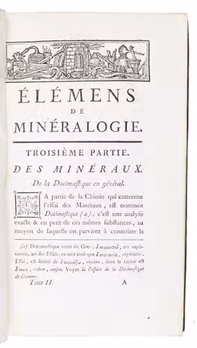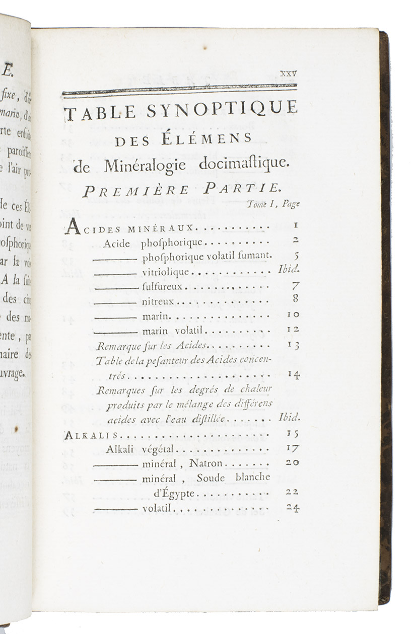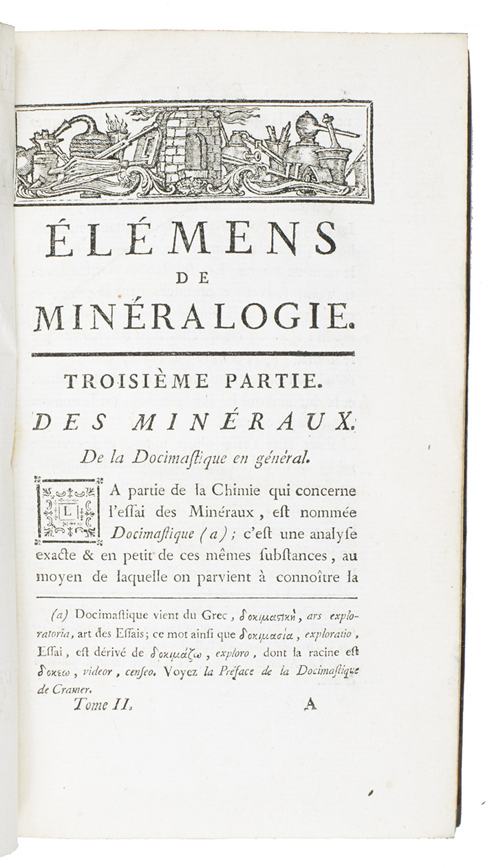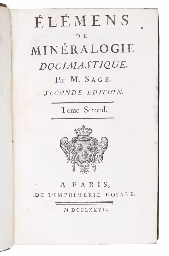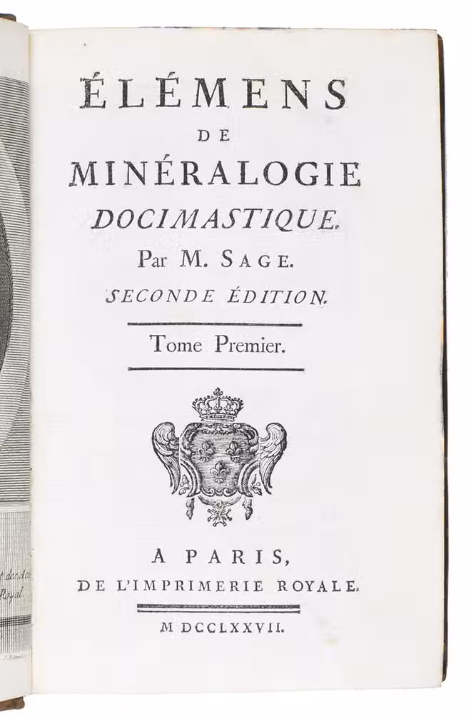 Élémens de minéralogie docimastique ... Seconde édition. Paris, Imprimerie Royale, 1777. With an engraved frontispiece portrait of B.G. Sage by J. Beauvarlet after F.G. Colson and 2 tables (1 folding).