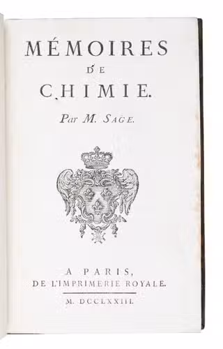 Two works on mineralogy and chemistry by the founder of the Paris École des Mines and the Museum of Mineralogy, the Élémens de minéralogie docimastique in its second, greatly expanded edition (first edition 1772) with a portrait of Sage and 2 plates, and the Mémoires de chimie in its first edition. Sage places "great importance on the combinative functions of acids, particularly the acid of phosphorus" (Sinkansas) and describes experiments he made on several gems.He worked closely on several projects with leading chemists Antoine Baumé and Antoine-Laurent de Lavoisier. As a teacher at the Academy and later the École des Mines he was highly regarded and esteemed by his students, who called him "the most distinguished chemist in France". By founding the École des Mines he laid the groundwork of a complete rejuvenation of the French mining industry, which was in a desolate state at the time. The Museum of Minerals housed at the École was based partly on Sages private collection. The present attractively bound editions in 3 volumes marks Sage's introduction into the elite of French science.