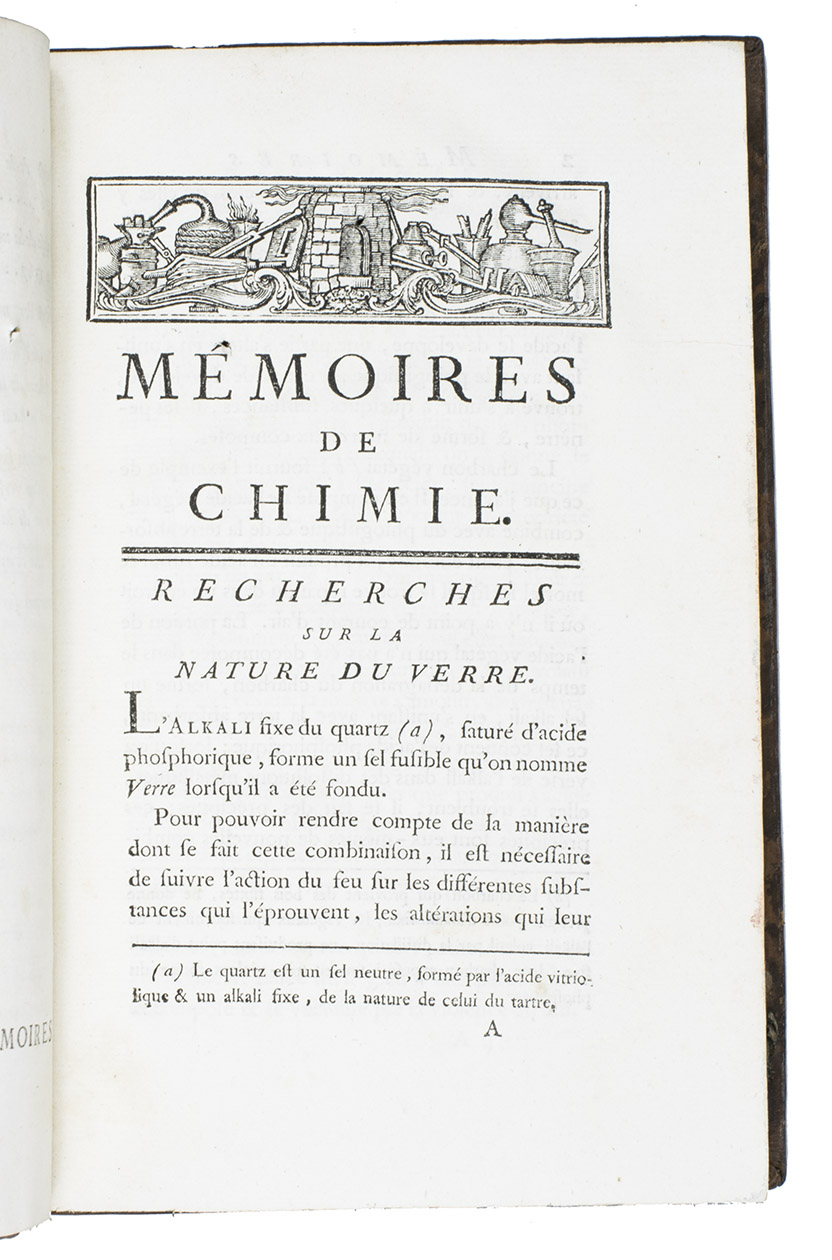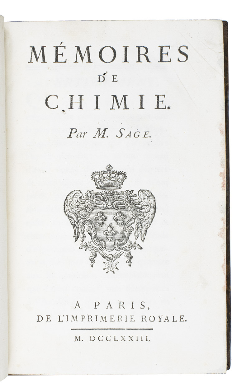 With: (2) SAGE, Balthazar-Georges. Mémoires de chimie. Paris, Imprimerie Royale, 1778. With 1 folding table. 2 works in 3 volumes (ad. 1 in 2). 8vo. Contemporary mottled calf, gold-tooled spines with red and black labels, marbled edges, marbled endpapers. XLVII, [1], 339; [2], 400, XLVI, [2]; VII, 262, XXXVIII pp.