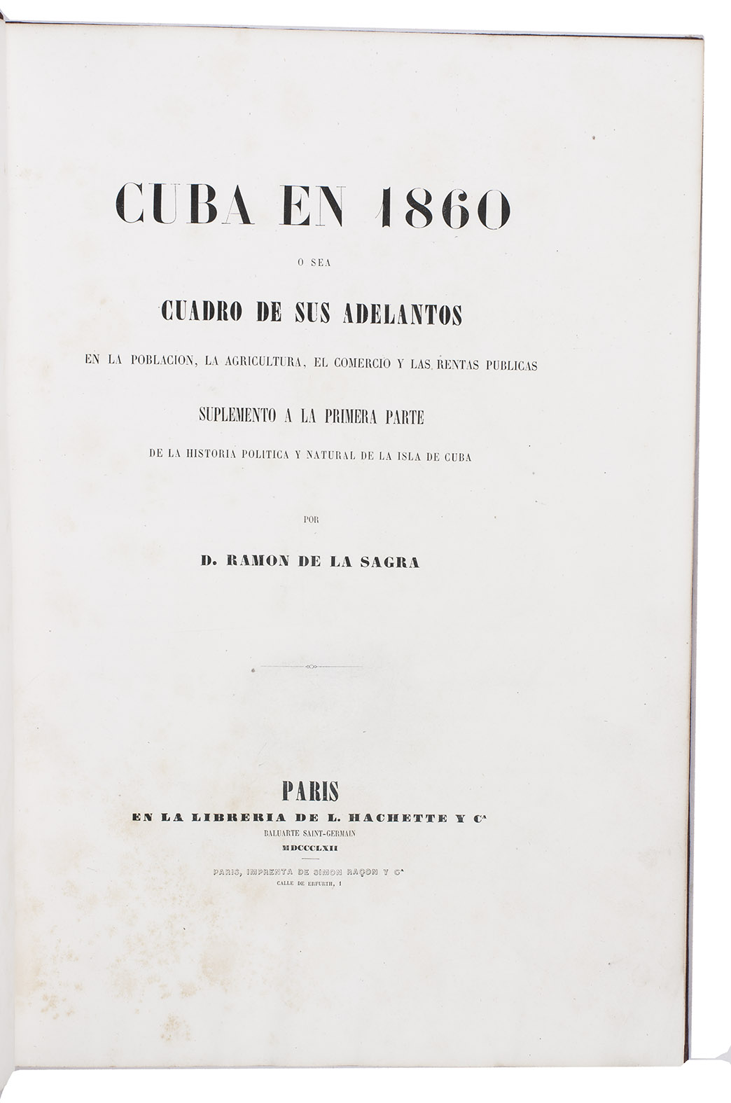 Cuba en 1860 o sea cuadro de sus adelantos en la poblacion, la agricultura, el comercio y las rentas publicas. Supplemento a la primera parte de la Historia politica y natural de la Isla de Cuba.