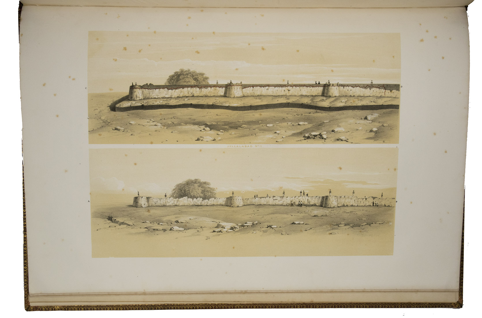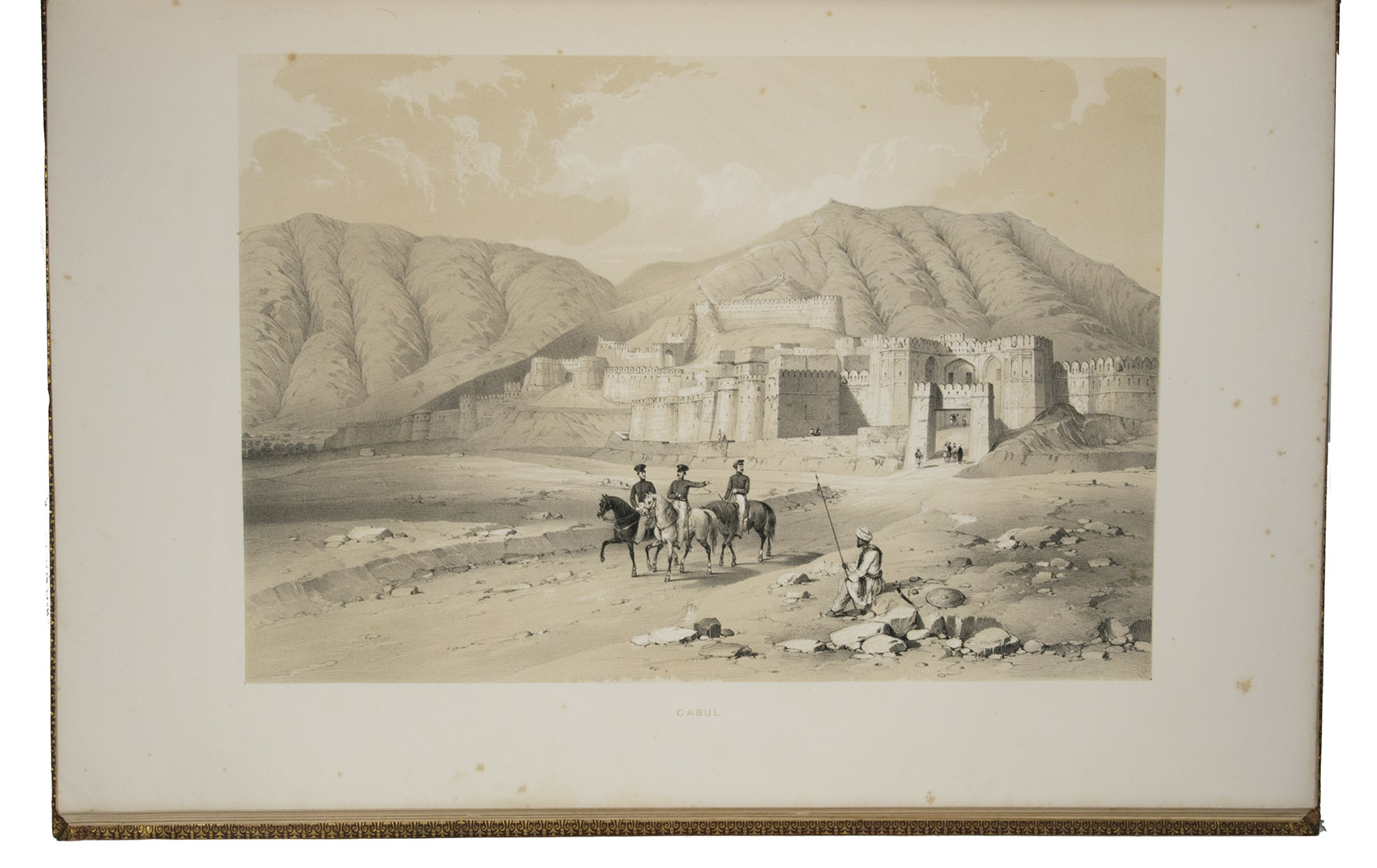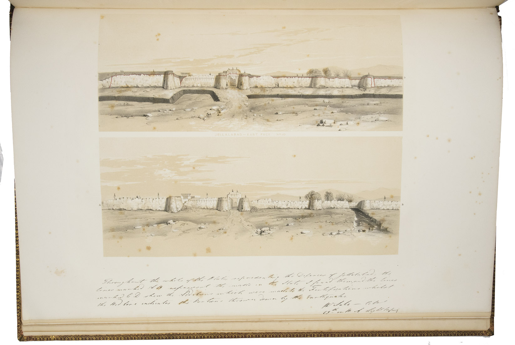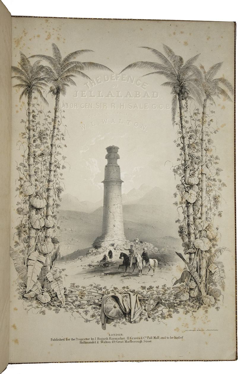The first and only edition of a grand and spectacular visual presentation (there are only five pages of text) of the city of Jalalabad and its fortifications in eastern Afghanistan and related sites as far away as Kabul. The illustrated title-page (image size 45 x 35 cm) shows the tower known as Alexanders column, with mountains and clouds in the background and several people at its foot (including two on horseback in the foreground: a British officer and turbaned man), the whole framed by palm trees, other plants and military attributes. The first 11 leaves of views (2 half-page and 10 full-page, the latter mostly with image size 26.5 x 37 cm) offer meticulously detailed views of sites in and related to Jalalabad, including four in and around Kabul. These show the architecture (including minarets, fortifications and the building where the British were held prisoner) as well as British and Afghan people engaged in military activities and trade. The 11 numbered plates that follow show two panoramas each (nos. 1 and 10 reproducing a hand-written caption) showing Jalalabads fortifications before (below) and after (above) the repairs and improvements undertaken by Sale. A red line in the upper views indicates the parts that had been destroyed by an earthquake.