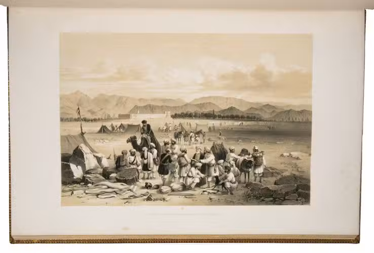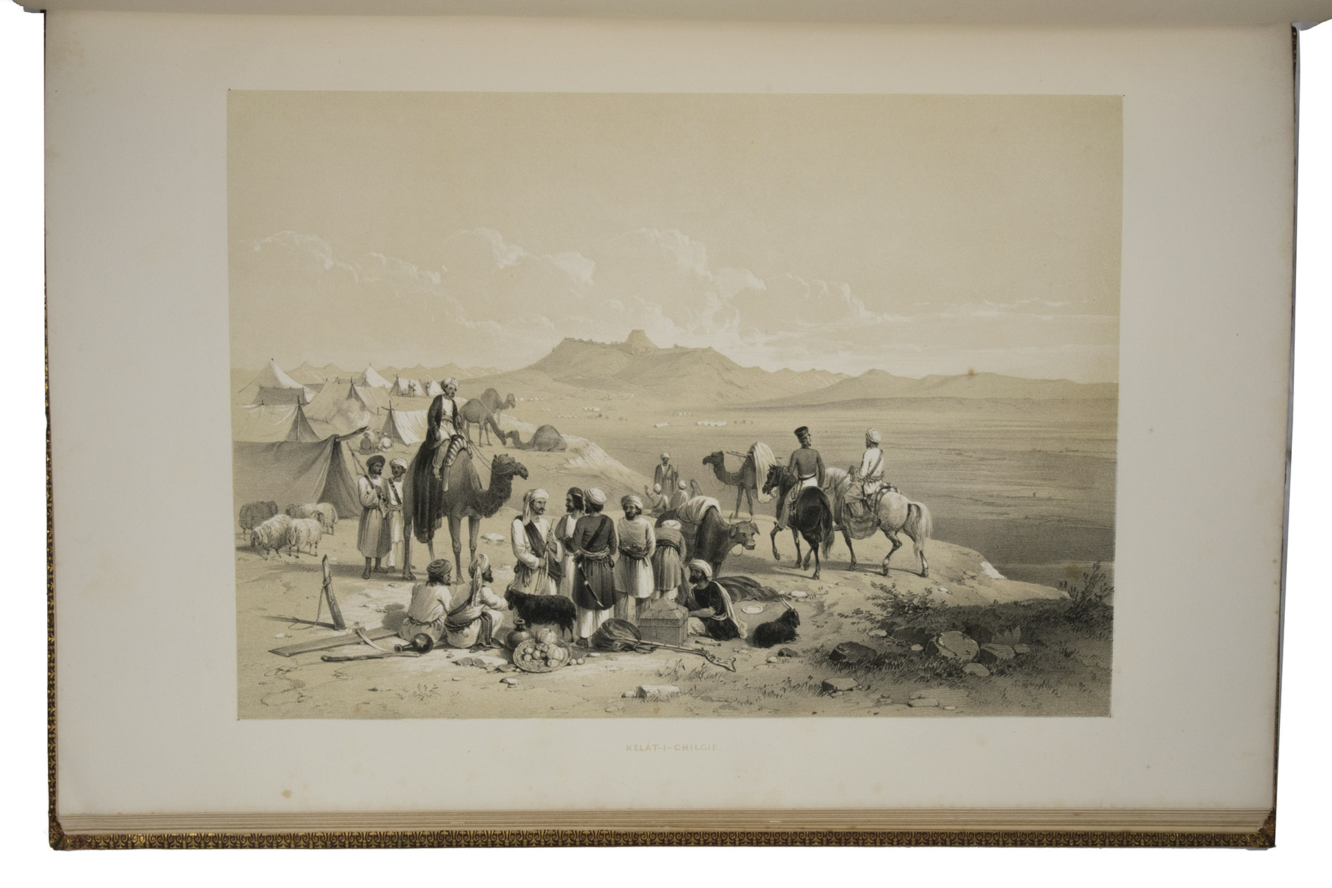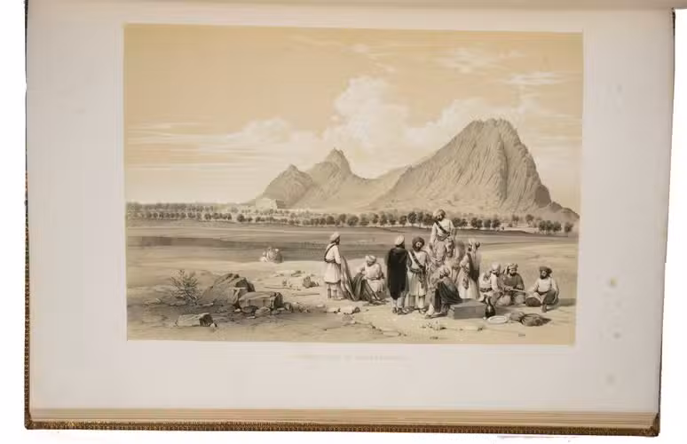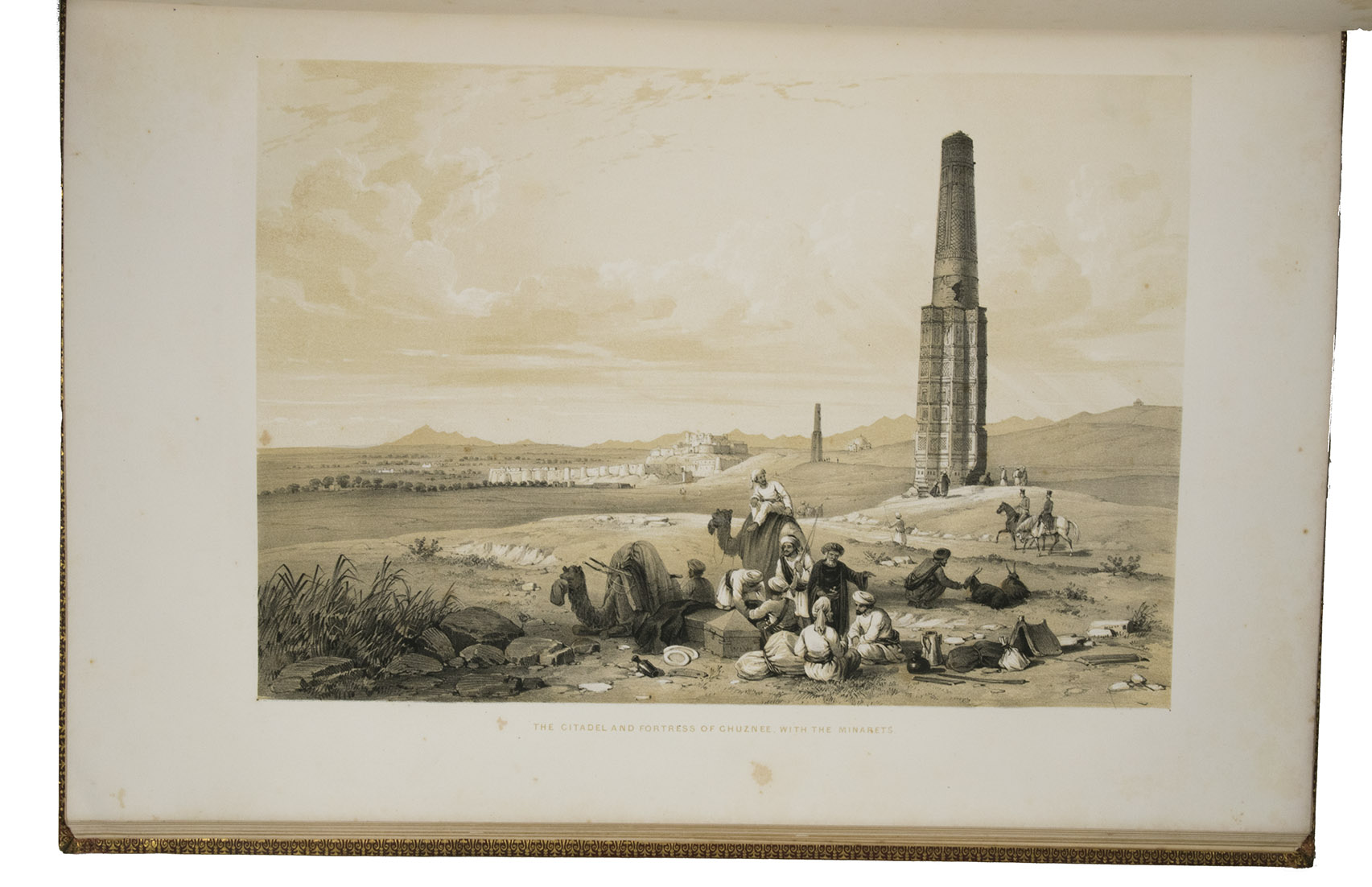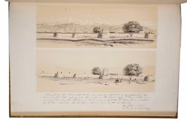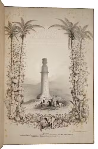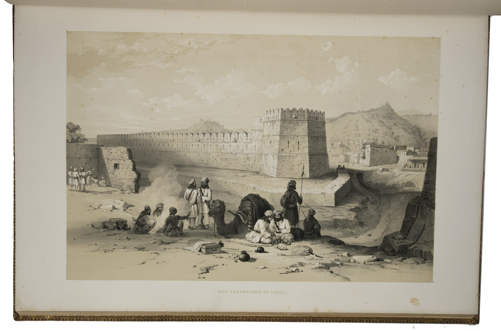 The first and only edition of a grand and spectacular visual presentation (there are only five pages of text) of the city of Jalalabad and its fortifications in eastern Afghanistan and related sites as far away as Kabul. The illustrated title-page (image size 45 x 35 cm) shows the tower known as Alexanders column, with mountains and clouds in the background and several people at its foot (including two on horseback in the foreground: a British officer and turbaned man), the whole framed by palm trees, other plants and military attributes. The first 11 leaves of views (2 half-page and 10 full-page, the latter mostly with image size 26.5 x 37 cm) offer meticulously detailed views of sites in and related to Jalalabad, including four in and around Kabul. These show the architecture (including minarets, fortifications and the building where the British were held prisoner) as well as British and Afghan people engaged in military activities and trade. The 11 numbered plates that follow show two panoramas each (nos. 1 and 10 reproducing a hand-written caption) showing Jalalabads fortifications before (below) and after (above) the repairs and improvements undertaken by Sale. A red line in the upper views indicates the parts that had been destroyed by an earthquake.
