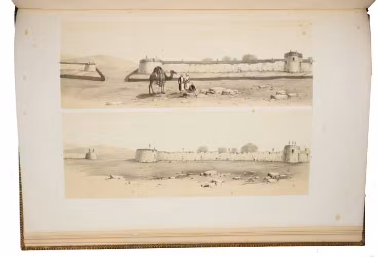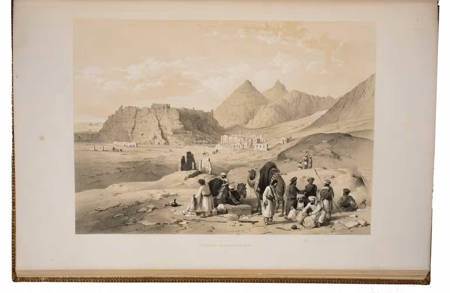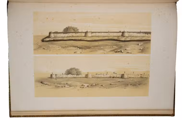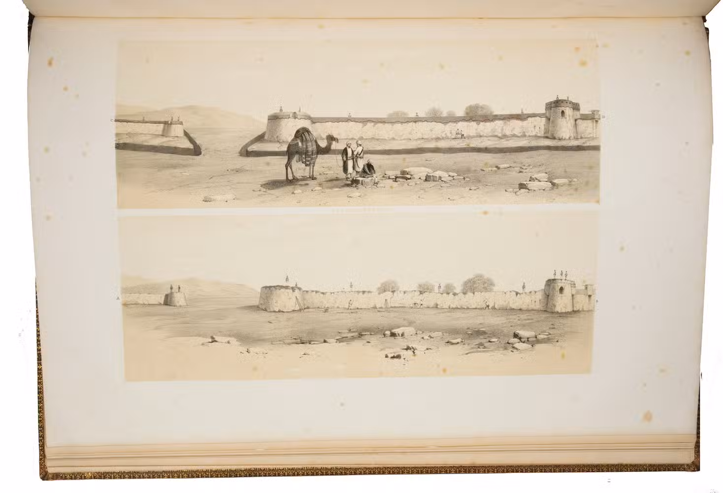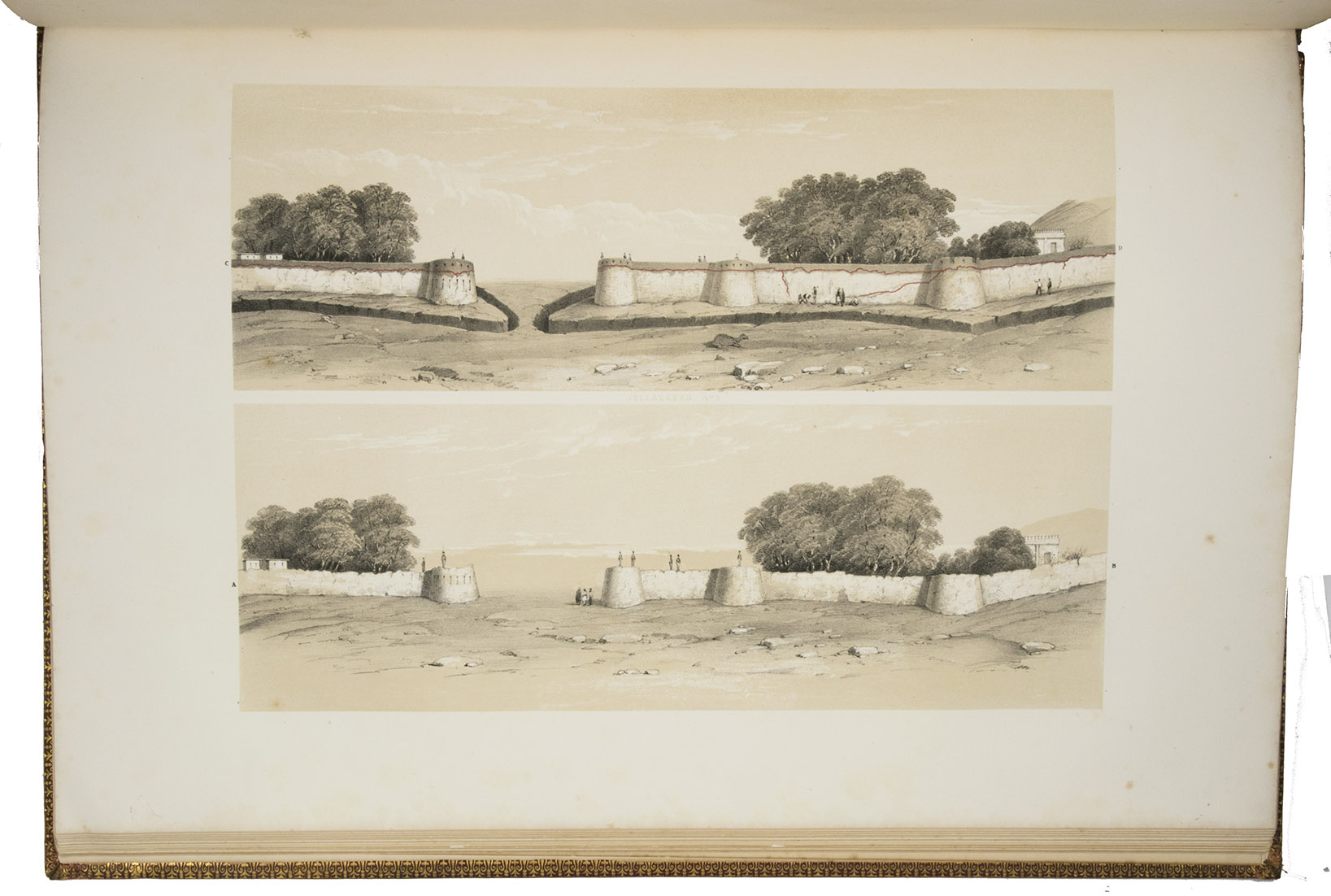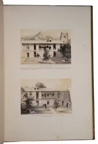The first and only edition of a grand and spectacular visual presentation (there are only five pages of text) of the city of Jalalabad and its fortifications in eastern Afghanistan and related sites as far away as Kabul. The illustrated title-page (image size 45 x 35 cm) shows the tower known as Alexanders column, with mountains and clouds in the background and several people at its foot (including two on horseback in the foreground: a British officer and turbaned man), the whole framed by palm trees, other plants and military attributes. The first 11 leaves of views (2 half-page and 10 full-page, the latter mostly with image size 26.5 x 37 cm) offer meticulously detailed views of sites in and related to Jalalabad, including four in and around Kabul. These show the architecture (including minarets, fortifications and the building where the British were held prisoner) as well as British and Afghan people engaged in military activities and trade. The 11 numbered plates that follow show two panoramas each (nos. 1 and 10 reproducing a hand-written caption) showing Jalalabads fortifications before (below) and after (above) the repairs and improvements undertaken by Sale. A red line in the upper views indicates the parts that had been destroyed by an earthquake.