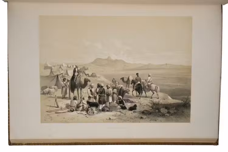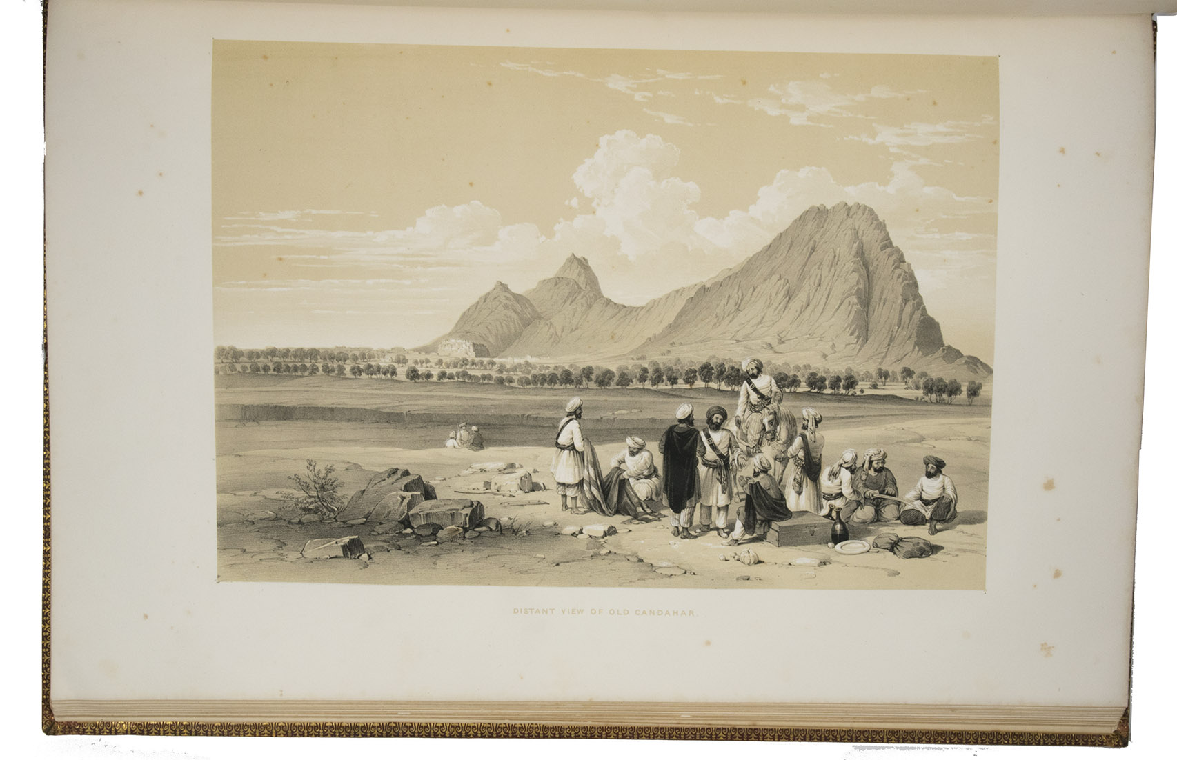 With an armorial bookplate showing the crest and motto ("sans changer") of the Earls of Derby, probably the 14th Earl, Edward George Geoffrey Smith-Stanley (1799-1869), Conservative Prime Minister three times in the years 1852-1868. With minor foxing, slightly more in the frontispiece and much more in one full-page plate (Babas garden, whose paper is not as thick as the others), but otherwise in very good condition. The frontispiece (together with the 2 preceding free endleaves) has separated from the bookblock, the hinges have been restored and the binding shows a few scuff marks, but the binding remains in good condition. Magnificent and detailed tinted lithographs of buildings, fortifications, terrain and life in and around Jalalabad (and Kabul) in Afghanistan ca. 1845. Thomson, The exotic and the beautiful (Bobins coll.) 268; WorldCat (3 copies?); not in Abbey, Travel.