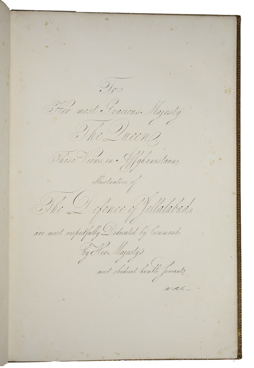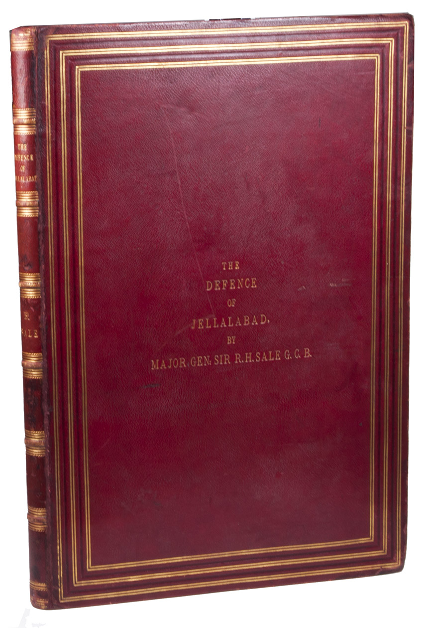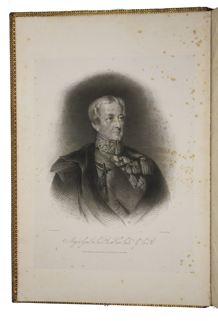 London, Joseph Hogarth, Henry Graves & Co., and sold by Hullmandel & Walton, [1845/46]. 1mo (full-sheet leaves) (54 x 37 cm). With a lithographed frontispiece portrait of Sale by Thomas Fairl and after a painting by Scarlet Davis, a lithographed illustrated title-page, a lithographed dedication to Queen Victoria (reproducing Sales hand-written and signed dedication), a double-page "Plan of Jellalabad" (51.5 x 60 cm, lithographed by S. Leith in Edinburgh) and 34 tinted lithographic views of the city and its fortifications (in landscape format) on 22 leaves.