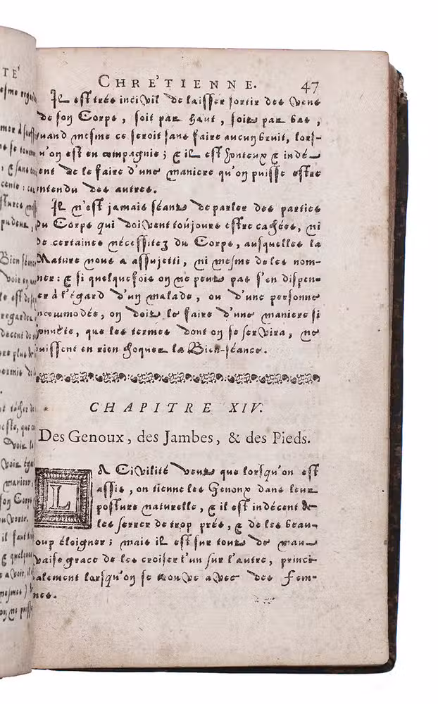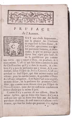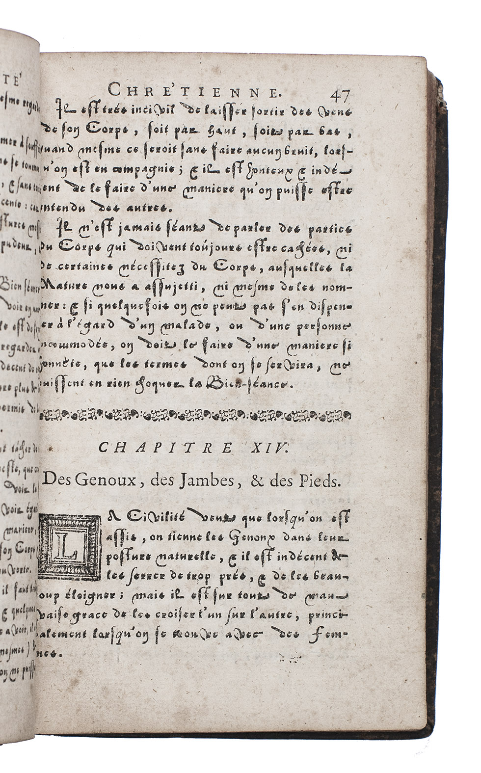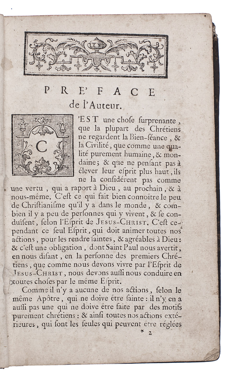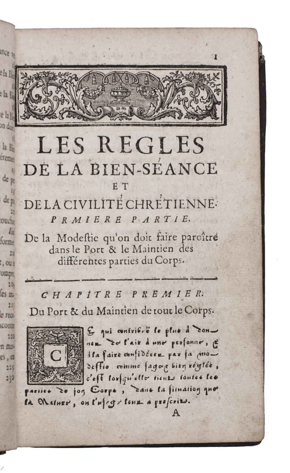 Rare early Rouen edition, with the main text in civilité type, of a famous French courtesy book by the French priest Jean-Baptiste de La Salle (1651-1719), who was beatified in 1888. It opens with a preface, a privilege, and a table of contents, set in roman type. The main text, in civilité type, is divided into two parts, each containing several chapters teaching not only good manners and politeness in society, but good and balanced conduct in all things, out of respect to oneself, one's neighbour and God. Modesty, respect, unity and charity, all dependent on the context of time, place and person are here presented as the "Christian Courtesy". The book was mostly intended for use at the schools of the Christian Brothers (Institute of the Brothers of the Christian Schools), founded by La Salle.
