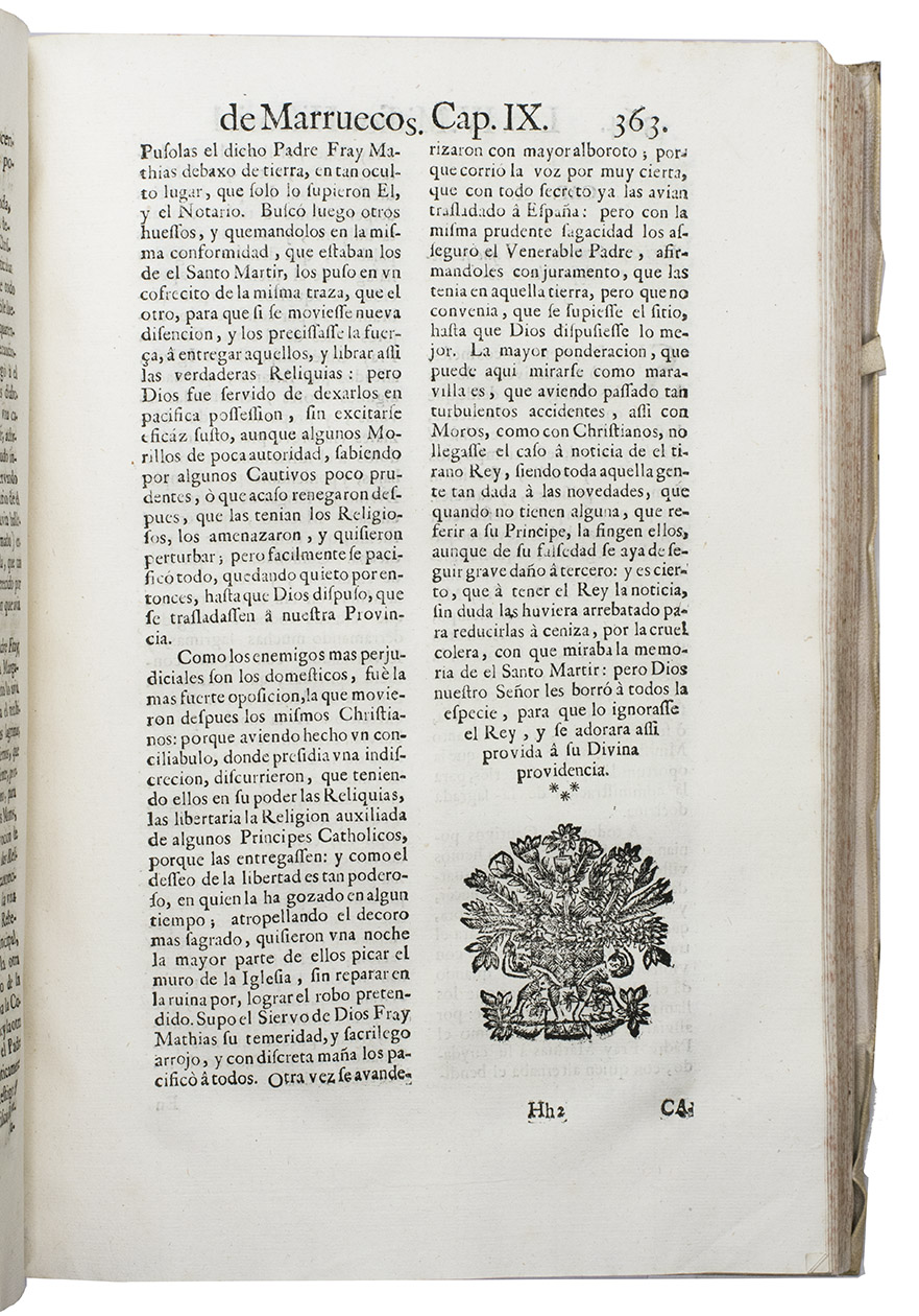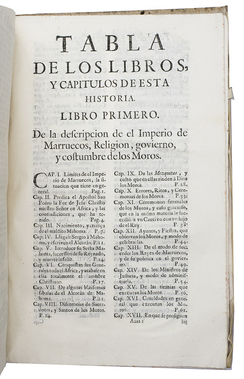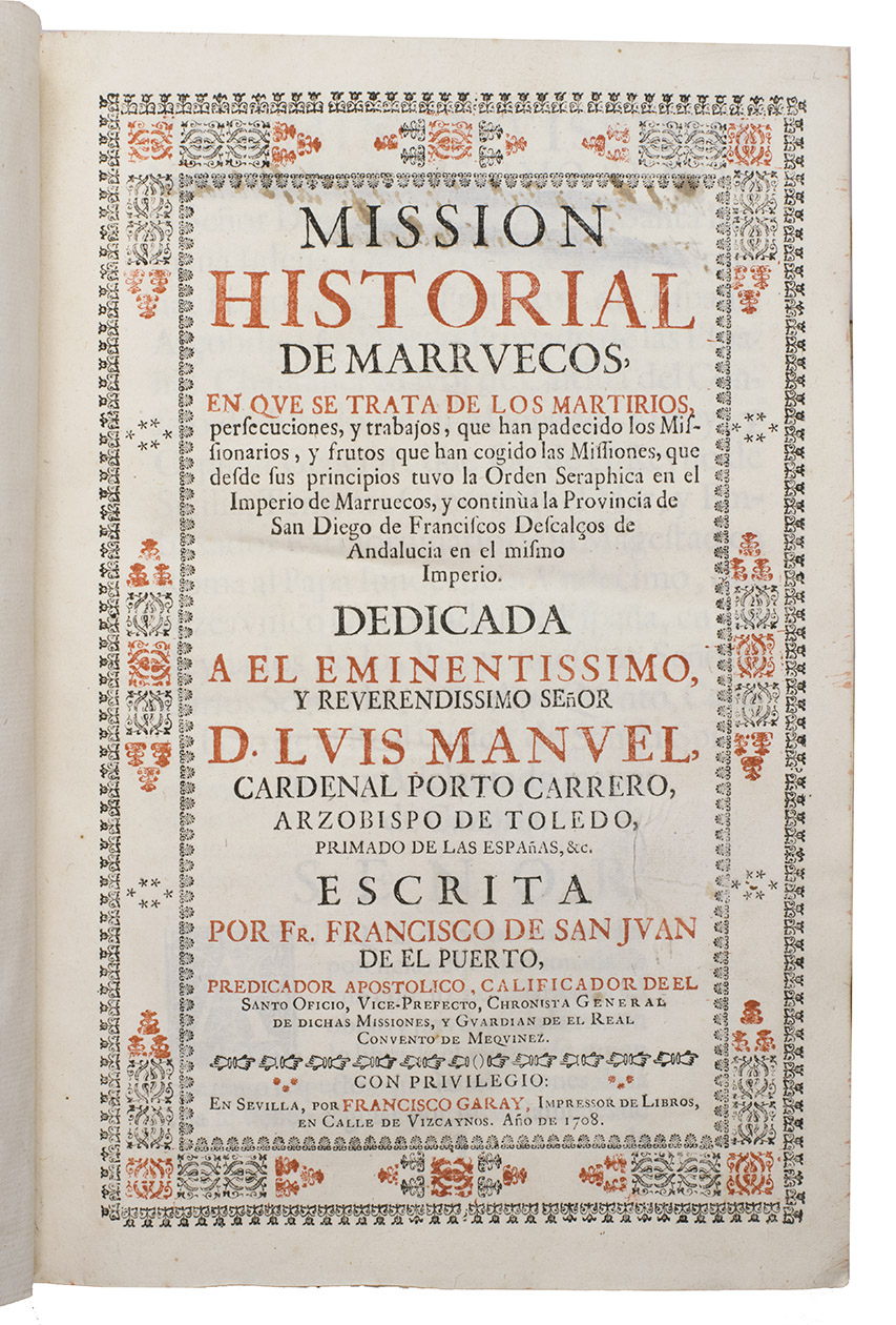 First and only edition of a very detailed history of the Franciscan mission in Morocco, by Francisco de Jesus Maria de San Juan del Puerto (active ca. 1700-1725). The Franciscans arrived in Marrakesh already in 1220 when Saint Berard of Carbio and four other Franciscans were martyred by Moslems in Marrakesh. The present history presents many biographies of Franciscan martyrs at the hands of Moroccan Moslems through the ages. Along the way it gives a gives a great deal of information about Morocco and the north coast of Africa, the religion, administration and customs of the Moors, the Jewish quarter of Marrakesh and activities in other parts of North Africa. It continues up to the author's own time and for that later period no doubt made use of many sources that have not survived and perhaps even the author's own experiences, making it an essential primary source.