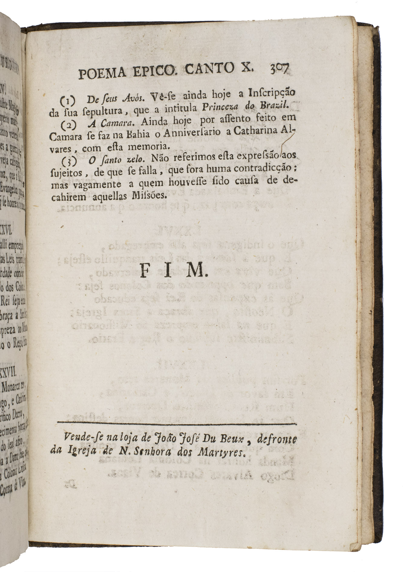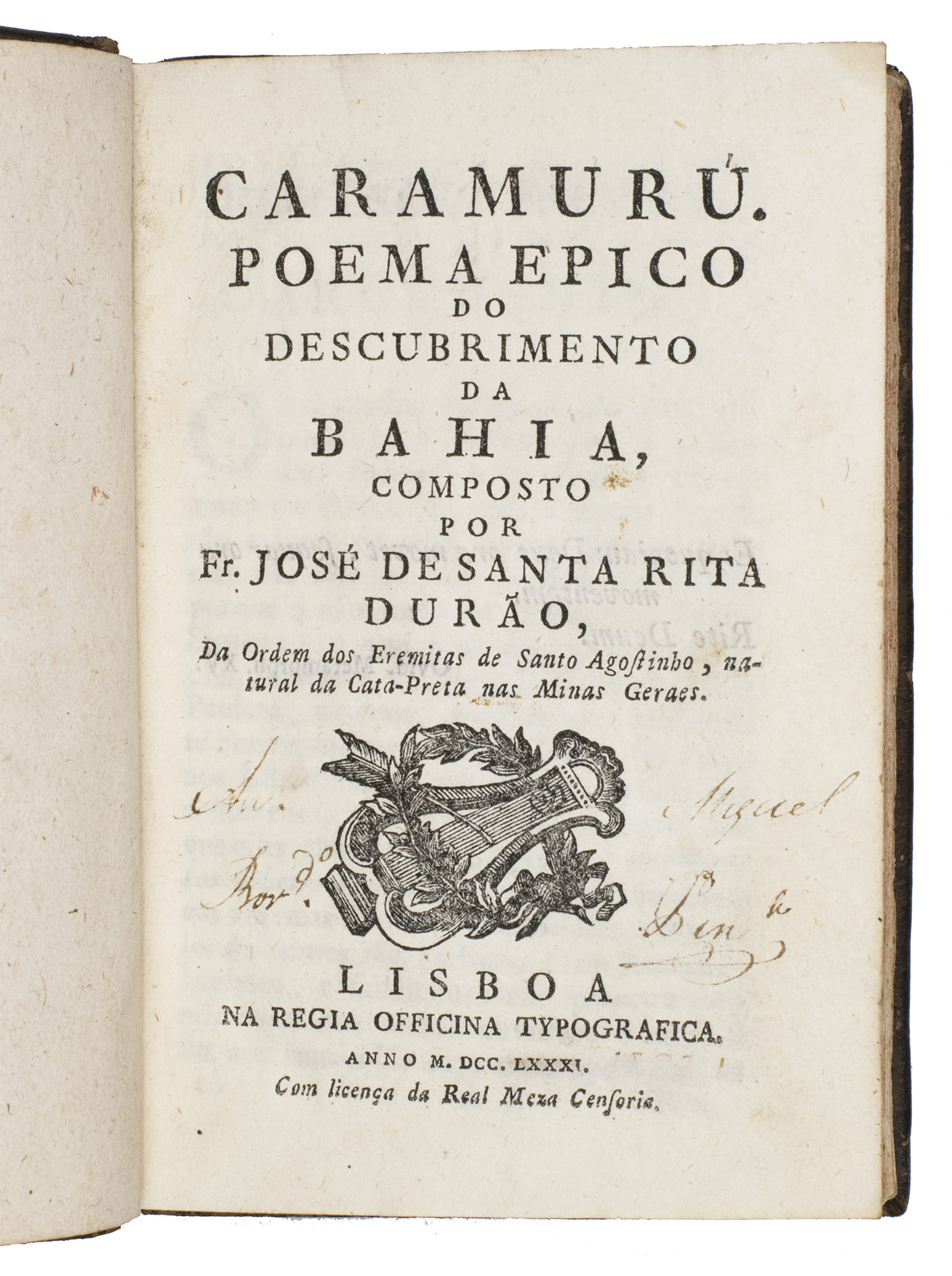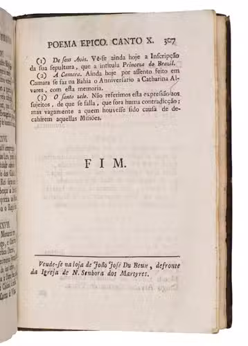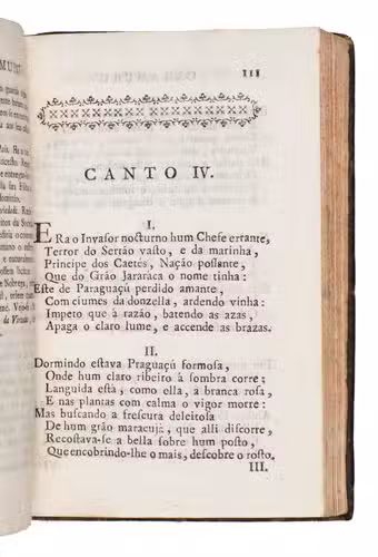 First edition of this landmark of Brazilian literature; one of the most famous Indianist works of Brazilian Neoclassicism. The poem recounts the story of Diogo Álvares Correia, a Portuguese sailor shipwrecked on the Brazilian coast who becomes known as Caramuru among the Indigenous Tupinambá after impressing them with firearms. He lives among them, marries Paraguaçu, and serves as a mediator between Indigenous society and the Portuguese, symbolising the early encounter between Europe and Brazil. Through epic conventions, prophecies, and Christian imagery, the poem presents the Portuguese colonisation of Bahia as divinely guided, blending historical events with myth to portray the origins of colonial Brazil.