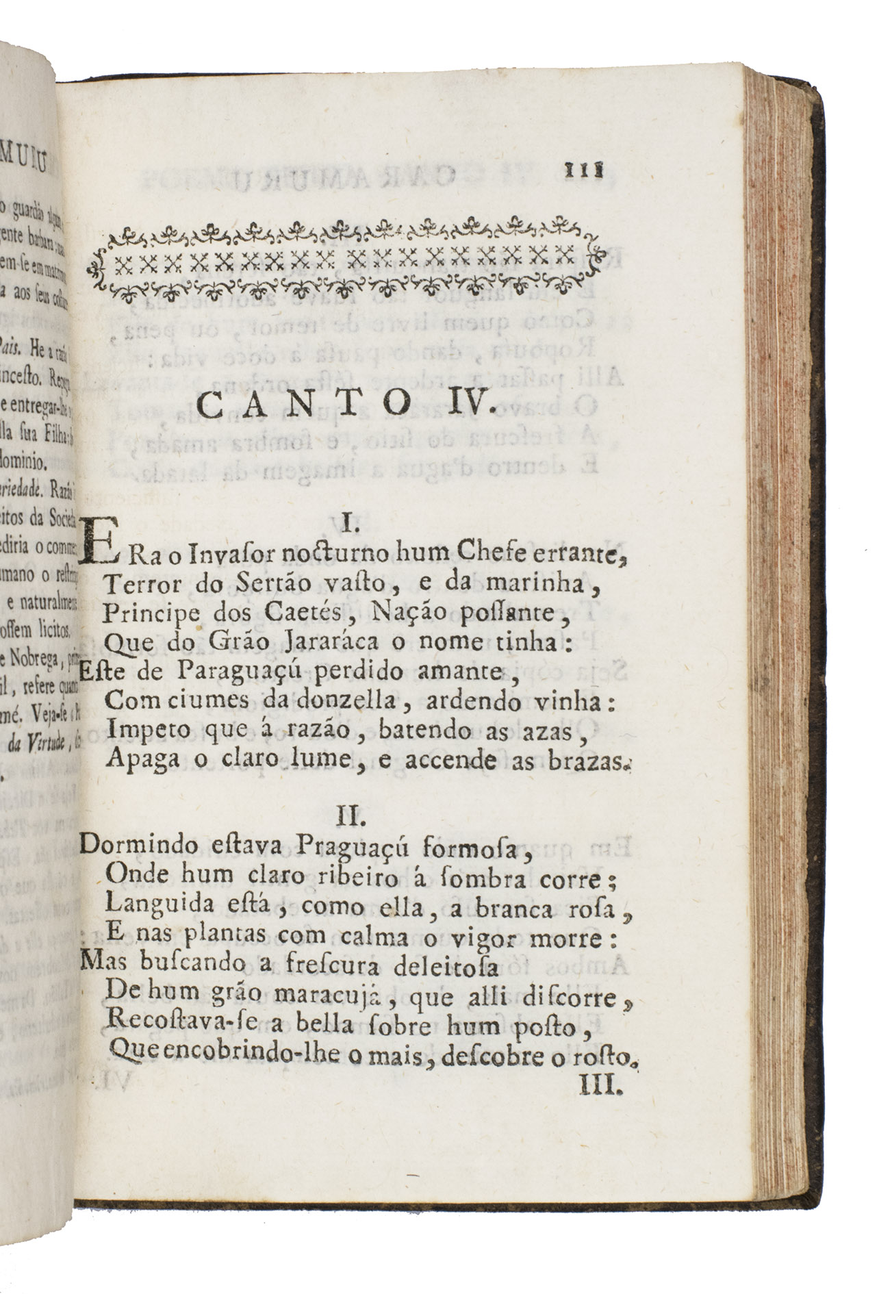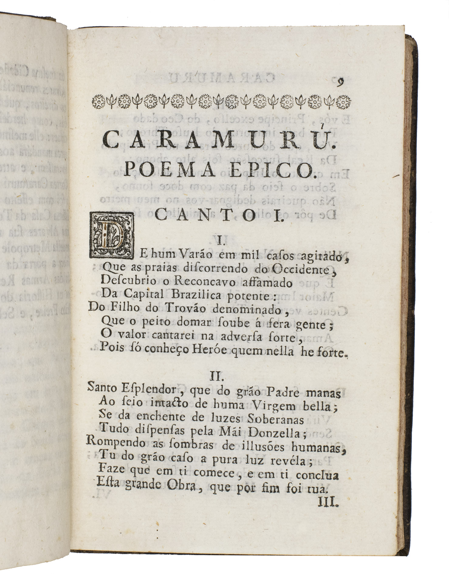 Lisbon, Na Regia Officina Typographica, 1781. 8vo. With a woodcut vignette on the title page, a woodcut decorated initial at the start of canto 1, and headpieces built up from typographic ornaments at the start of each canto. Contemporary brown sprinkled calf, gold-tooled spine with a red morocco title label lettered in gold, red sprinkled edges. 307, [1 blank] pp.