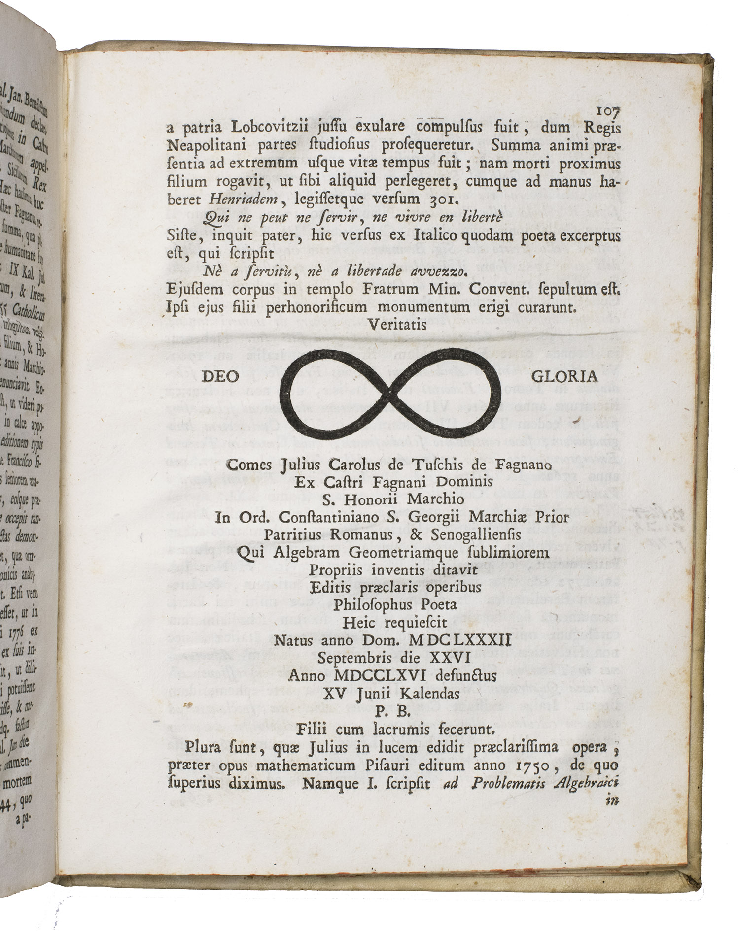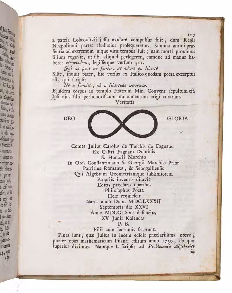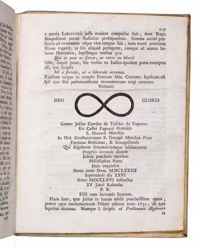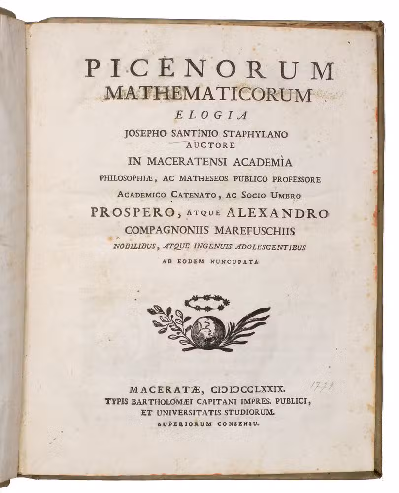 Rare first and only edition of this bio-bibliographical work discussing important mathematicians and other scientists from the province Piceno, Italy, rom the 16th to the 18th century. Included are, among others, Antonius Accursi, Gregorius Ammiani, Romulus Brogli, Saladinus Ferri, and Democritus Vicomanni. The work is preceded by a dedication to Prospero and Alexandro Marefuschiis, dated Macerata, 1 August 1779 and a preface by the author. A list of errata can be found at the end.