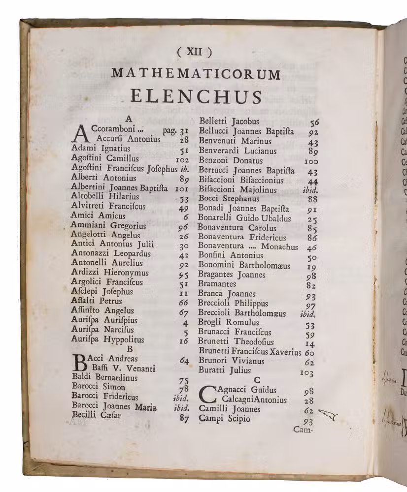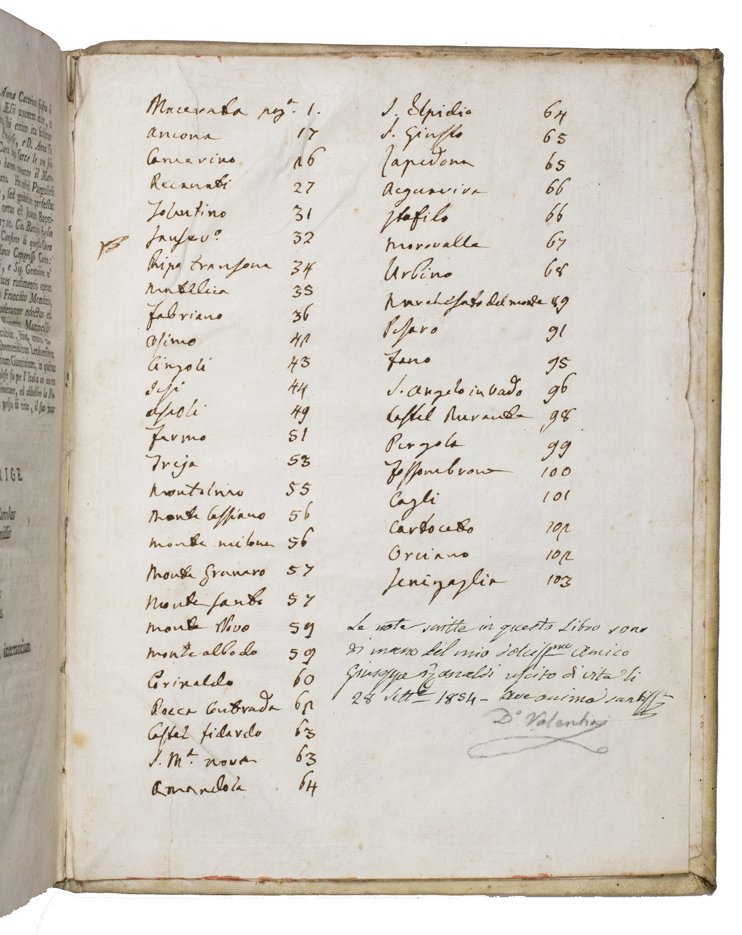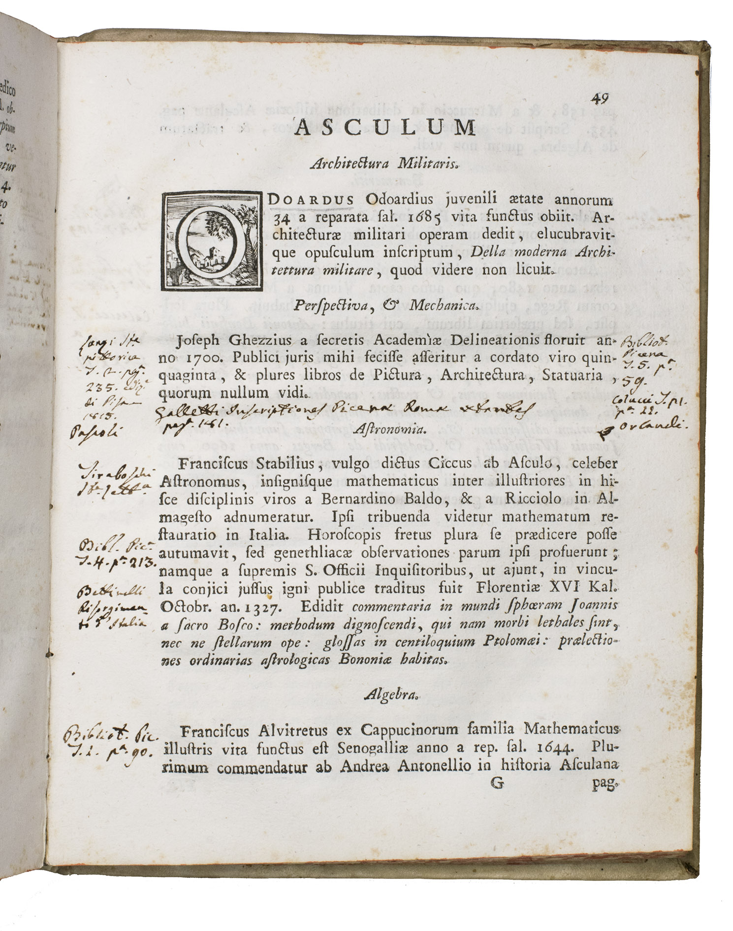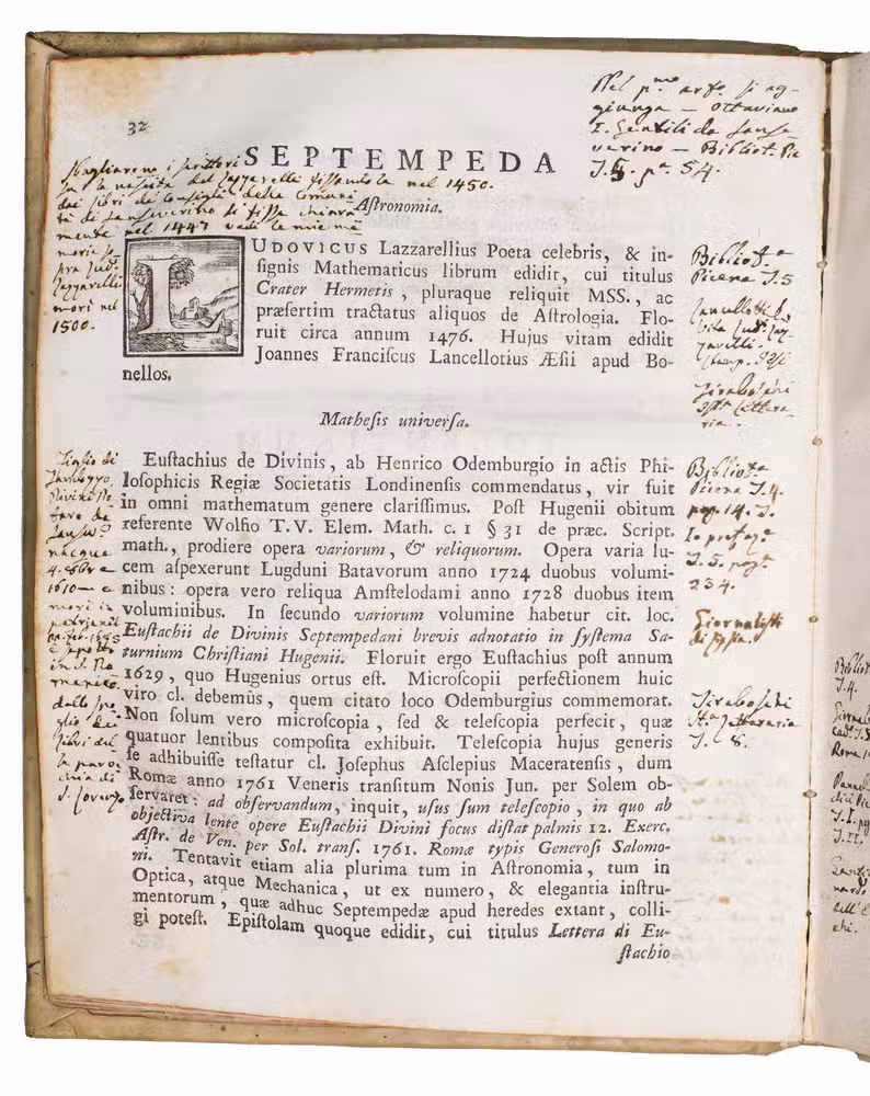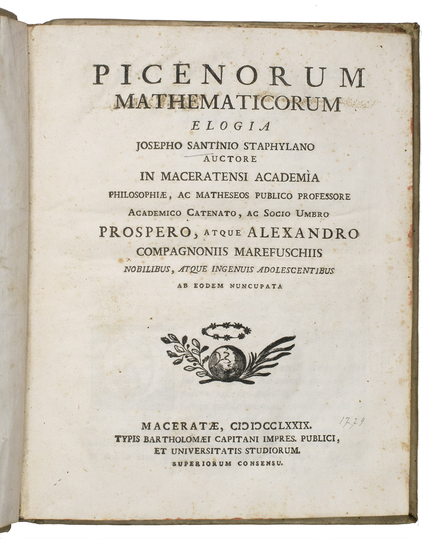 The work is written by Giuseppe Santini (1735-1796), professor of philosophy and mathematics at the University of Macerata. The present work is his most well-known. Our copy contains numerous marginal annotations in ink and an index on the last flyleaf in near-contemporary handwriting. A manuscript annotation on the last flyleaf attributes these notes to Giuseppe Ranaldi (1790-1854), who was a historian, book collector, and author from San Severino Marche.