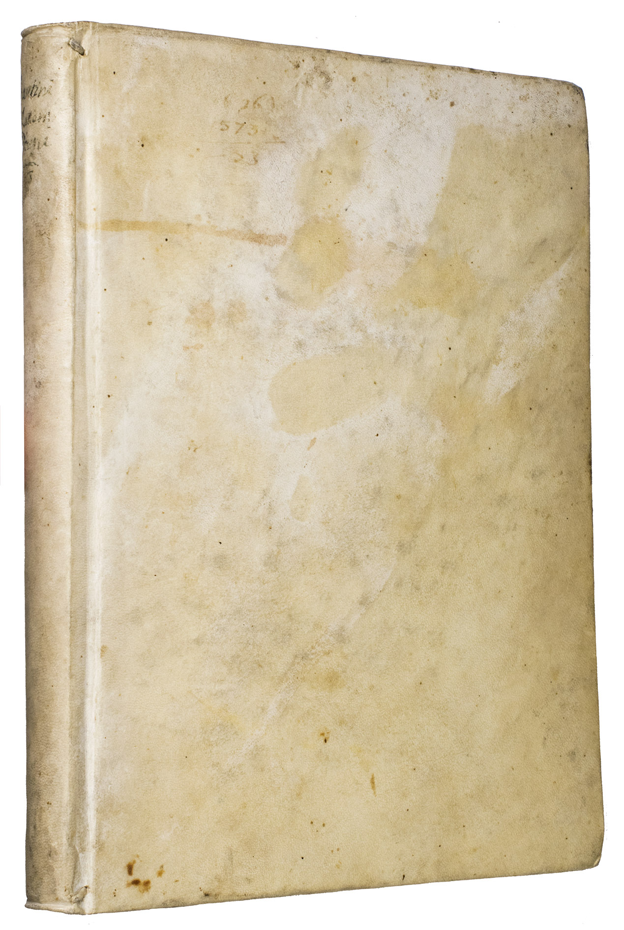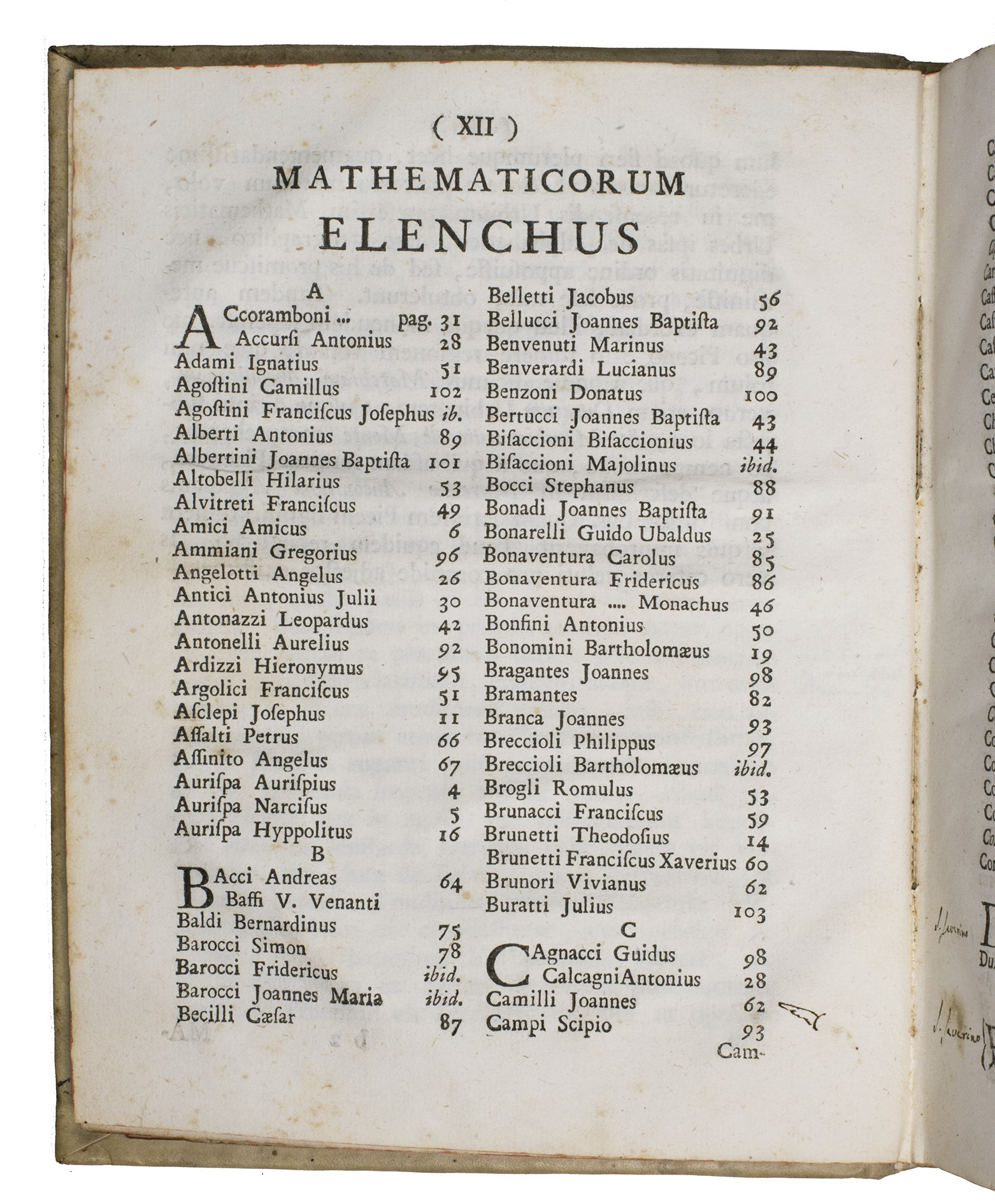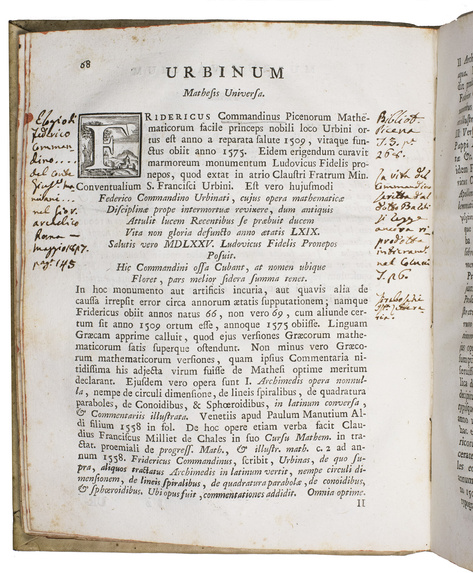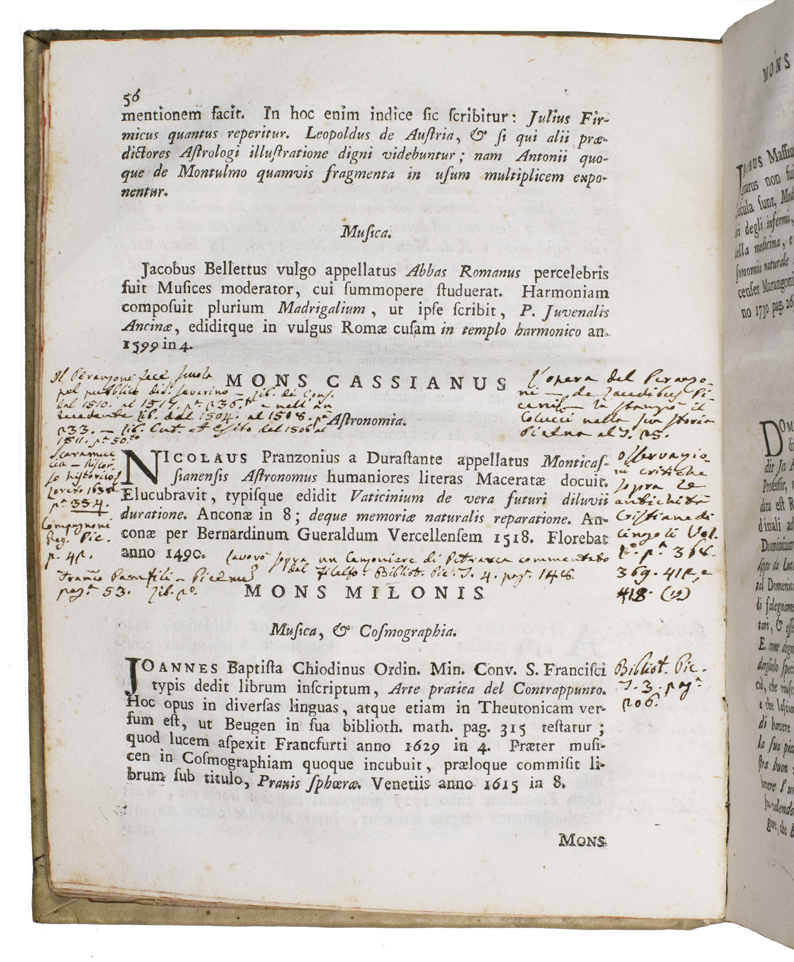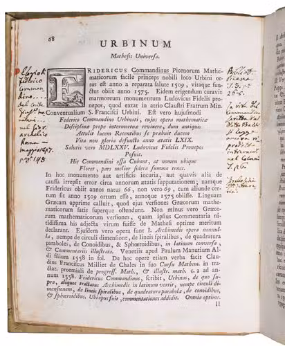 The work is written by Giuseppe Santini (1735-1796), professor of philosophy and mathematics at the University of Macerata. The present work is his most well-known. Our copy contains numerous marginal annotations in ink and an index on the last flyleaf in near-contemporary handwriting. A manuscript annotation on the last flyleaf attributes these notes to Giuseppe Ranaldi (1790-1854), who was a historian, book collector, and author from San Severino Marche.