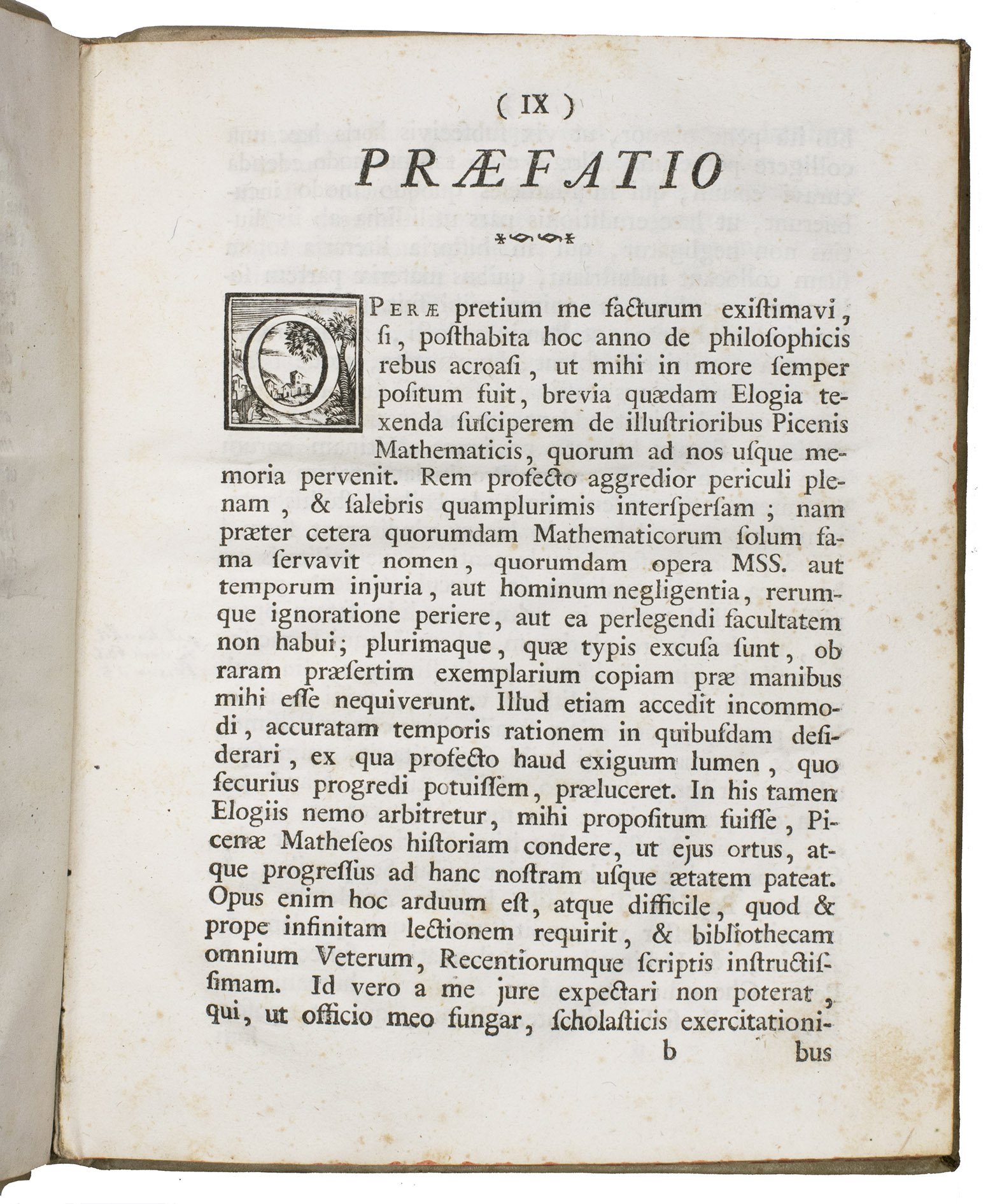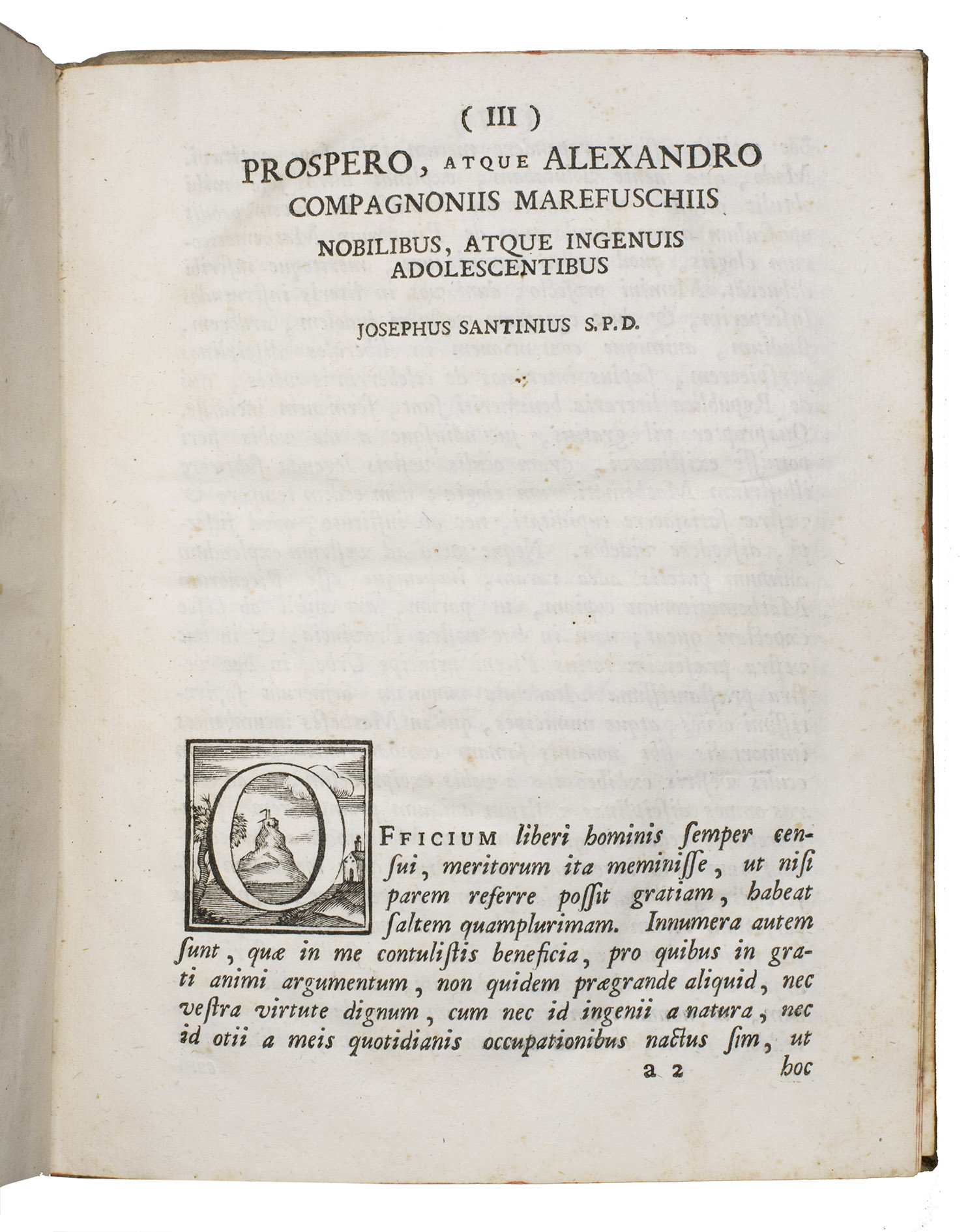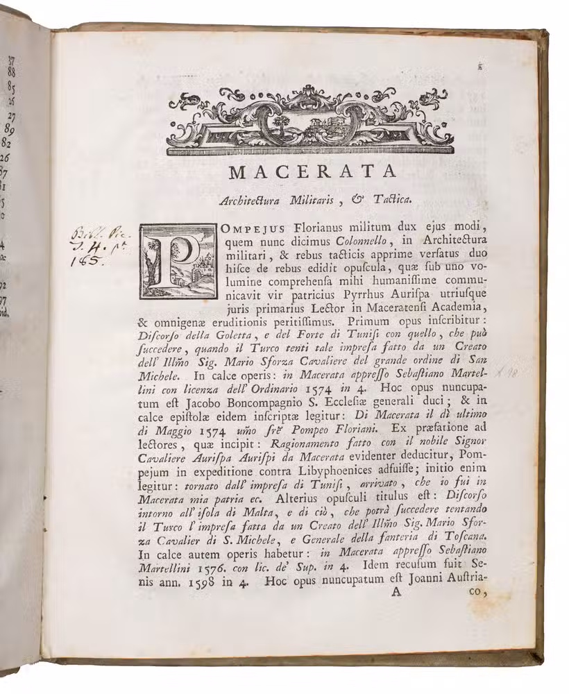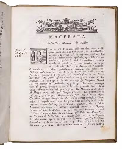 Macerata, Bartolomeo Capitani, 1779. 4to. With a woodcut ornament on the title page, 1 illustration in the text, 23 decorated woodcut initials, and a woodcut headpiece. Contemporary vellum with the manuscript title on the spine, red mottled edges. XVI, 112 pp.