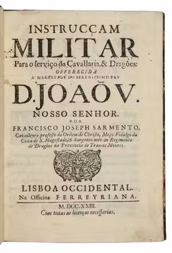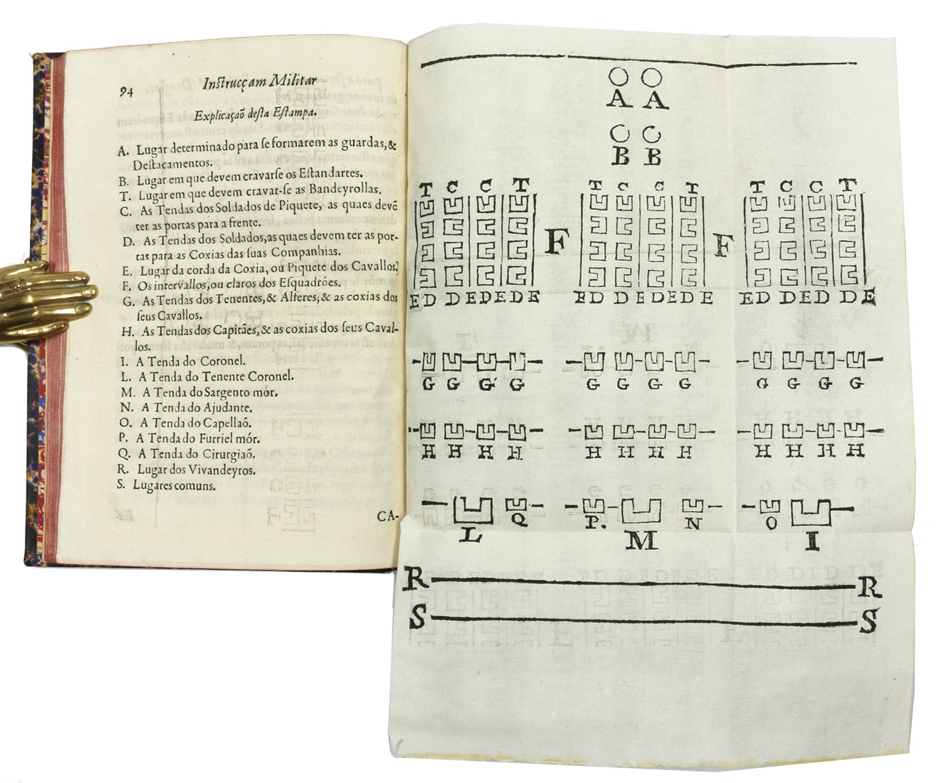 Very rare first and only edition of a manual for cavalry and dragoons by Major General Francisco Joseph Sarmento, governor of the province of Tras-os-Montes in northeastern Portugal. It includes instructions for various ranks, explanations of weaponry, marches and drills, as well as advice on approaching the enemy in battle formation. The plate shows the proper layout of a military camp with the positions of flags and tents for captains and soldiers, as well as those for the surgeon and priest.