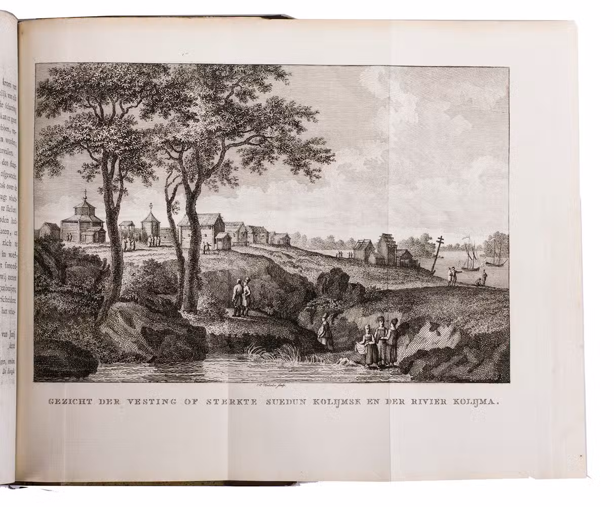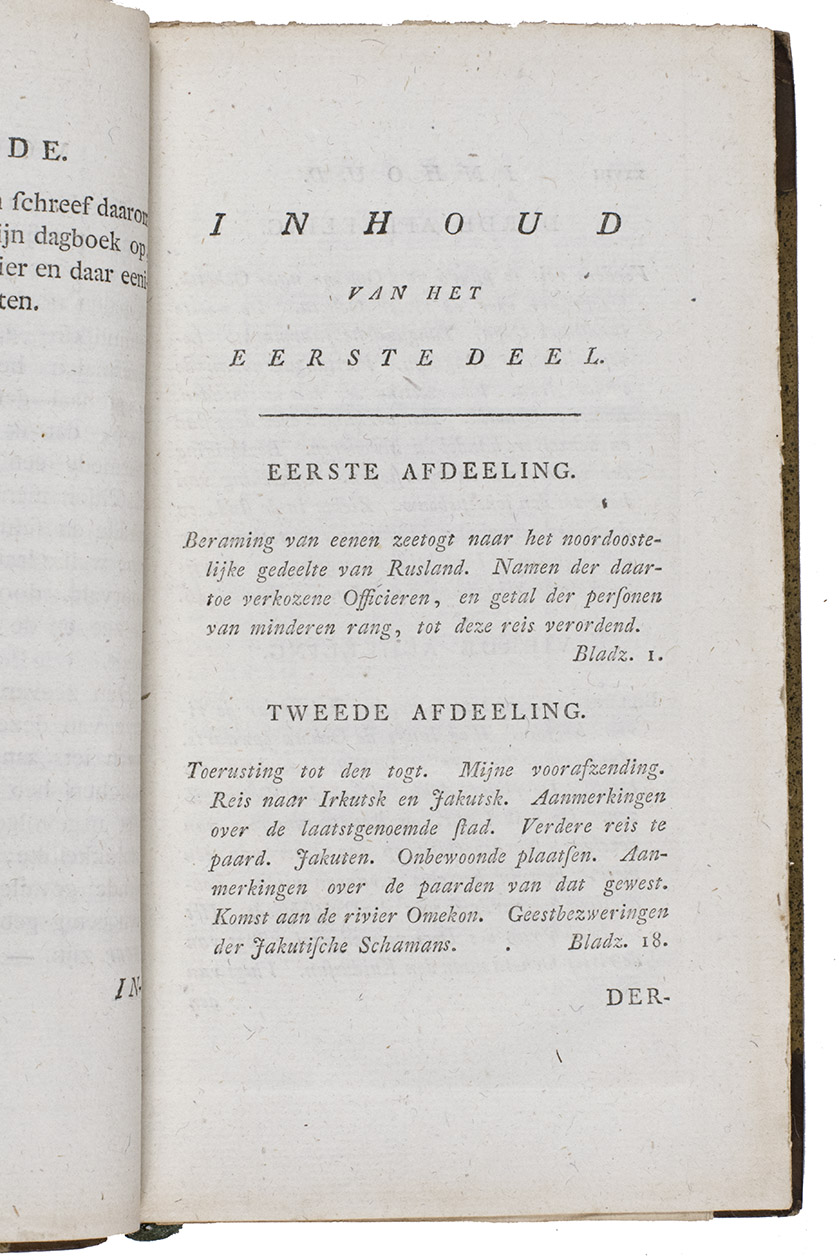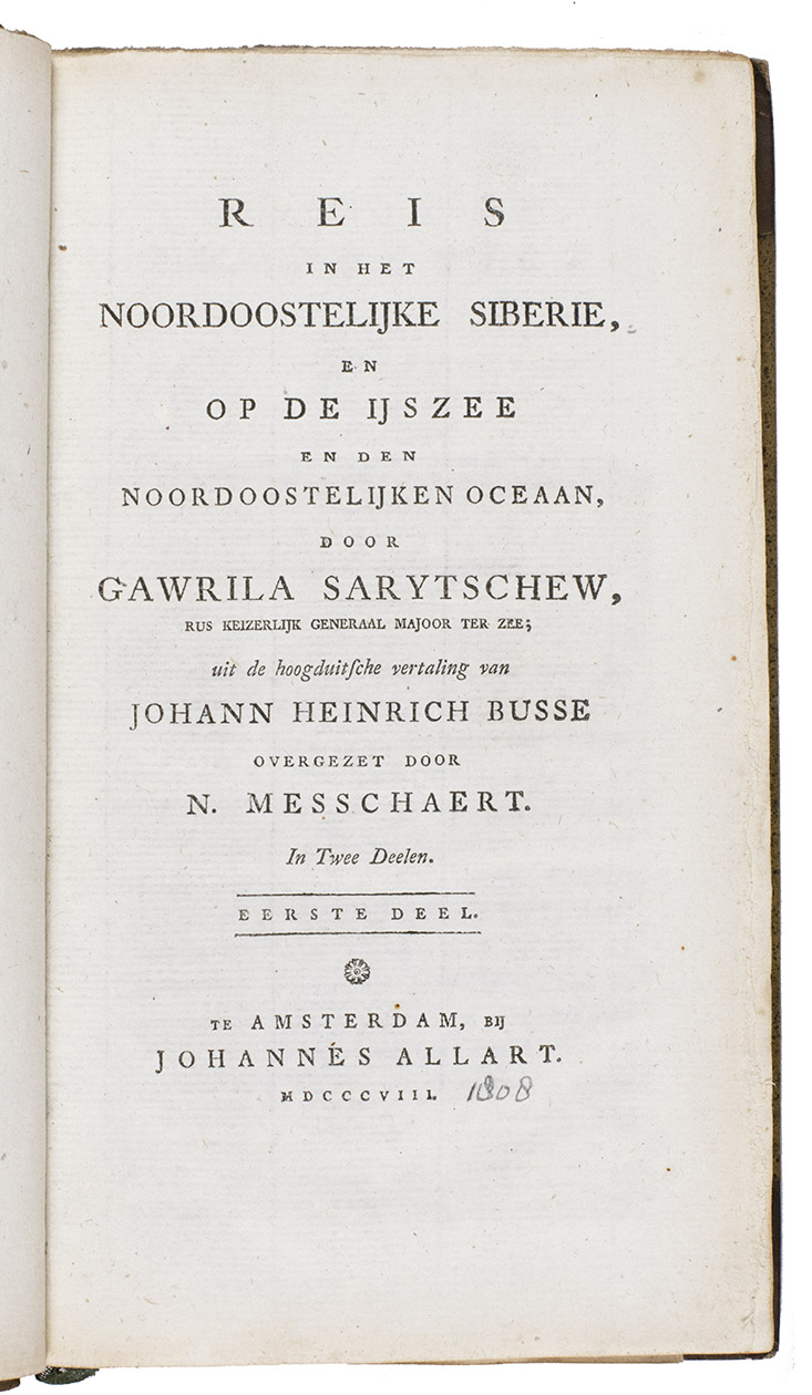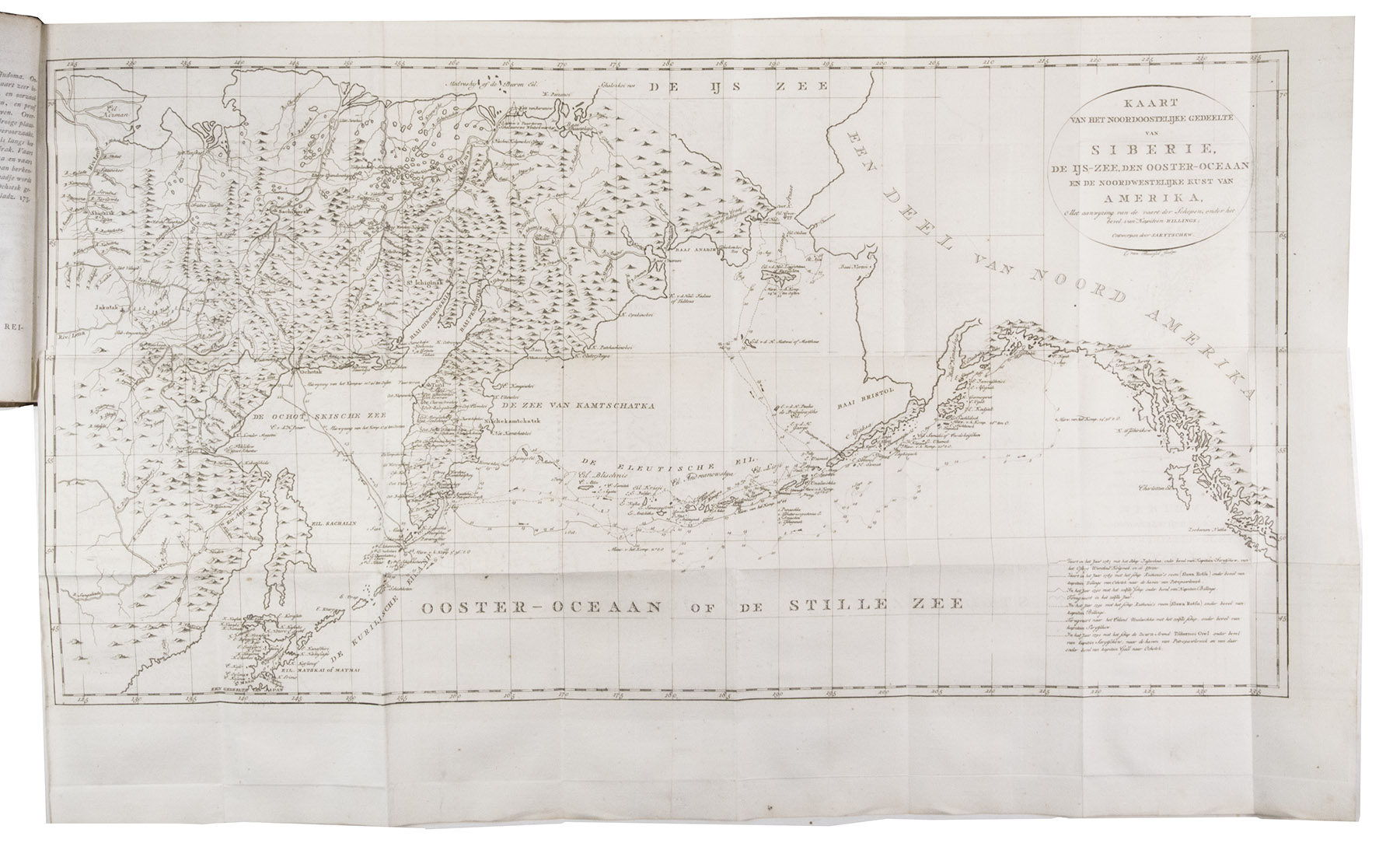First and only edition of the Dutch translation of Captain Sarychev's account of the Russian geographic and scientific expedition through eastern Siberia and the North Pacific (1785-1793) under the command of Joseph Billings. It's one of the fundamental and early books on the Aleutian Islands and particularly on Unalaska.