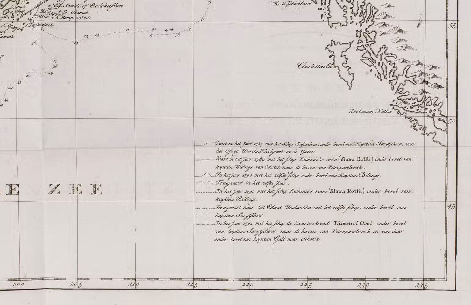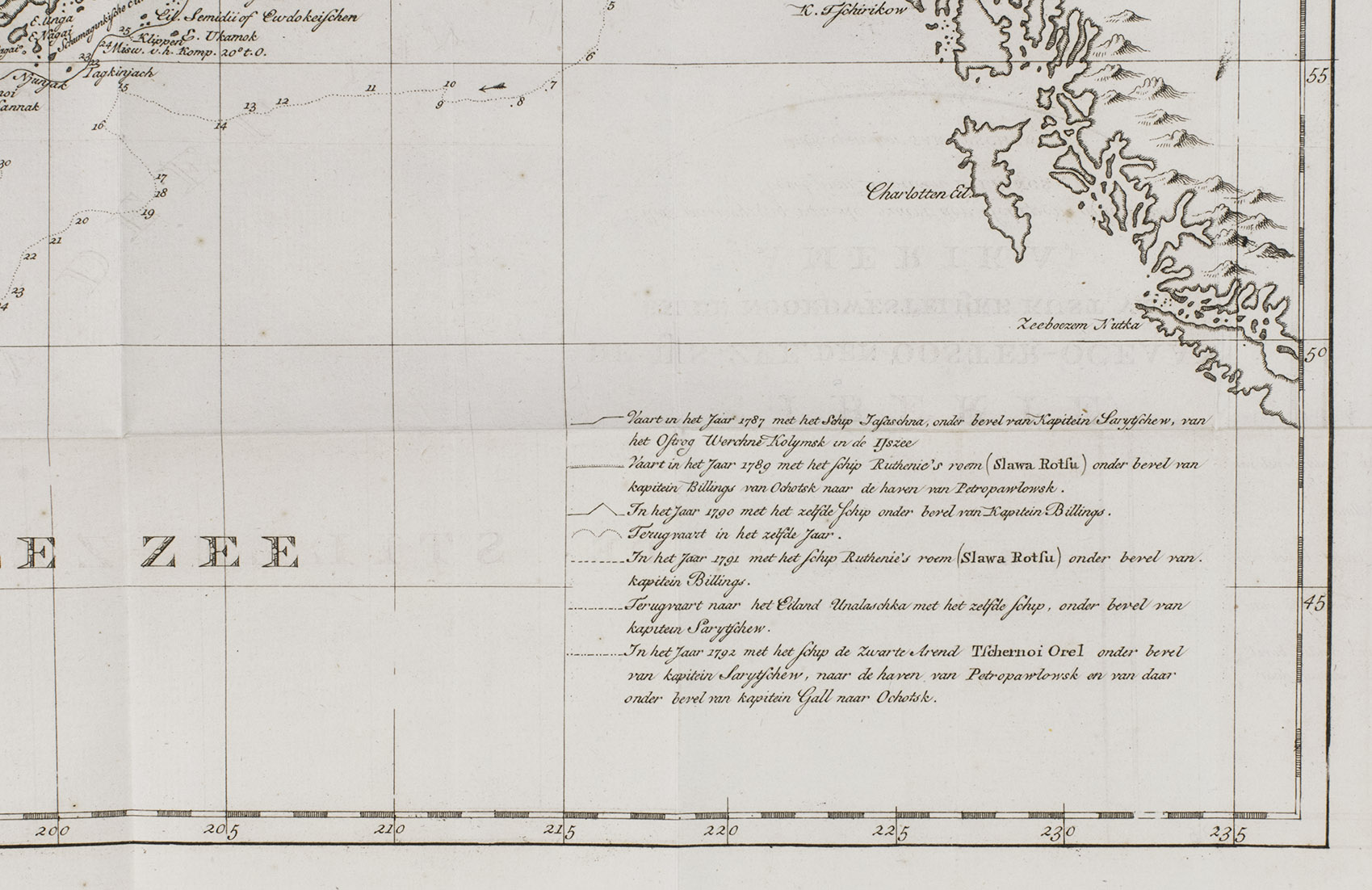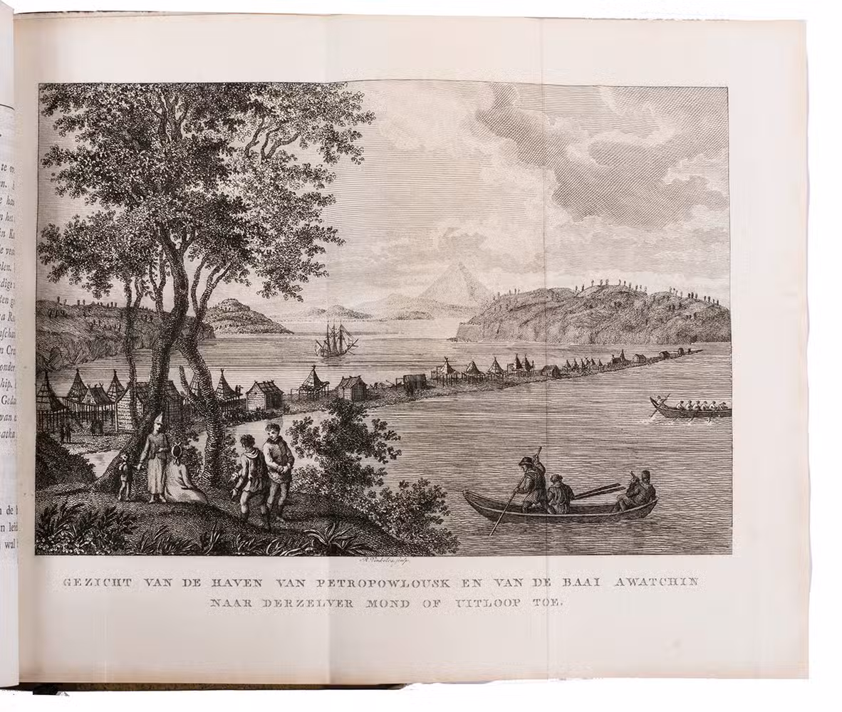 This Dutch edition was translated by Nicolaes Messchaert, from the German translation of Johann Heinrich Busse after the original Russian edition published in 1802. The Billings-Sarychev Expedition was Russia's reaction on the economic and political threat of Captain Cook's third voyage (1776-1780). Catherine II the Great almost immediately commissioned the expedition to the North Pacific under the command of Joseph Billings, an Englishman who accompanied Cook on his voyage.