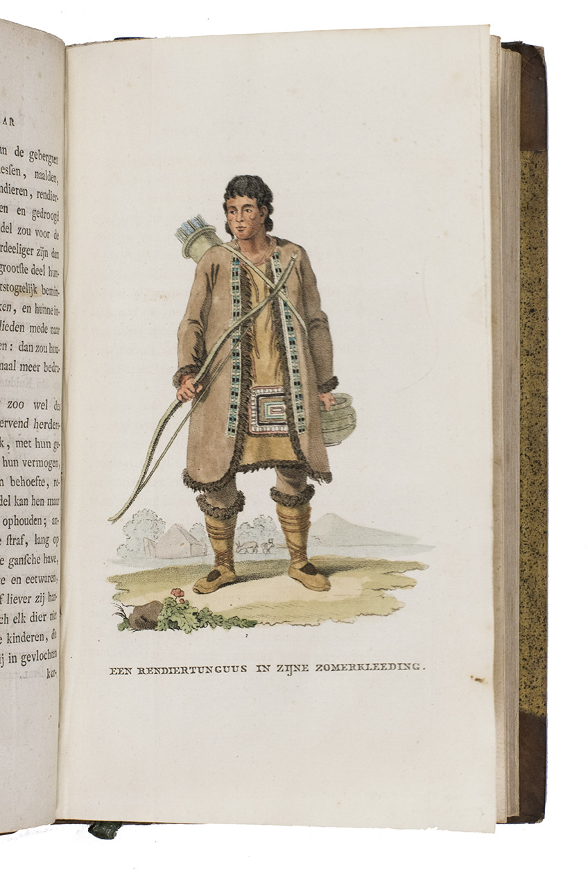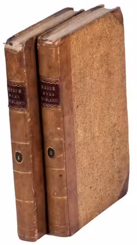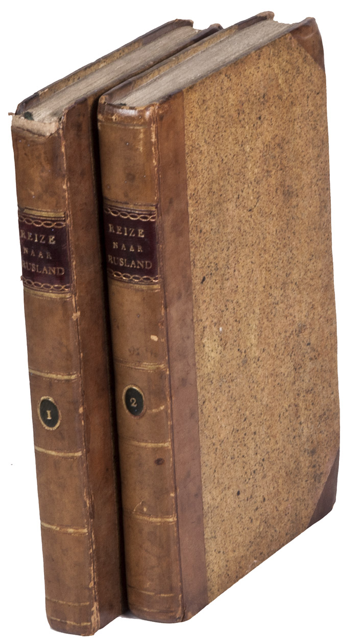 Amsterdam, Johannes Allart, 1808. 2 volumes. 8vo. With a large folding engraved map by C. van Baarsel after Sarychev, 10 engraved folding plates, 5 hand-coloured aquatint plates and a folding table. Contemporary half sheepskin. [2], XXII, 190; X [=VIII], 334 pp.