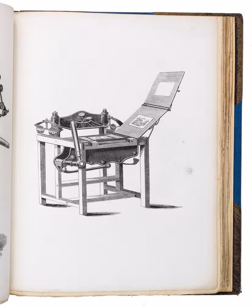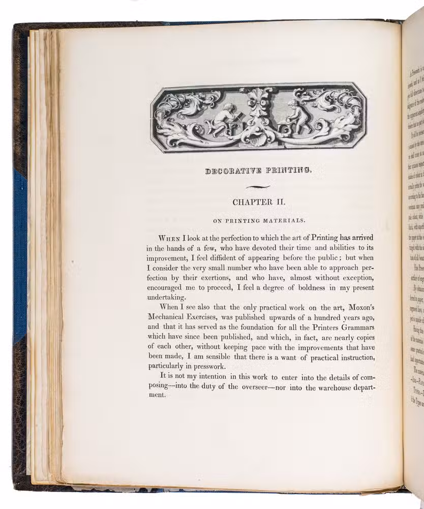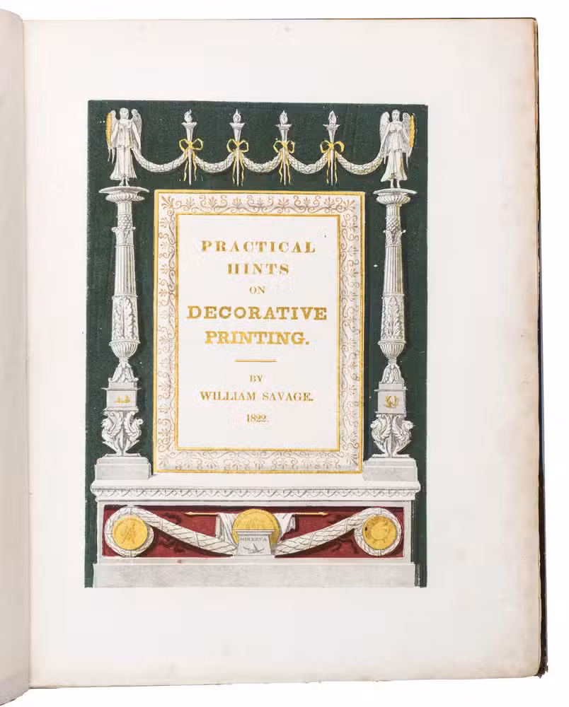 First and only edition of a beautiful, important and much sought practical manual of "decorative" printing (fine printing, colour printing, decorative ornament and illustration) compiled by the English printer and wood-engraver William Savage (1770-1843). It discusses printing presses, presswork (including the first clear and detailed description of make-ready), ink, types, paper and especially colour printing from multiple woodblocks, and is an essential reference for practicing fine printers, for the study of early 19th-century practice and for anyone with a practical, historical or bibliophile interest in colour printing. It is a pioneering work of colour printing, showing the author's latest experimental techniques and materials. The wood-engraved illustration plates, some from designs by A.W. Callcott, John Varley, John Thurston, (Thomas?) Willemont and W.H. Brooke, show a wide variety of subjects and demonstrate the effects that can be achieved with different colours.