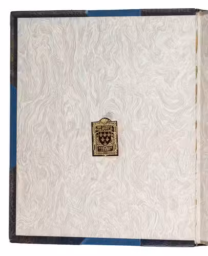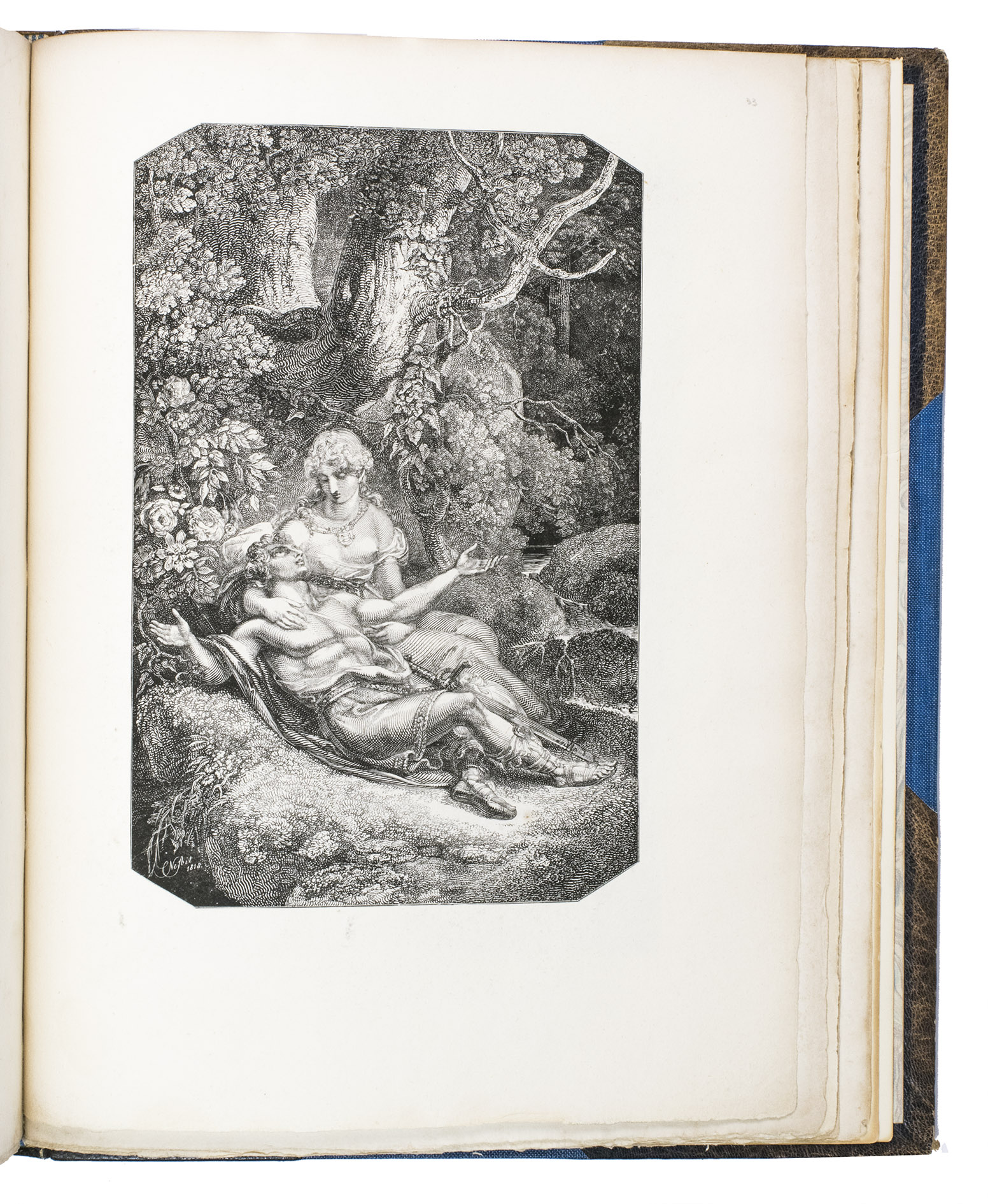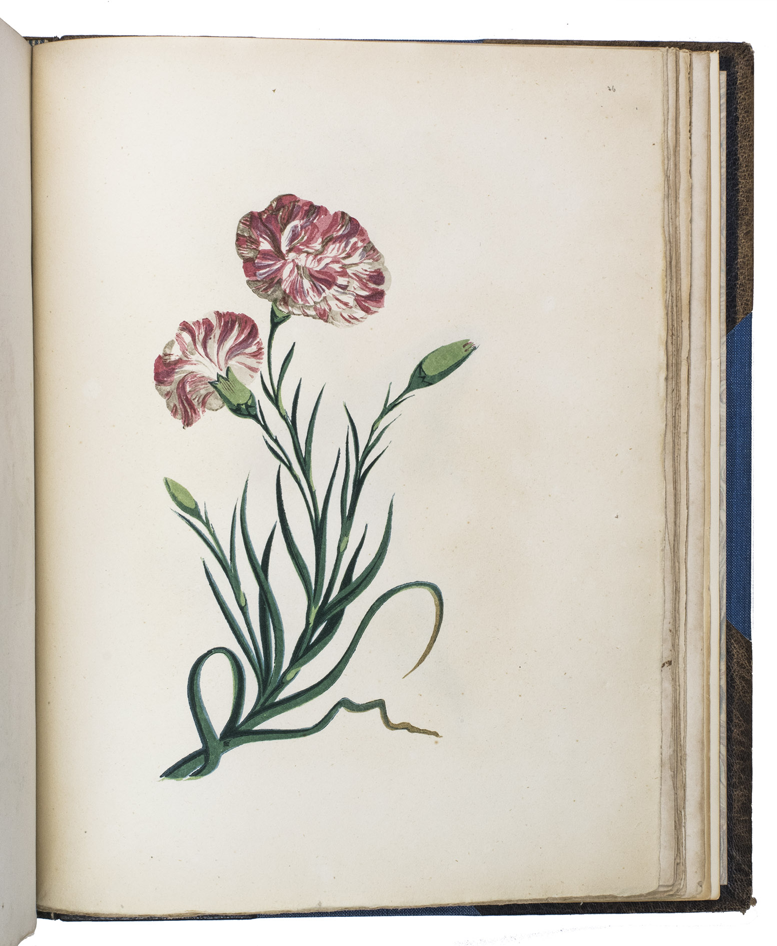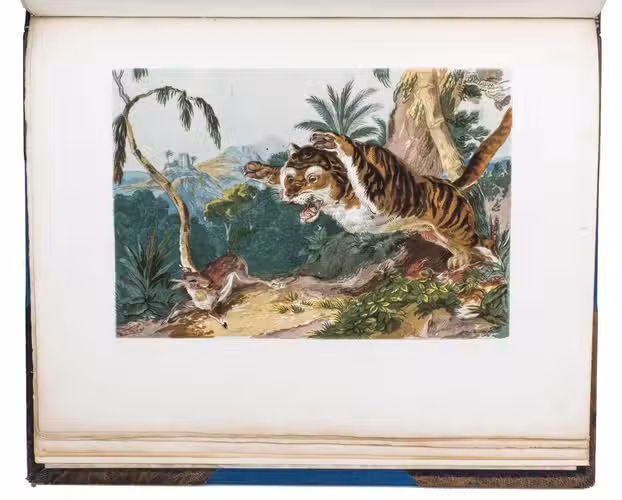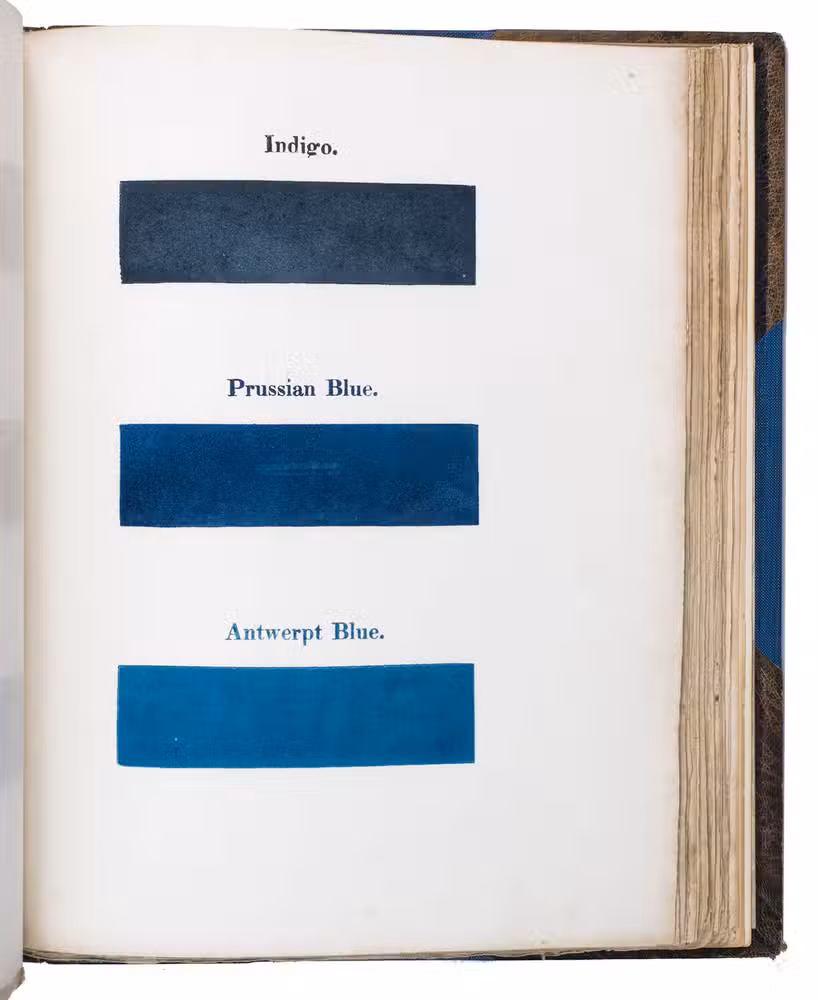 London, printed by the Type Press [and by John Johnson] and published for the proprietor by Longman, Hurst, Rees, Orme and Brown; Robert Triphook and 4 others, "1822" [= 1818-1823]. 2 parts in 1 volume. Large 4to (28 x 23 cm). With 2 colour-printed letterpress title-pages (one printed in gold), a colour-printed frontispiece and 34 other wood-engraved illustration plates, mostly printed in colour; 2 leaves of type specimens, 6 leaves showing 18 colour ink swatches, and 9 pages showing 9 of the woodblocks after they were defaced to make a reprint impossible. Dark blue half goatskin morocco (ca. 1950) by Banyan-Rivière in Bath, gold-tooled spine. Copy no. 58, signed by the author. [1], [1 blank], "vi" [= viii], 118 (lacking 101-102), [10] pp. plus the plates and the 1818 notice.