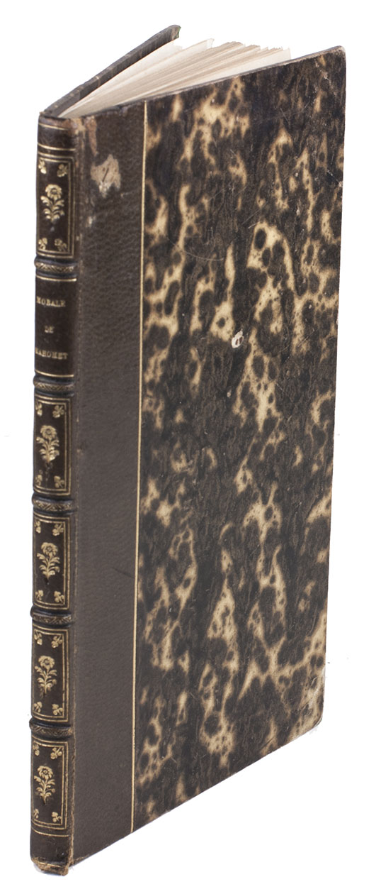 With booksellers ticket. In very good condition, and virtually untrimmed. First edition, in a bibliophile production, of a French summary of key concepts in Islamic religion, published not only in Paris, but also in Constantinople. Brunet V, col. 154; cf. Gay 3357 note (1883 Savary ed. of the Qu'ran).