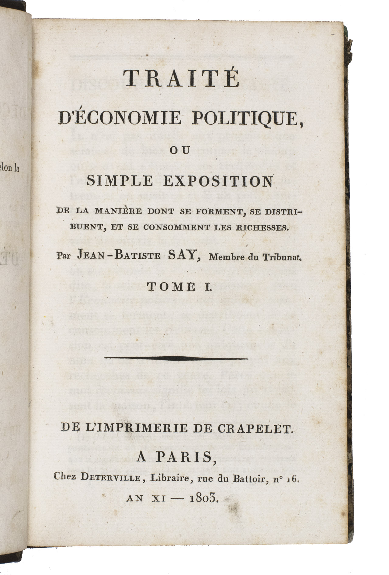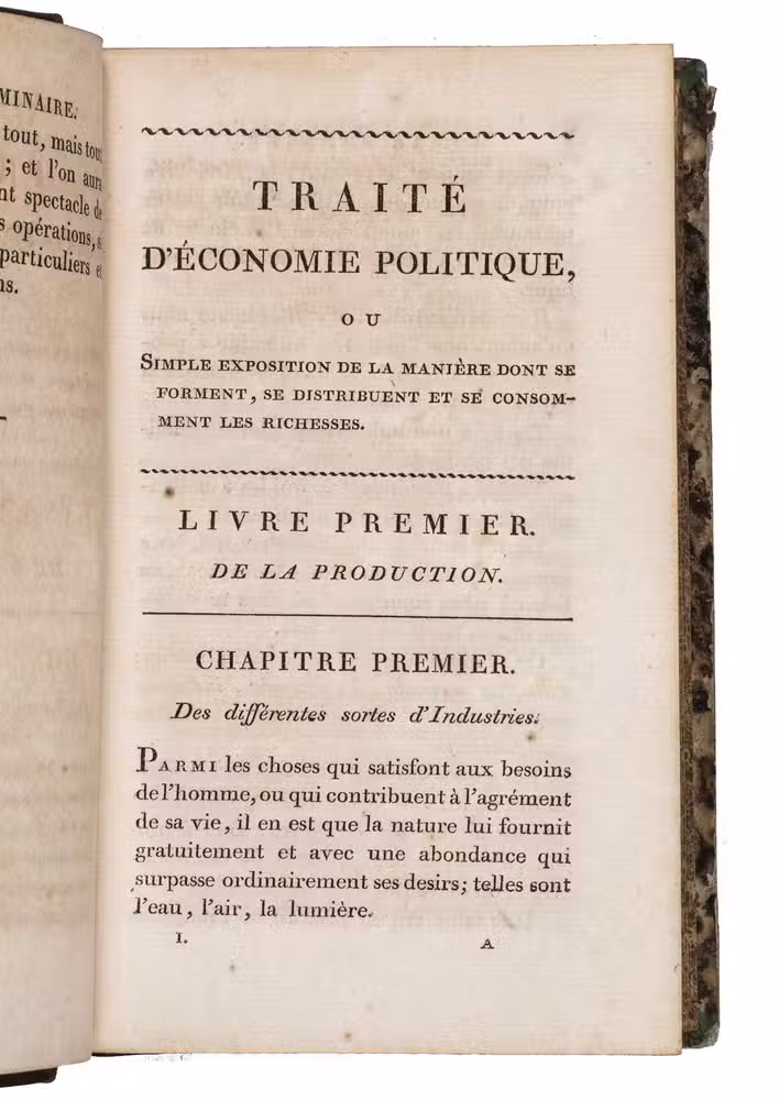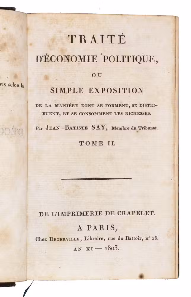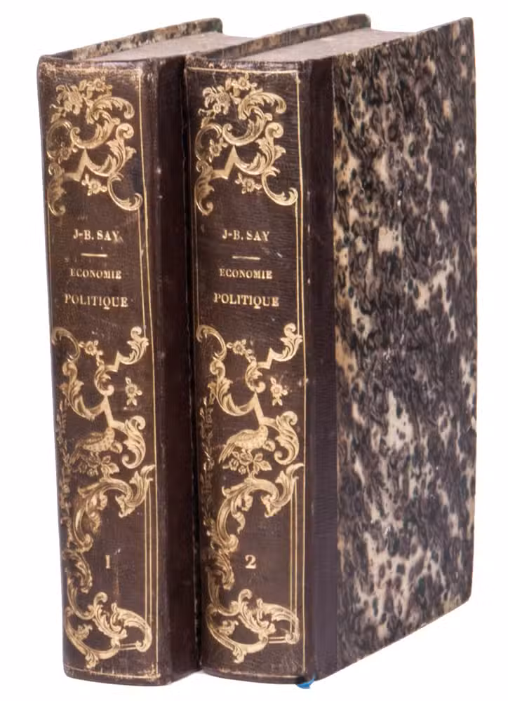 Rare first edition of a fundamental work on political economy, by the French economist Jean-Baptiste Say (1767-1832), who was among the first to divide the field of economics into the areas of production, distribution, and consumption. "Say is usually ranked with A. Smith and Ricardo amongst the fathers of economic science ... He was in the true sense of the word the leader of a school - of the liberal and optimistic school, the influence of which was so great in France ... and is even now felt. It is he, more than any other writer, who impressed on political economy the character of a natural science" (Palgrave).