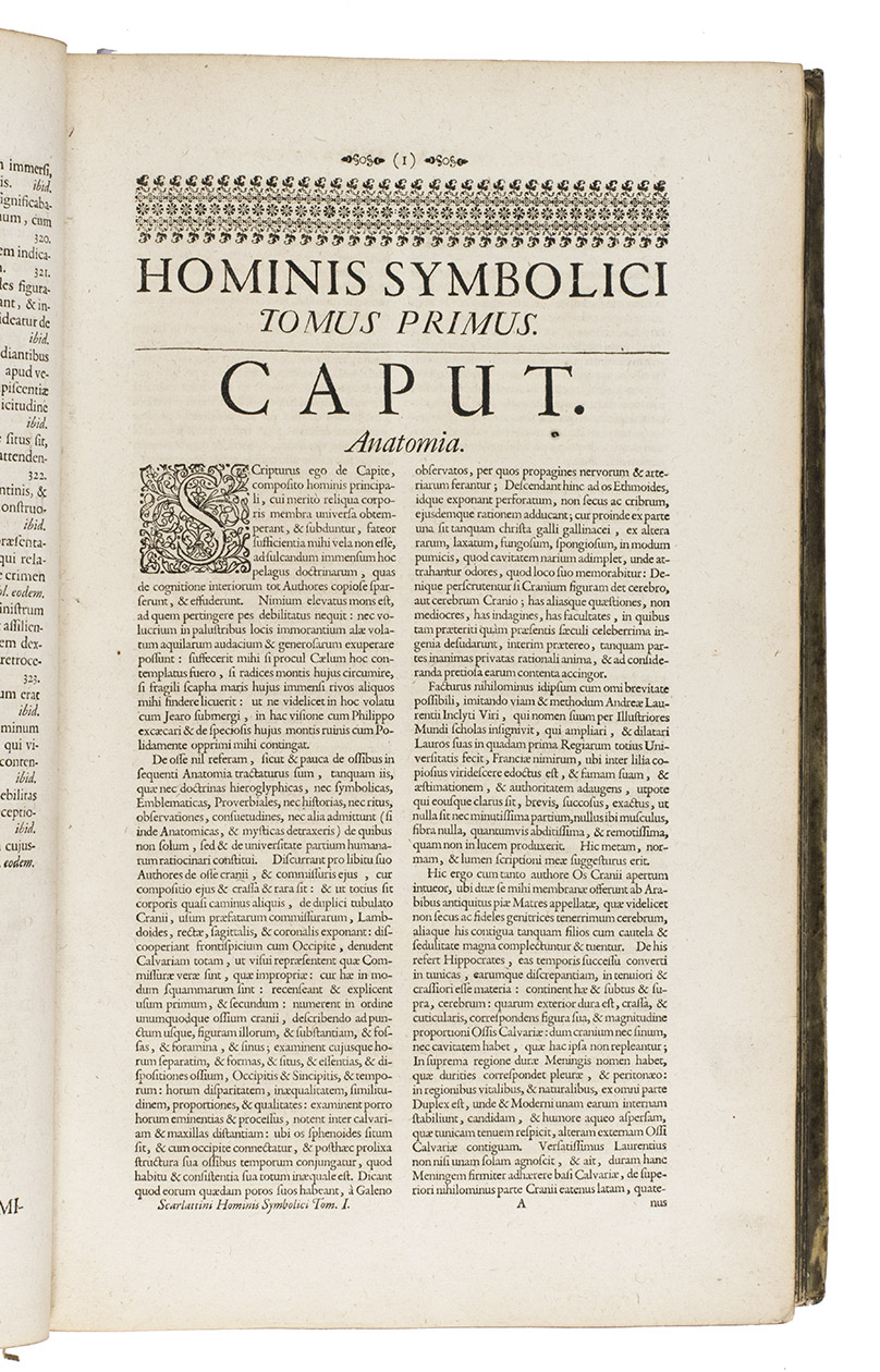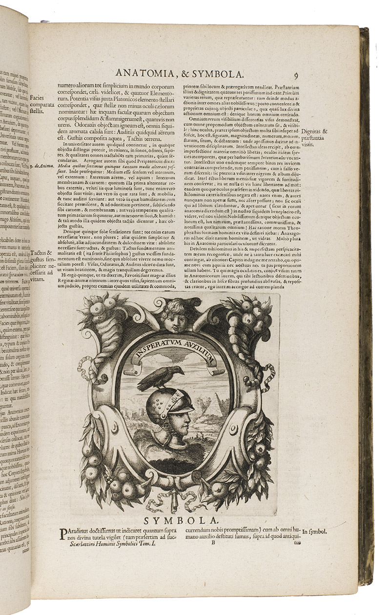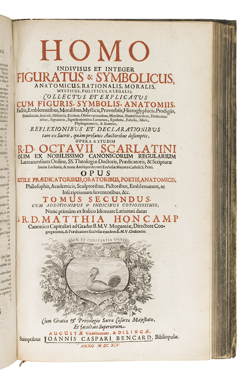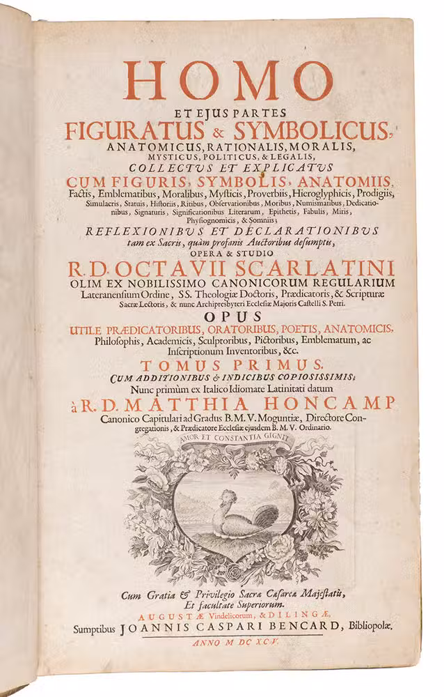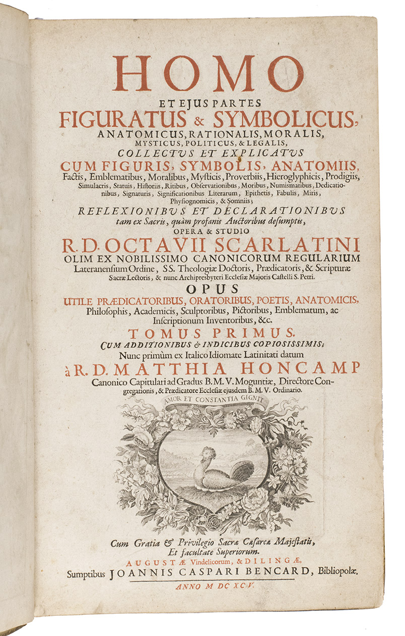 First and only Latin edition (translated by Matthias Honcamp) of a truly unique emblematic and philosophical work, originally published in Italian in 1684 as L'uomo e sue parti, figurato e simbolico, with 42 engraved emblems revolving around the human body and body parts. It describes and depicts the human body in its details and in its entirety in every aspect conceivable. The book also discusses magic, in the strict sense of the word, revealing many marvellous secrets, such as the occult properties of saliva, urine, sperm, etc.