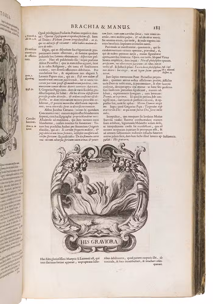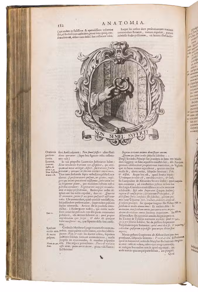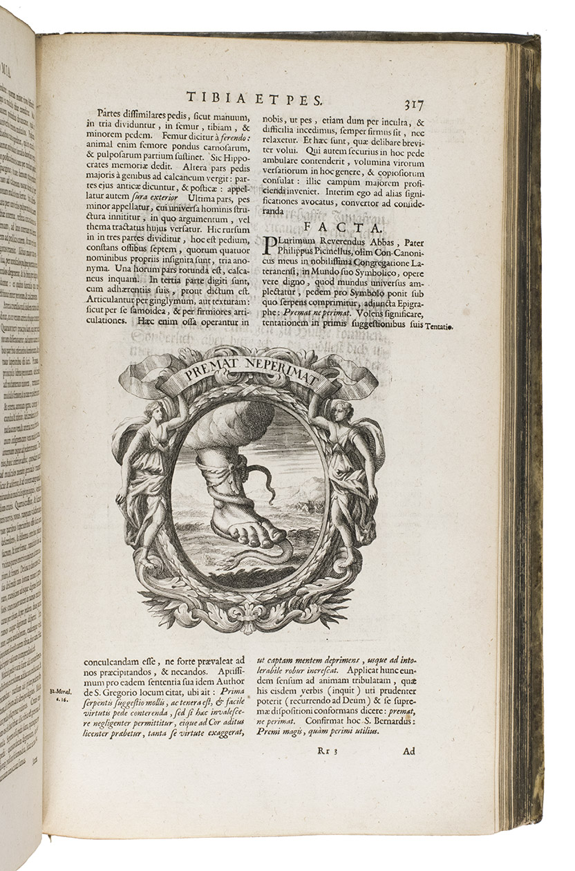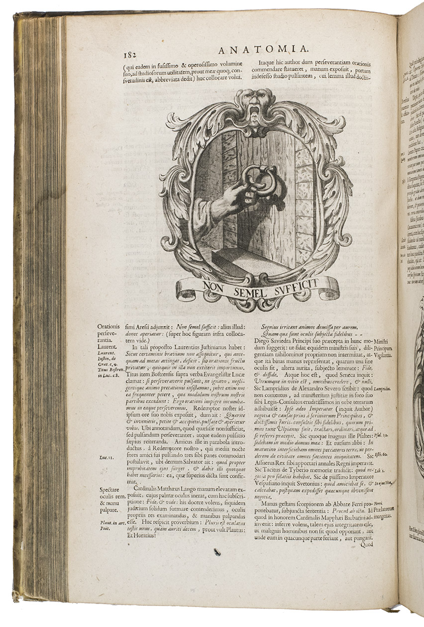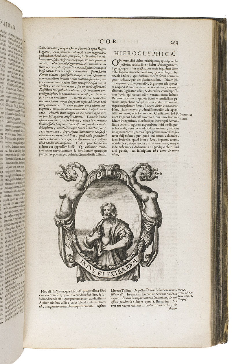 First and only Latin edition (translated by Matthias Honcamp) of a truly unique emblematic and philosophical work, originally published in Italian in 1684 as L'uomo e sue parti, figurato e simbolico, with 42 engraved emblems revolving around the human body and body parts. It describes and depicts the human body in its details and in its entirety in every aspect conceivable. The book also discusses magic, in the strict sense of the word, revealing many marvellous secrets, such as the occult properties of saliva, urine, sperm, etc.