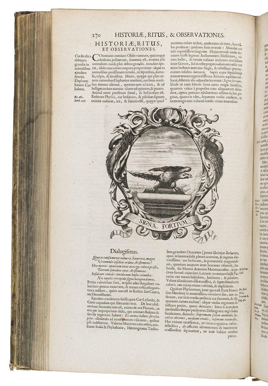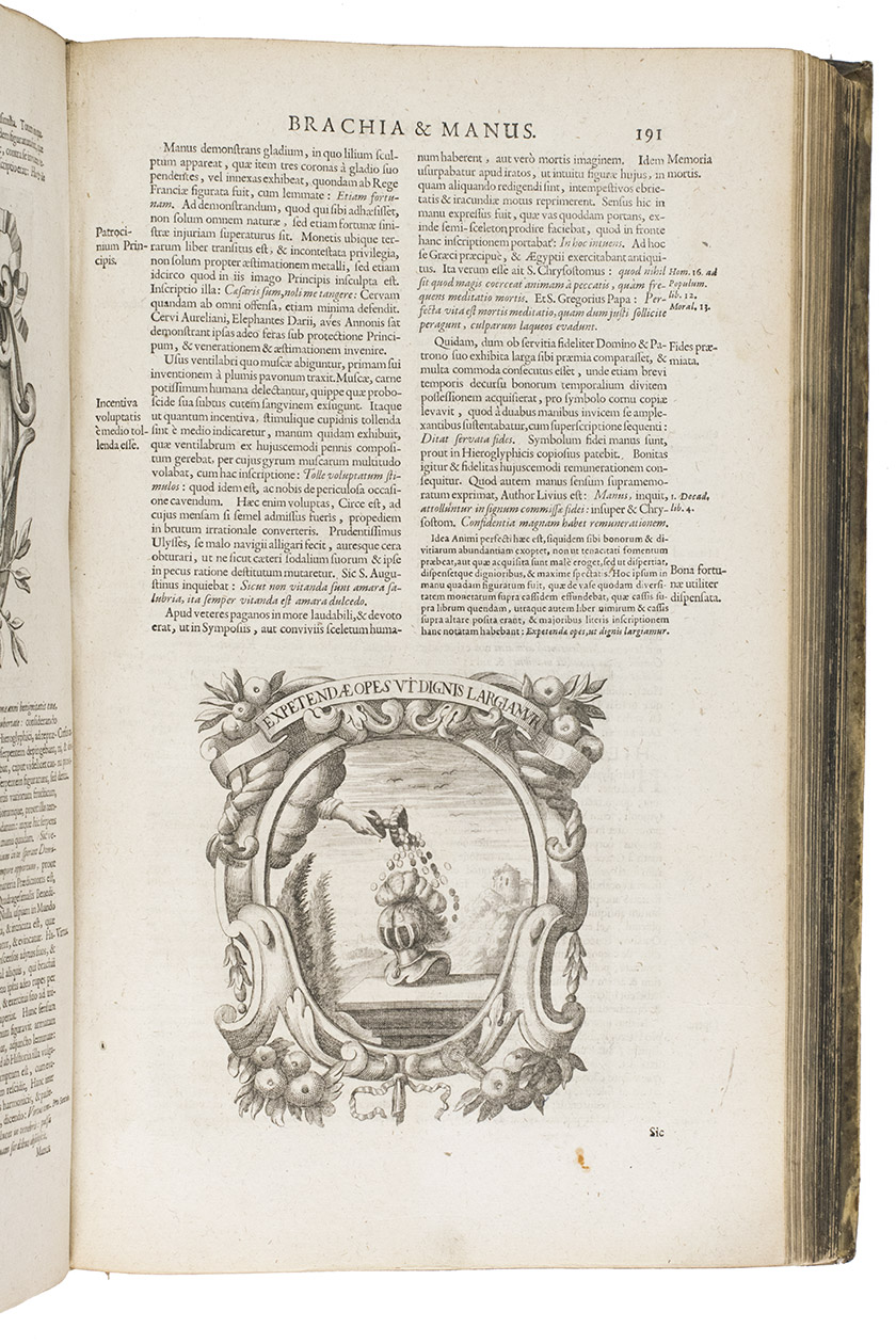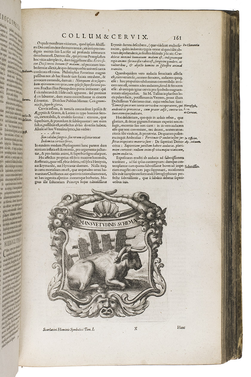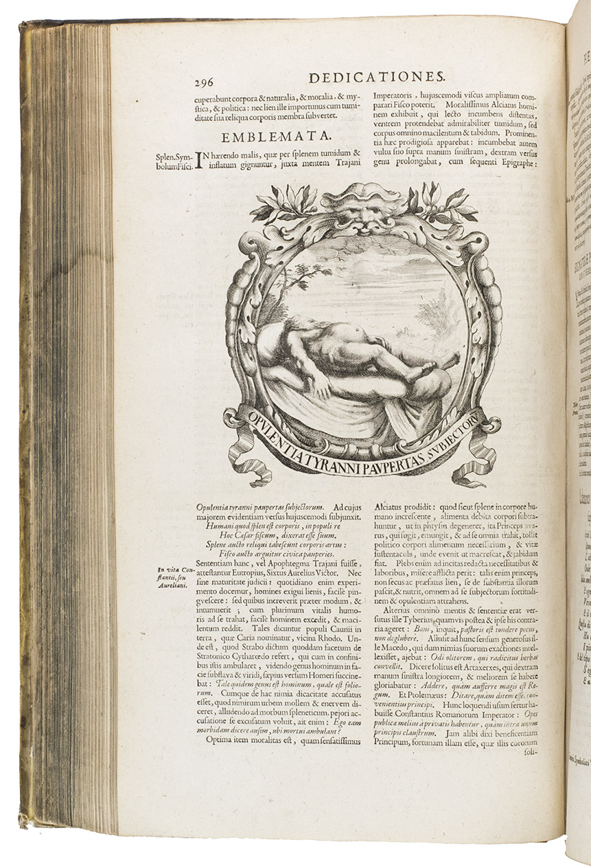 With a faint marginal water stain and a couple small rust spots in the paper, but otherwise in fine condition. The binding shows a few scratches, cuts and stains, small cracks at the head and foot of the hinges and 1 sewing support broken at the hinge, but is still in good condition. A fascinating emblem book for both text and imagery (some of it now also humorous), and an impressive piece of book production. Caillet 9948 ("unique in its genre"); Landwehr, German emblem books 530; Praz 490 note; R. Raybould, Emblemata 29.