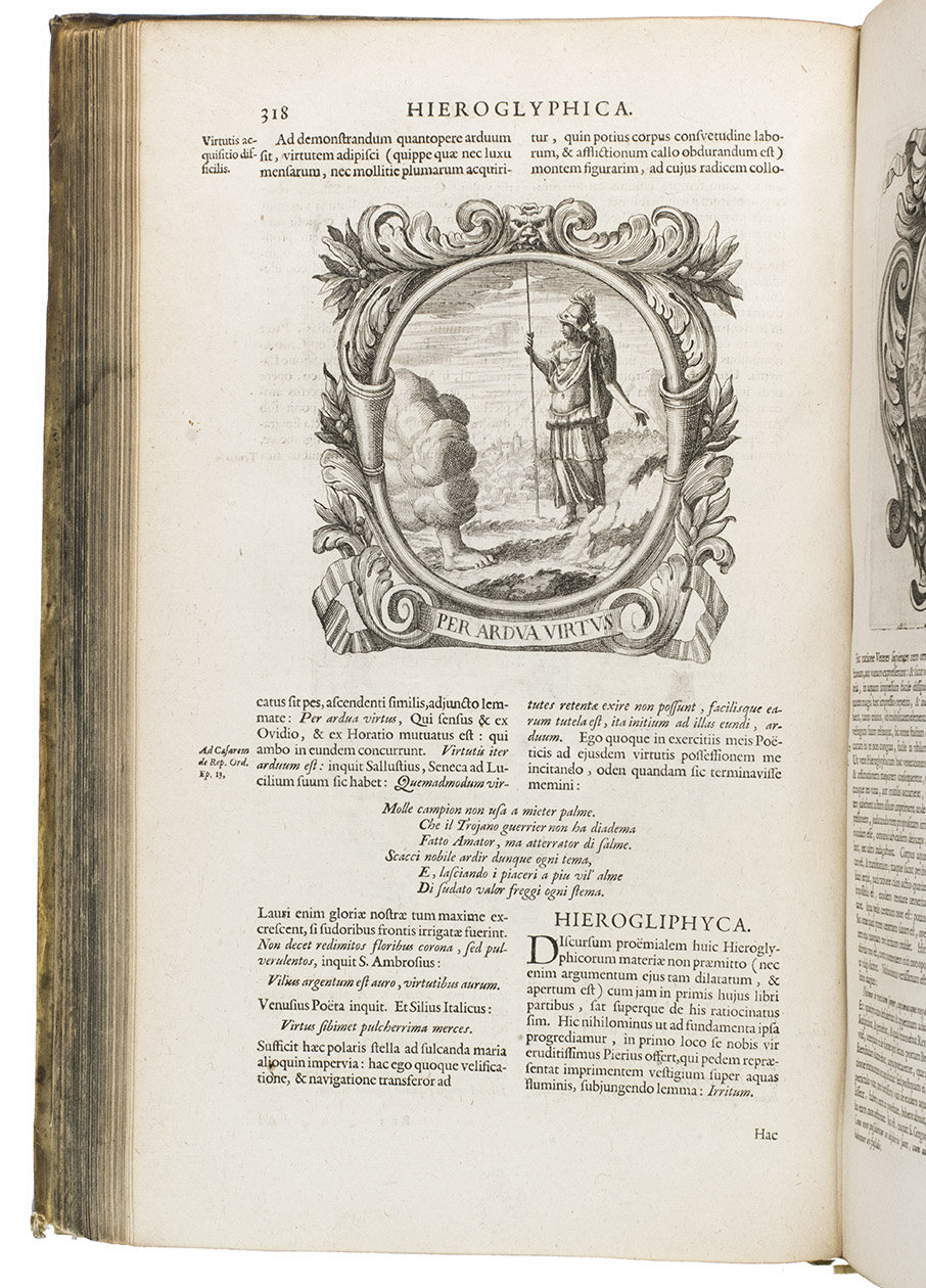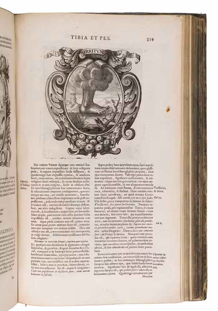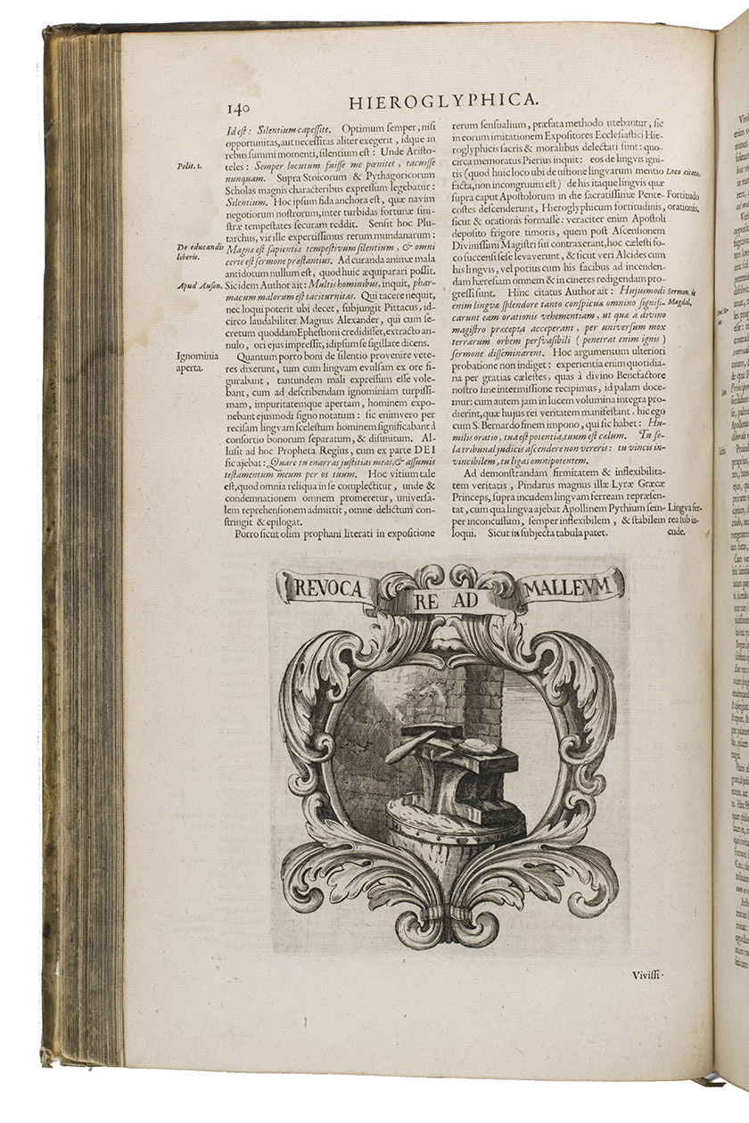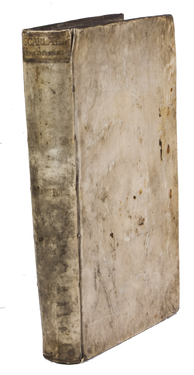 With a faint marginal water stain and a couple small rust spots in the paper, but otherwise in fine condition. The binding shows a few scratches, cuts and stains, small cracks at the head and foot of the hinges and 1 sewing support broken at the hinge, but is still in good condition. A fascinating emblem book for both text and imagery (some of it now also humorous), and an impressive piece of book production. Caillet 9948 ("unique in its genre"); Landwehr, German emblem books 530; Praz 490 note; R. Raybould, Emblemata 29.