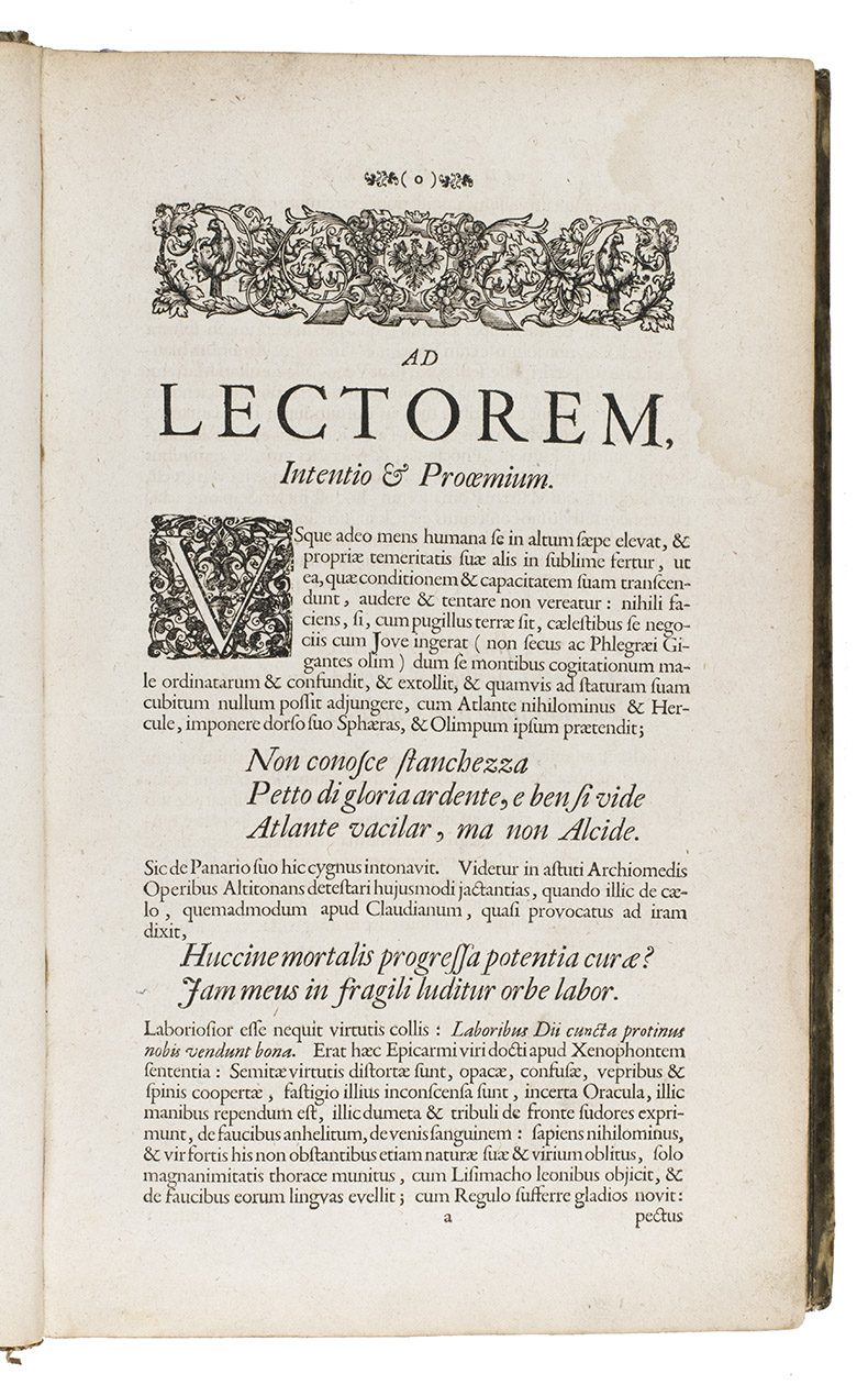 Augsburg & Dillingen, Johann Caspar Bencard, 1695. 2 volumes bound as 1. Large folio (37 x 23 cm). With a finely engraved emblematic frontispiece by the Augsburg engraver Leonhard Heckenauer (1655-1704), 2 title-pages with the same large engraved brooding chicken emblem and 42 engraved emblems in decorative cartouches in the text (plate size mostly 14 x 13 cm, but that on p. 232 of vol. 1 3.5 x 8.5 cm) perhaps also by Heckenauer. Contemporary vellum. [52], 342, [44]; [28], 249, [29] pp. including the frontispiece.